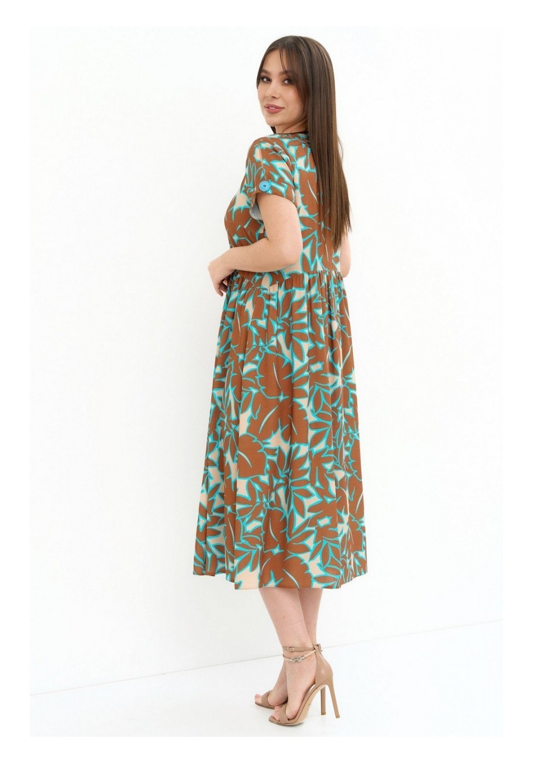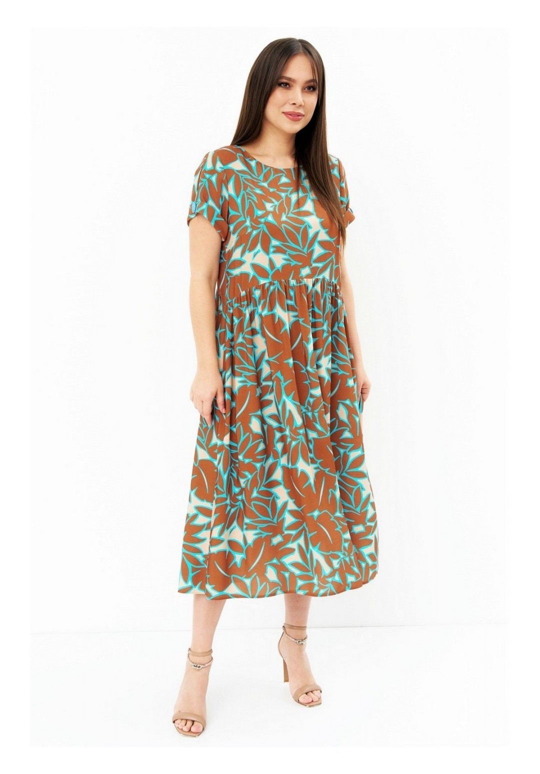 Нежное платье свободного кроя со слегка завышенной отрезной талией. Рукав втачной. Горловина округлой формы. Платье дополнено боковыми карманами. Длина платья от плечевого шва 120 см. Длина рукава 23 см
