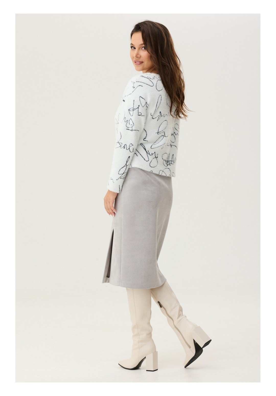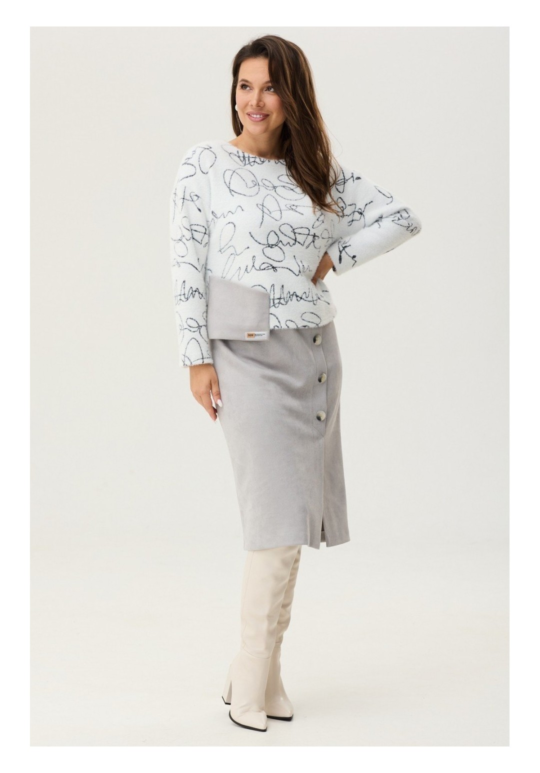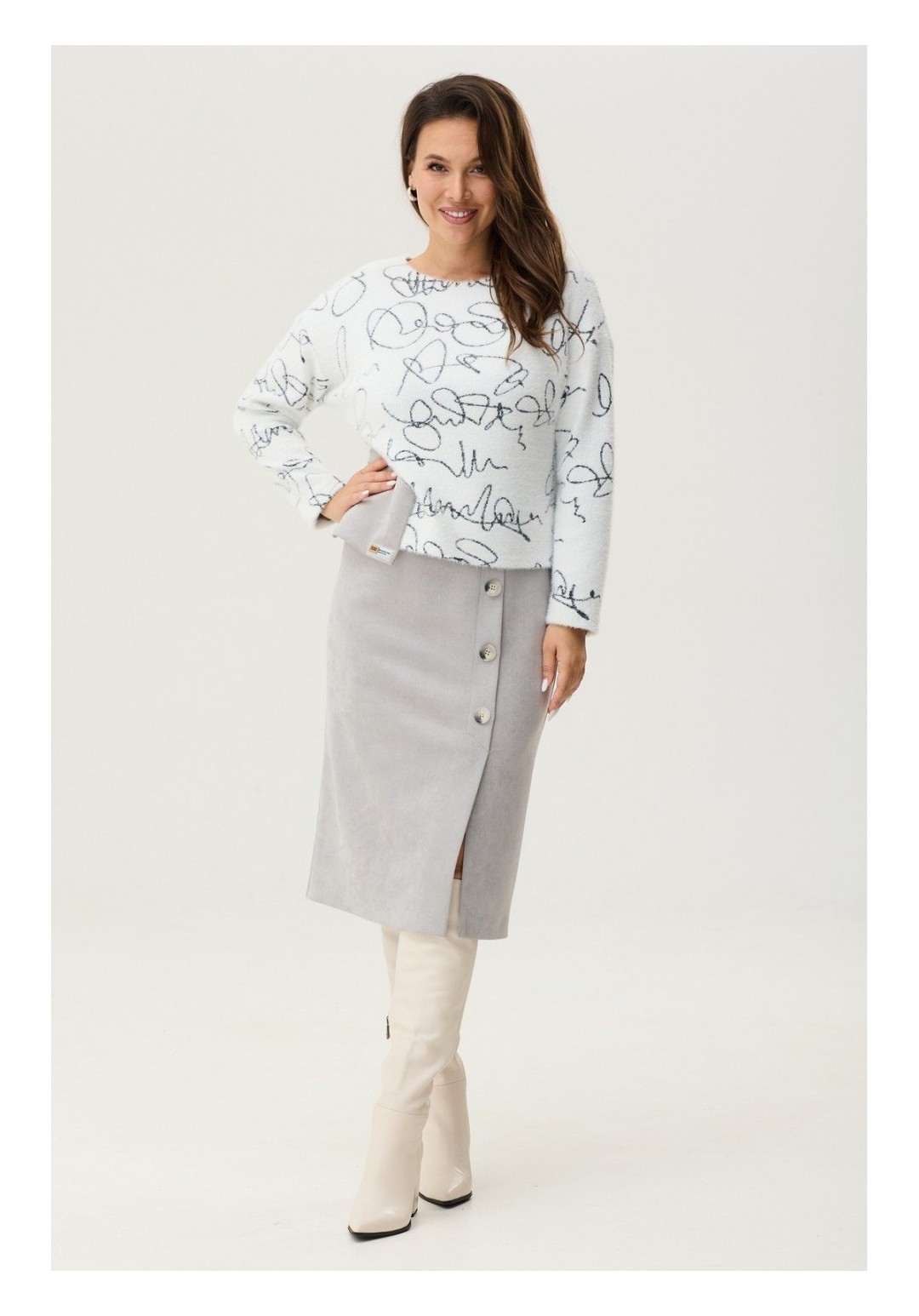 Элегантное платье свободного кроя. Выполнено как имитация блузы и юбки. Верх платья отлетной, выполнен из трикотажного полотна альпака. По спинке застежка на металлическую молнию. Низ платья выполнен из мягкой костюмной ткани. Платье дополнено накладным карманом с пришивным украшением. Длина от плечевого шва 119 см. Длина рукава 57 см.