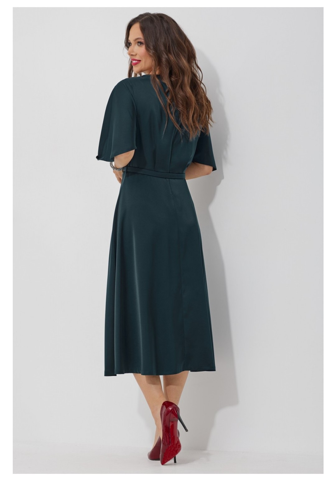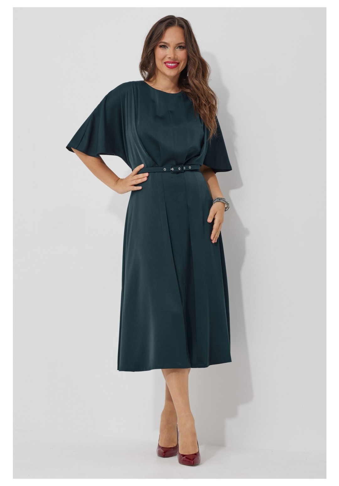 Элегантное платье А-образного силуэта. Выполнено из шелковистой ткани средней плотности с атласным блеском. Платье отрезное по талии. Верх платья свободный с цельнокроеным рукавом-крылышком. По плечам аккуратная драпировка. По спинке застежка на потайную молнию. Платье на подкладке. Длина платья от плечевого шва 126см Длина рукава 33см.