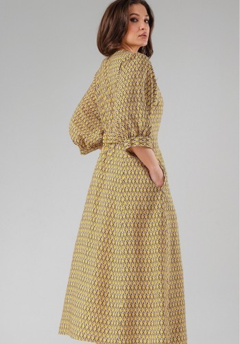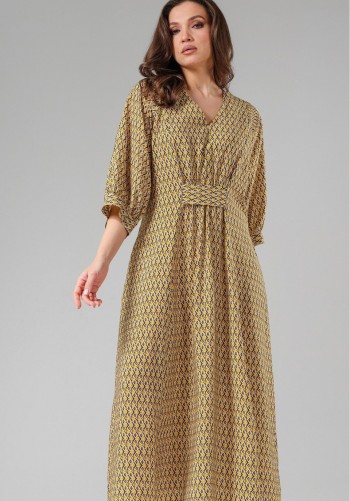 Стильное платье приталенного силуэта. Выполнено из хлопковой ткани. Рукав цельнокроеный, короткий. Горловина обработана отложным воротником. Центральная застежка выполнена с асимметрией, что придает платью уникальность. Низ платья расширен к низу. На талии оригинальная драпировка. Длина платья от плечевого шва 122 см. Длина рукава 15 см.