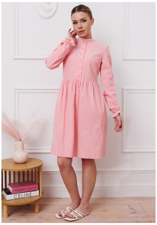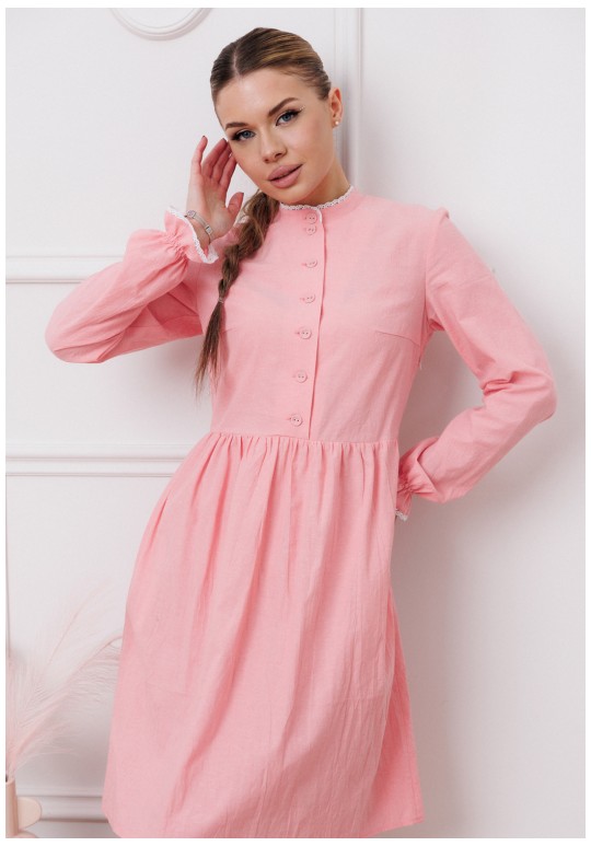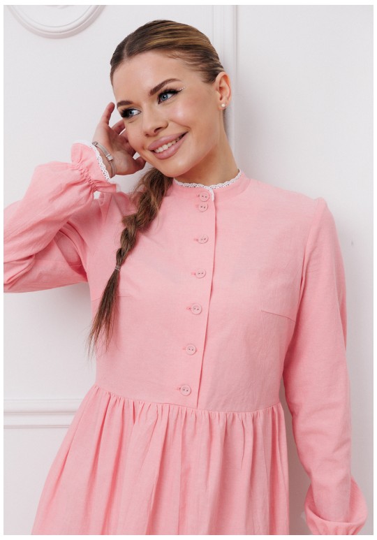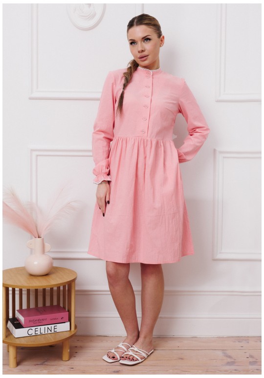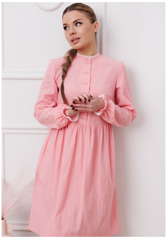 Притягательное платье умеренного объема приталенного силуэта, отрезное по талии, с эффектом мятости. Декоративная стойка и рукава на резинке, Молния с правой стороны, петли-пуговицы по переду. Длина по спинке - 96-98 см, длина рукава от плеча - 63 см. Ткань - вареный хлопок (называется так потому, что прошла обработку горячей водой). Благодаря энзимной стирке на ткани образуется легкий неравномерный крэш- эффект.