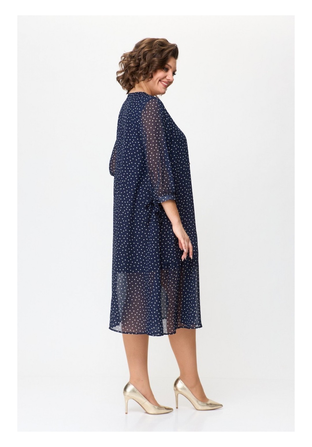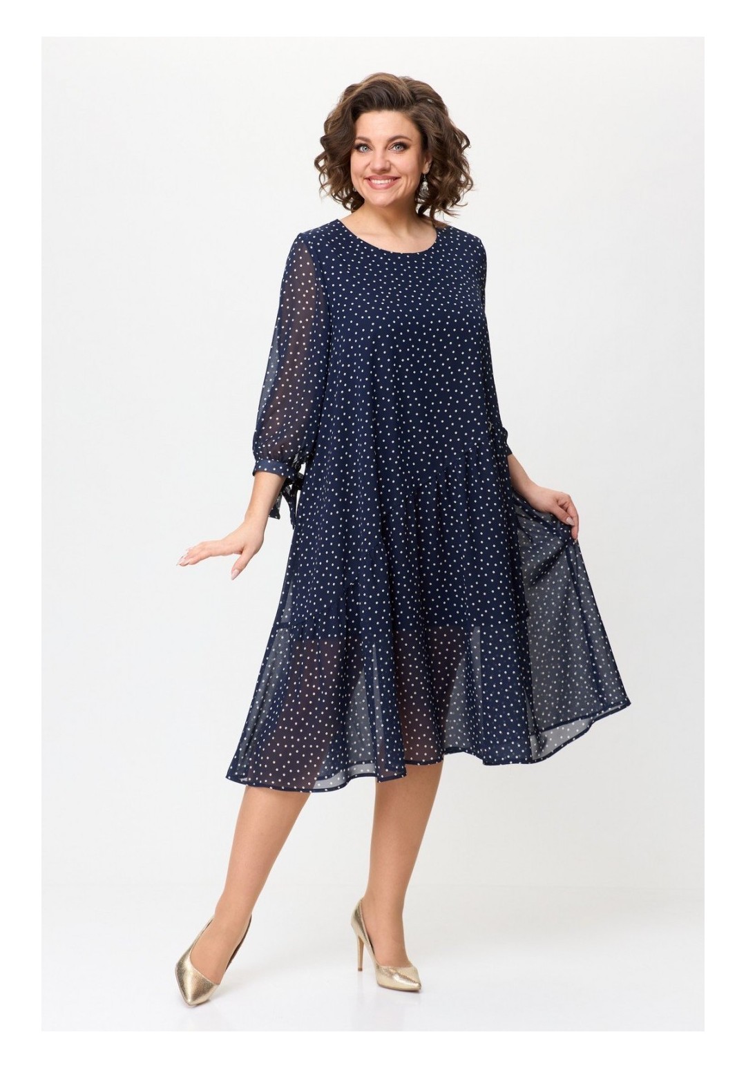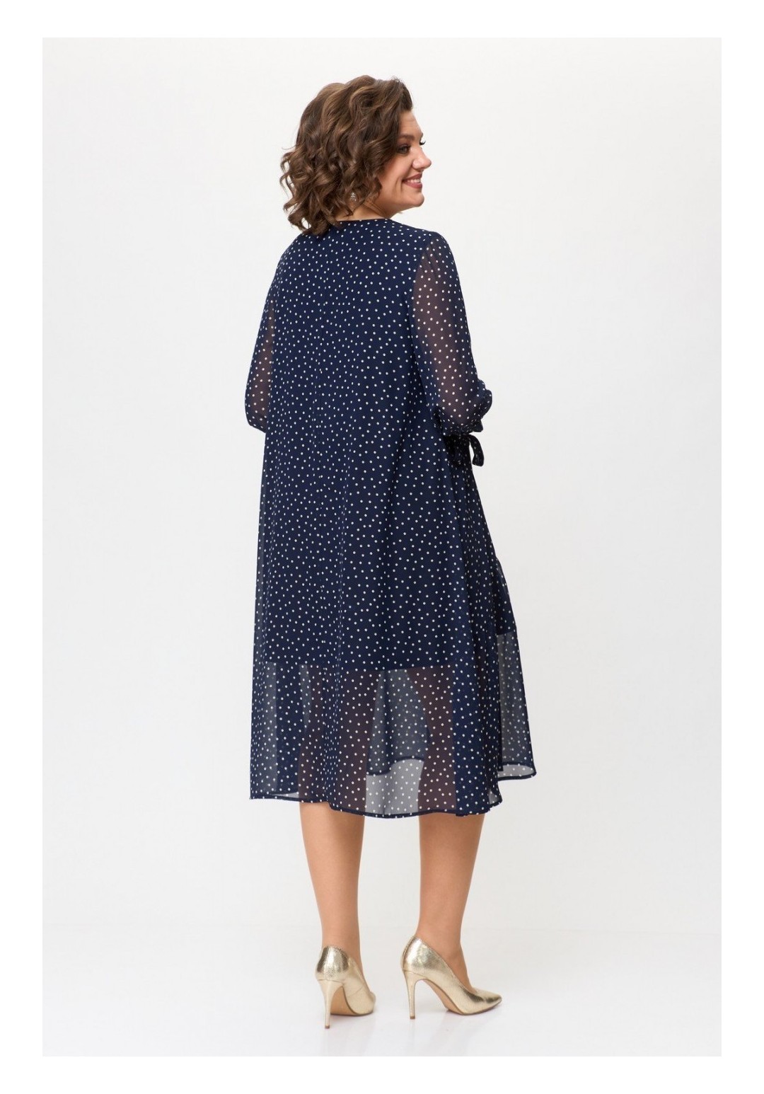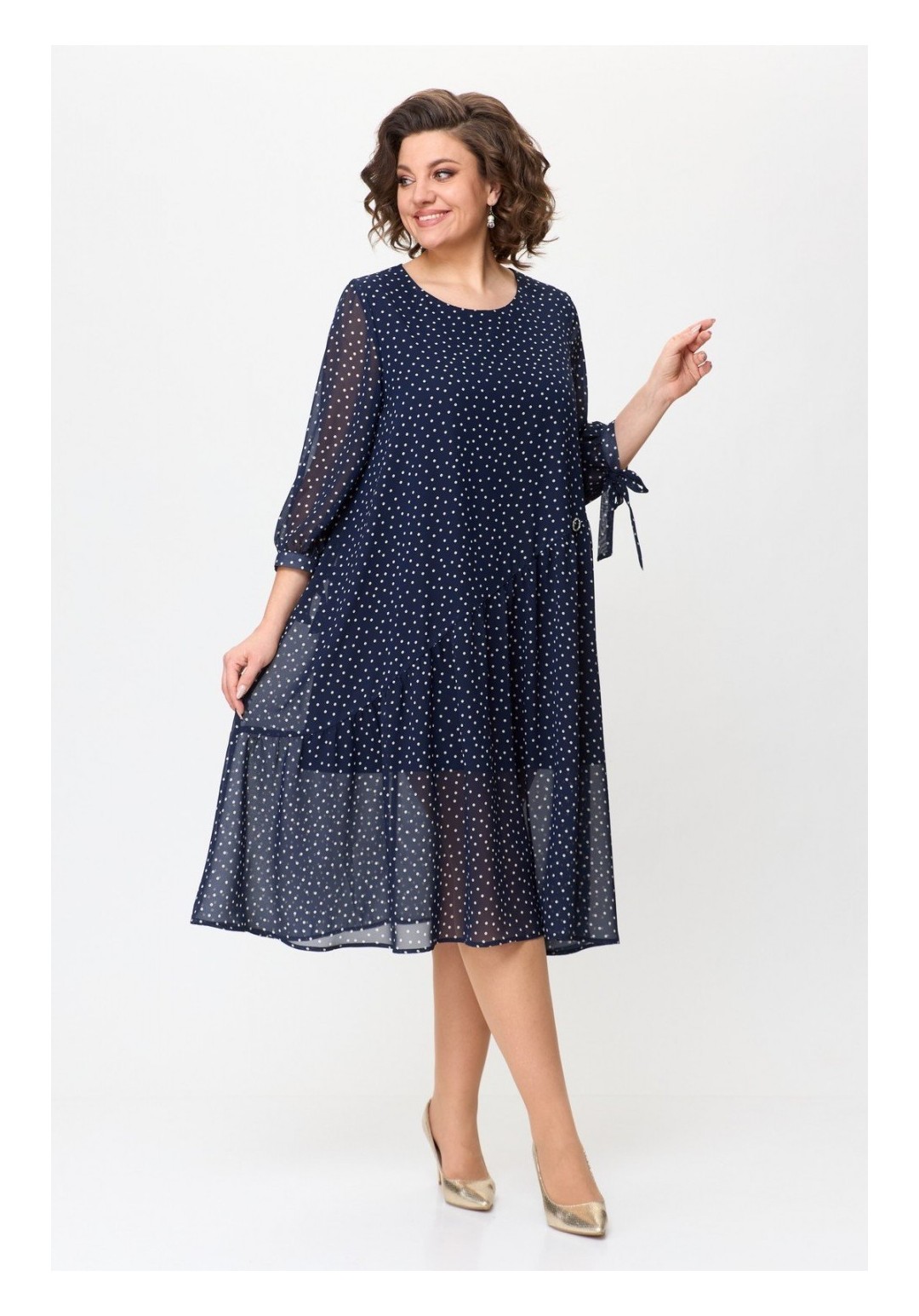 Нарядное двухслойное платье на облегченной подкладке — идеально подойдёт для любых торжеств. Интересная расцветка, легкий и струящийся шифон, а завязки на рукавах — сделают изделие еще более выразительным. Платье с округлой горловиной, длина ниже колена и трапециевидный крой — подчеркнут Ваши достоинства и не будет сковывать движения. По переду косой подрез и волан на сборке из-под него, украшено кольцом со стразами; спинка прямая. Платье прекрасно дополняется различными аксессуарами. Длина изделия 110 см (+-1 см), длина рукава 49 см. Изделие подойдет на рост 170 см.