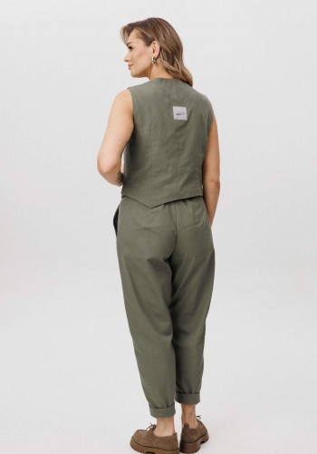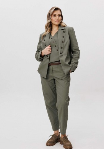 Платье полуприлегающего силуэта, отрезное по линии талии, застежка центральная (обработана притачной планкой) на петли-пуговицы. Лиф переда с фигурными рельефами. По линии талии в нижней части расположены складки. Лиф спинки с талиевыми вытачками, рукав одношовный втачной, слегка расклешенный. По нижней части спинки, рукава и по кокетке переда вставлена декоративная ткань с отделочной тесьмой. Воротник рубашечного типа с отрезной стойкой. По краю воротника и краю карманов настрочена декоративная тесьма. Платье на подкладке. Дополнением служит пояс.