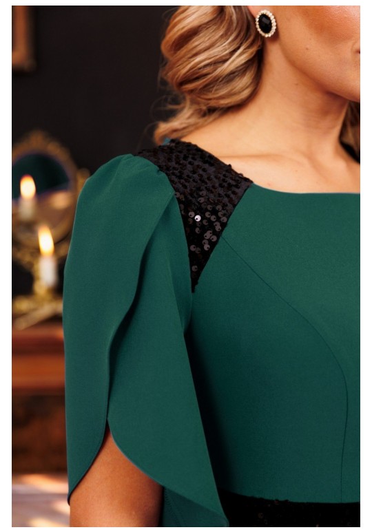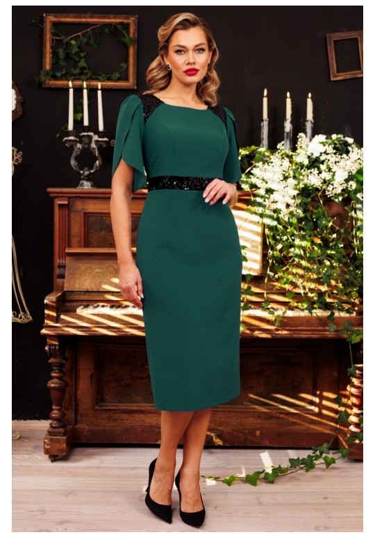 Одно из самых элегантных платьев в коллекции брэнда Мода-Юрс. Платье из однотонной ткани в сочетании с пайетками. Беспроигрышный вариант для торжественного случая. Платье полуприлегающего силуэта, отрезное по линии талии с рельефами по переду. Спинка с талиевыми вытачками и средним швом, в котором находится застежка молния. По переду платье с отрезными кокетками, которые выполнены из ткани в пайетки. Рукав, расширенный по окату со сборкой. Платье на подкладке. Длина рукава : 27 см длина платья: 116 см