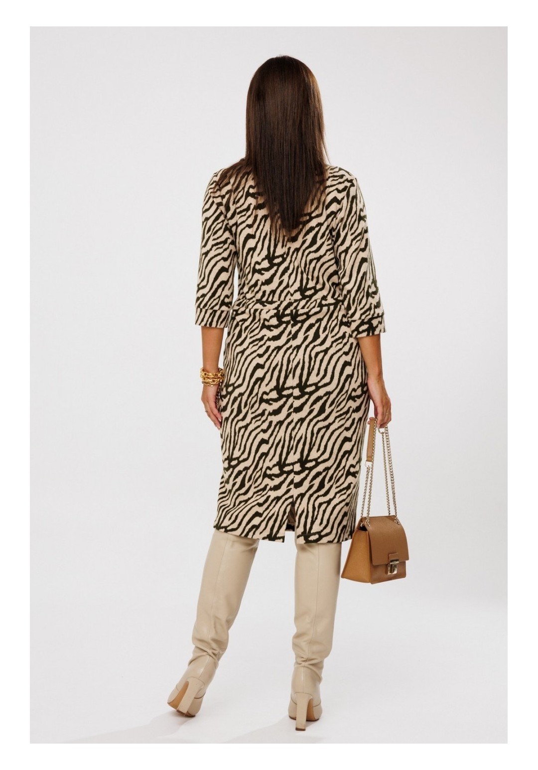 Платье женское полуприлегающего силуэта, выполненное из мягкого трикотажного полотна (тянется) с принтом Зебра. Платье отрезное по линии талии с настрочной кулисой и отделочным шнуром. Спинка со средним швом и разрезом в нижней части. Рукава втачные, одношовные с притачной манжетой. Горловина по переду – фигурное Каре, по спинке – округлая. Отделочный шнур декорирован металлическими наконечниками. Платье без подкладки.