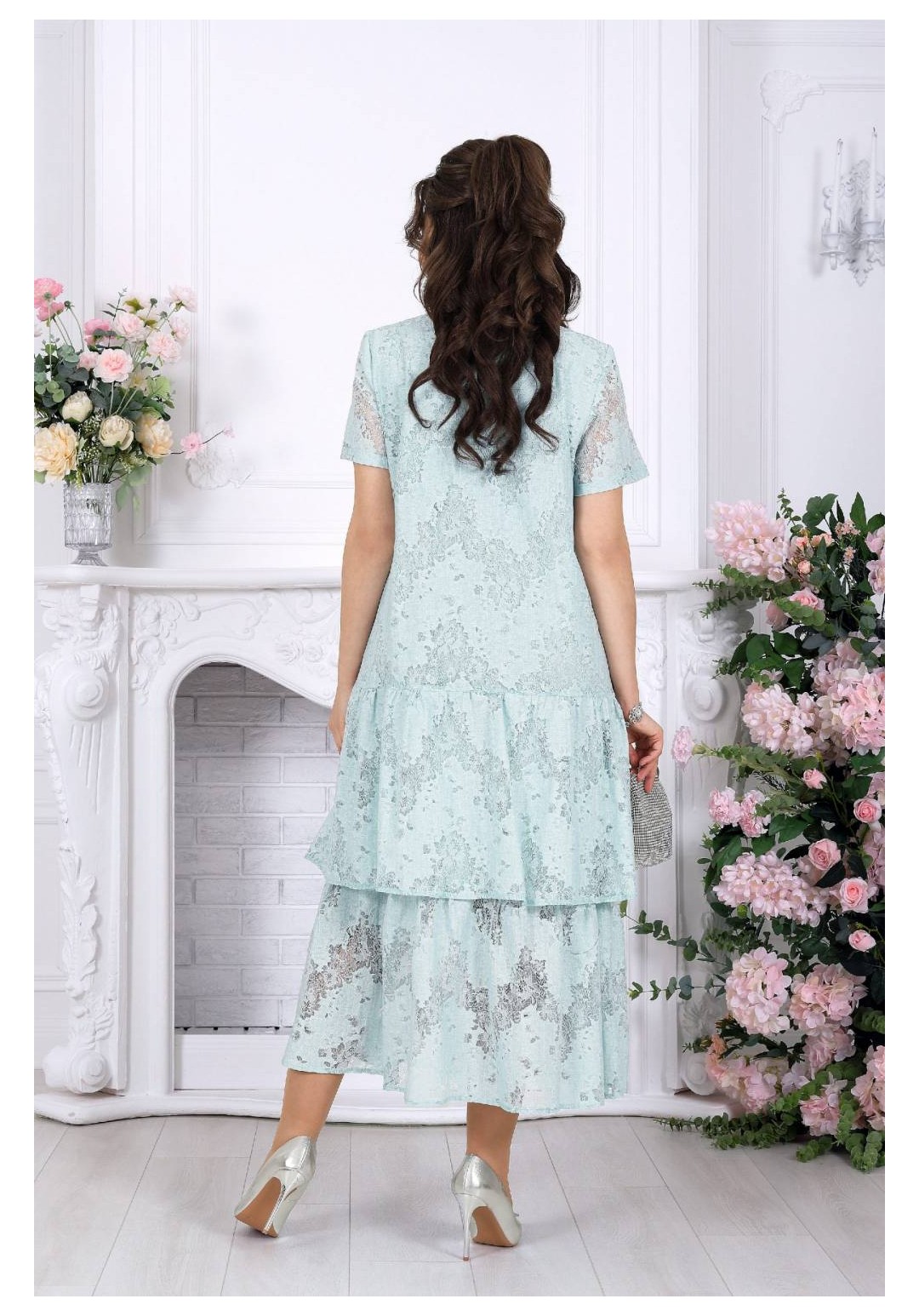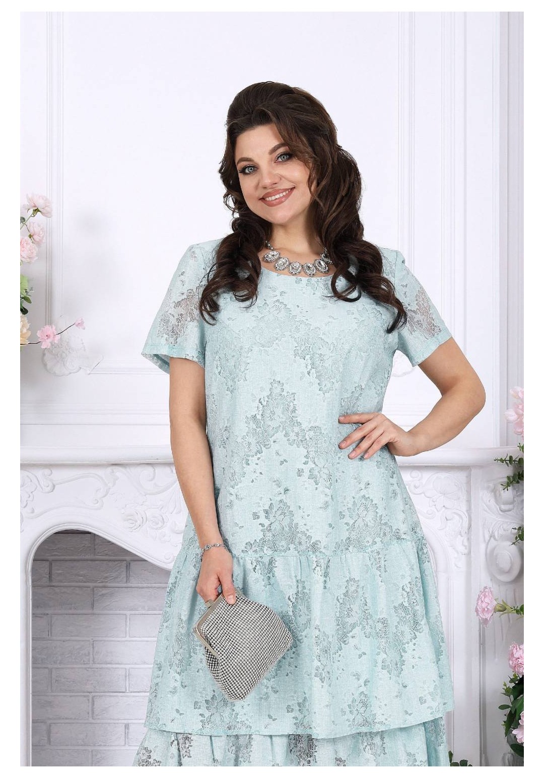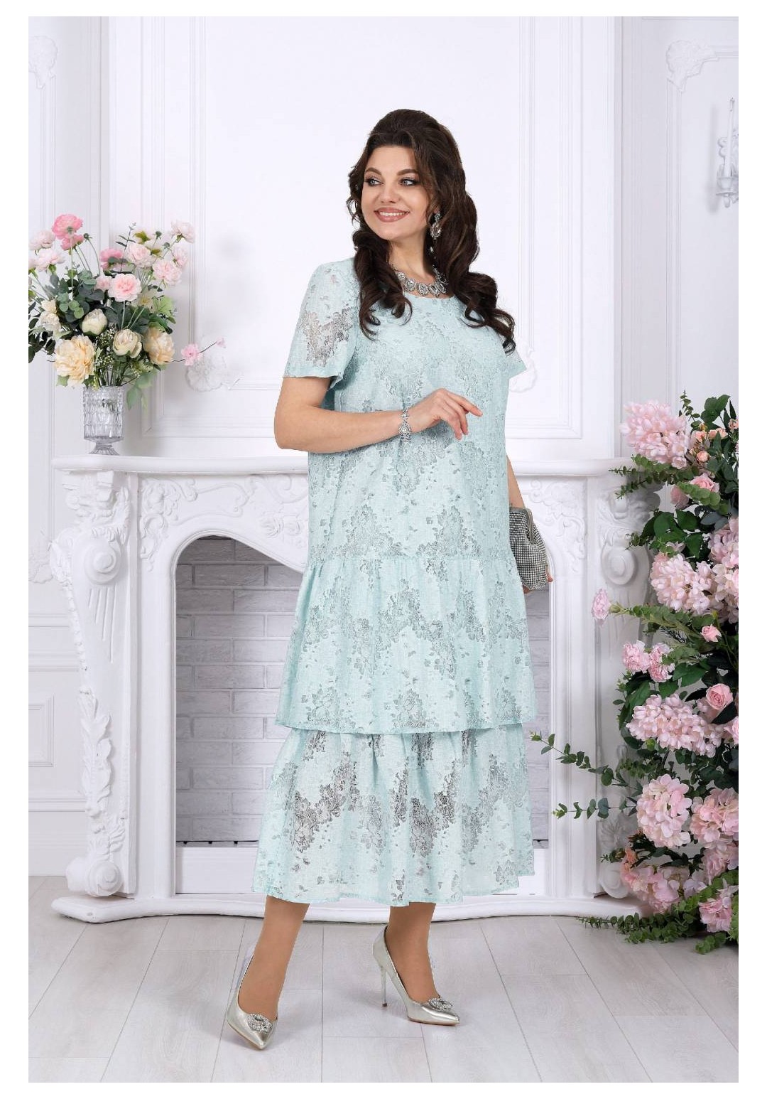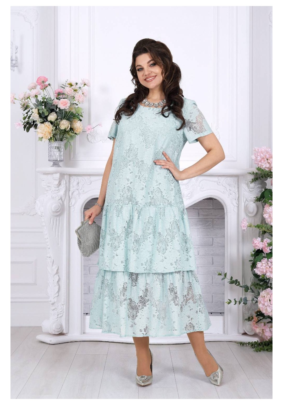 Лёгкость кружева, мягкое движение ткани и ощущение праздника в каждом шаге - платье, в котором хочется быть особенной. Праздничное платье из кружевного хлопкового гипюра создаёт изысканный и одновременно очень женственный образ. Оно выглядит нарядно и утончённо, но при этом остаётся удивительно удобным — идеальный баланс для тех случаев, когда хочется блистать и чувствовать себя свободно. Модель подчеркивает статус, вкус и уверенность, делая образ гармоничным и запоминающимся. Свободный А-силуэт мягко ложится по фигуре, деликатно скрывая нюансы и создавая красивую линию силуэта. Двухъярусные воланы добавляют образу динамики и лёгкости, а кружевная фактура придаёт глубину и благородство. Короткий рукав делает платье комфортным для тёплого сезона, а натуральная хлопковая подкладка обеспечивает приятные ощущения в течение всего дня. Такое платье идеально подойдёт для торжественных событий: юбилея, свадьбы, корпоратива или вечернего выхода. Оно легко адаптируется и для более спокойных случаев — стоит лишь сменить аксессуары. Отдельное внимание заслуживает качество исполнения: аккуратный крой, продуманные детали и белорусское производство, которое славится посадкой на фигуру, в том числе для женщин с формами. Это платье — про уверенность, комфорт и тот самый нарядный эффект, который не требует лишних усилий. Ключевые особенности: - праздничное и вечернее настроение - кружевное полотно из натурального хлопка - нарядный, но комфортный крой - универсально: от торжества до особого повода - большие размеры, идеально для полных - лёгкое, дышащее, летнее и весеннее - белорусское качество и продуманная посадка Платье женское, свободного кроя А силуэта, выполнено из хлопкового гипюра. Модель на хлопчатобумажной подкладке, с коротким рукавом, без плечевых накладок. По переду обработаны вытачки, направленные от пройм. Платье отрезное по линии бёдер с притачным, присборенным воланом. Второй волан присборен и пришит к низу подкладки. Вырез горловины спинки округлый, по переду – углубленный округлый. Длина платья –125 см; длина рукава-22 см.