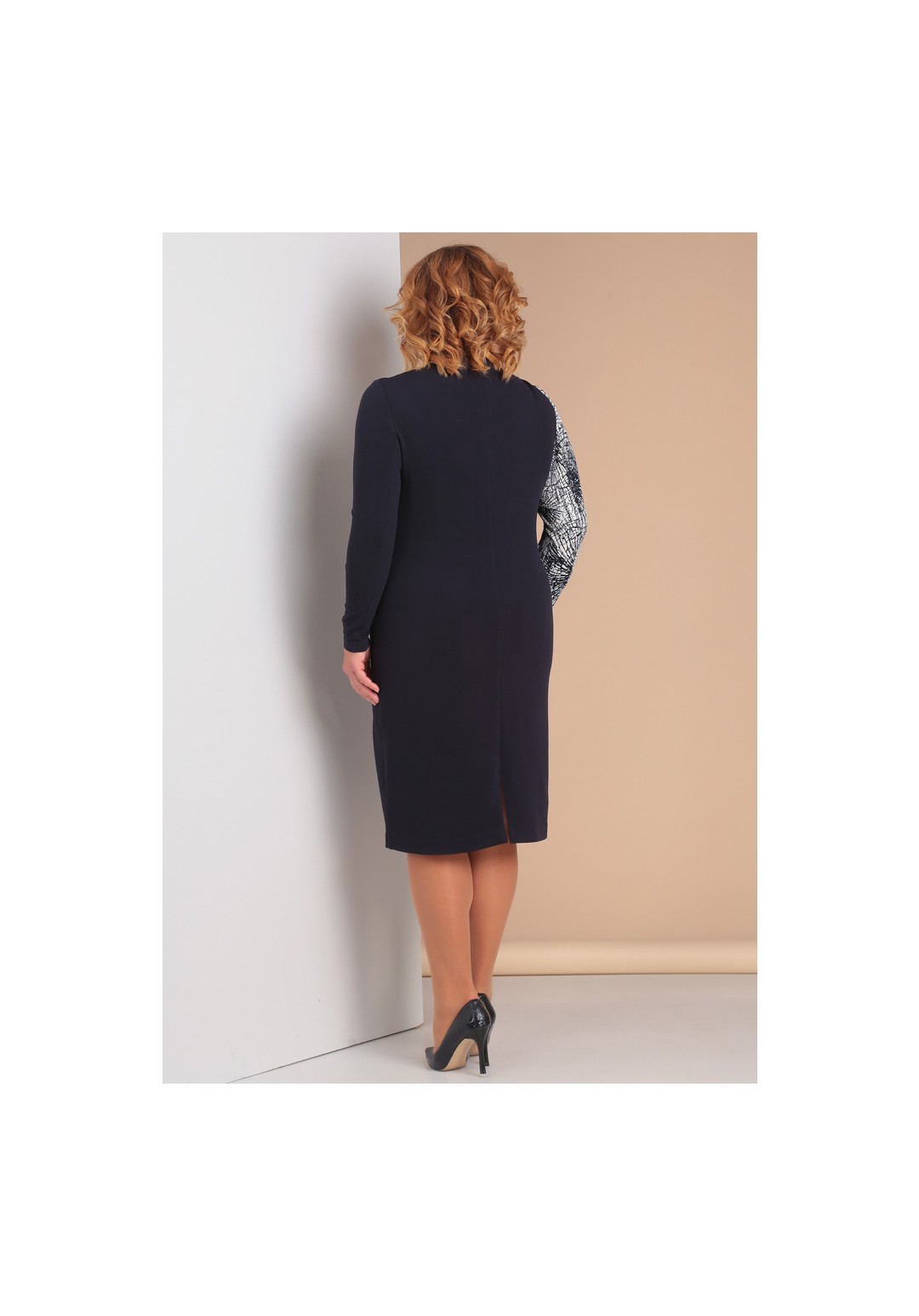Платье с комбинацией из трикотажного однотонного полотна и цветного. Прямой силуэт не сковывает движения, в нем вы будете чувствовать себя комфортно в течении всего дня. Контрастное сочетание двух тканей по переду отлично выделяет платье и делает его ярче. Круглая горловина, которая декорирована пряжкой, втачной рукав - все это делает модель современной и подходящей для работы и просто для повседневного применения.