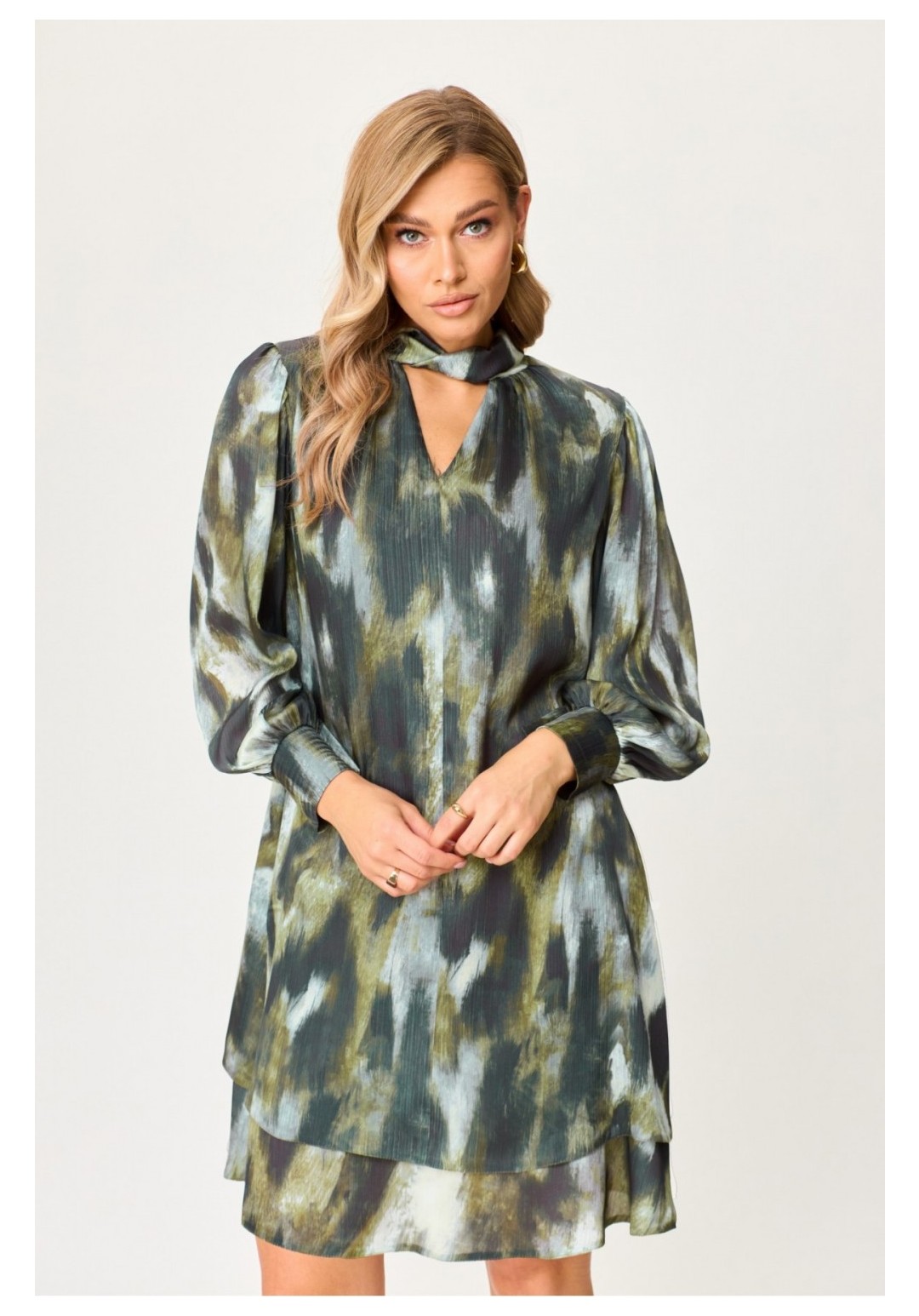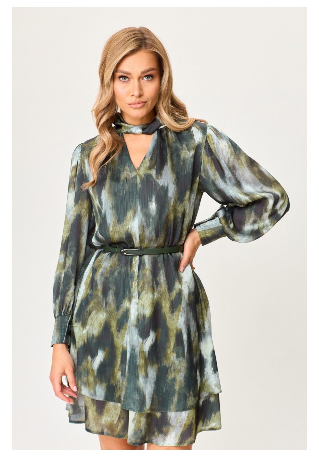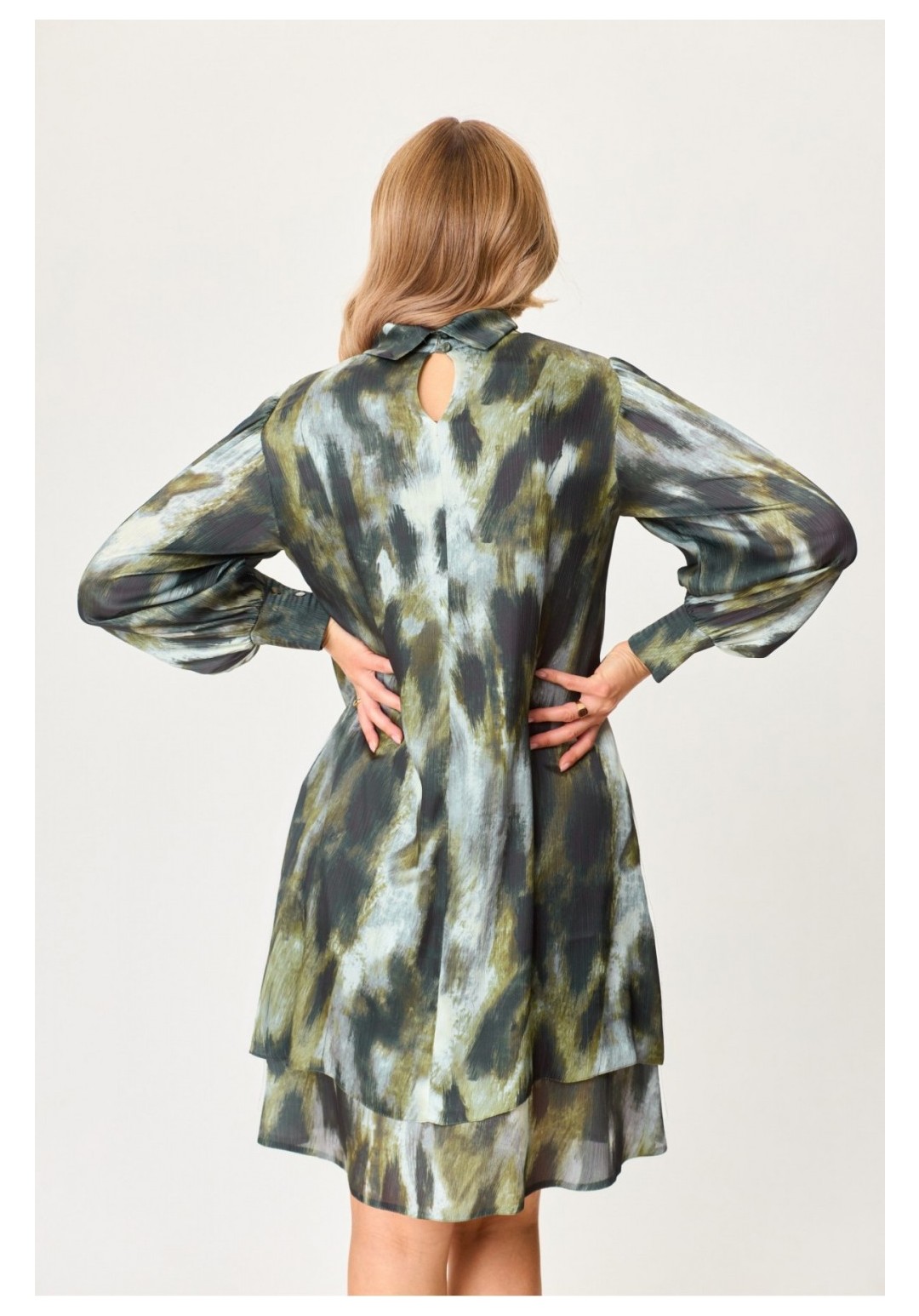 Шифоновое платье (в этой модели мы используем новое качество шифона с легким благородным блеском) трапециевидного силуэта, длинной выше колена, с фантазийной стойкой, и V-образным вырезом у горловины. По переду легкая сборка у стойки платья. Стойка платья застегивается сзади на навесные петли и пуговицы. Платье двухъярусное, нижний волан пришит к подкладке платья, что создает необходимый эффект. Рукава платья втачные с легкой сборкой у проймы и у манжеты платья. Манжета застегивается на петли и пуговицы. По спинке платья средний шов. Платье можно приталить ремнем, который идет в комплекте. Абсолютно самодостаточное платье, не требующее дополнительных аксессуаров для того, что бы получить запоминающийся образ. Платье отлично подойдет для различных мероприятий: как для праздников, так и для повседневных образов и хорошо сочетается с разными видами обуви. Декор может отличаться от представленного на фотографии.
