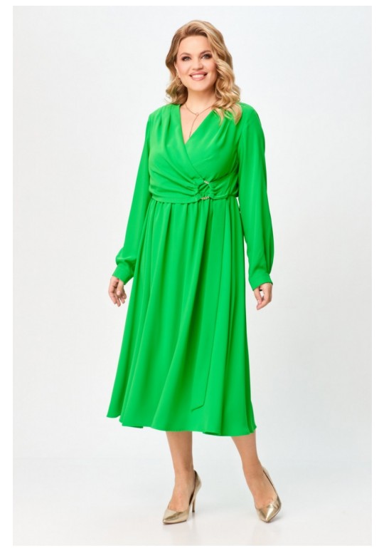 Платье женское, свободного силуэта, расширенное к низу, длиной до середины икр, с втачными рукавами, отрезное по линии талии. Лиф детали переда платья с запахом, по плечевым швам обработаны по 2 складки-защипы, с левой стороны на уровне линии талии расположен декоративный элемент с кольцом и поясом. В шов соединения лифа и юбки вставлена эластичная тесьма. Рукава втачные одношовные, с притачными манжетами, с застежкой на 1 петлю и пуговицу. Разрезы рукавов обработаны окантовкой, по швам притачивания манжет заложены складки, по переду 3, по спинке - одна. Вырез горловины платья V-образной формы, обработан обтачкой. Длина рукава - 63см, ширина рукава – 21см, длина спинки – 121см.