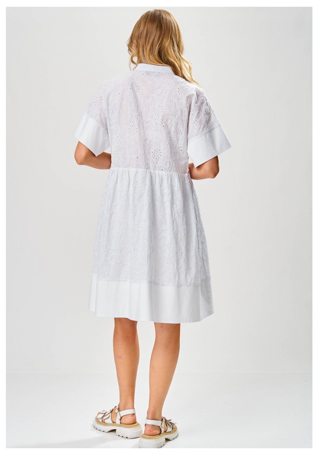 Платье женское из вышитого хлопка, свободного силуэта, на подкладке,расширенное книзу, длиной ниже коленей,со спущенной линией плеча, с втачной стойкой по горловине, отрезное на уровне линии талии, со съемным поясом. Лиф деталей переда платья с застежкой на 5 петель и 5 пуговиц, с 2-мяскладками, исходящие от линии талии, с цельнокроеными планками. Юбка платья конической формы, с горизонтальным подрезом, по шву соединения с лифом обработана сборка. Рукава втачные одношовные, короткие. По горловине втачная стойка. На уровне линии талии по боковым швам прикреплены шлевки для протяжки съемного пояса. Длина плеча – 28см, длина рукава – 9см, длина спинки – 96см.