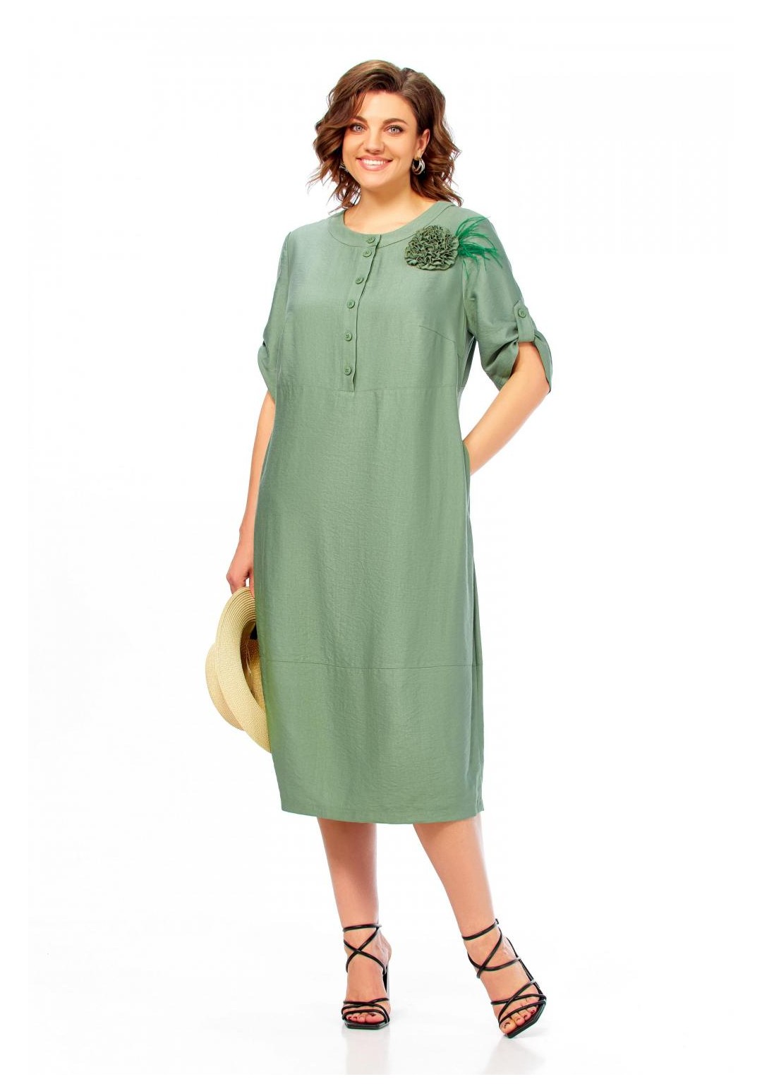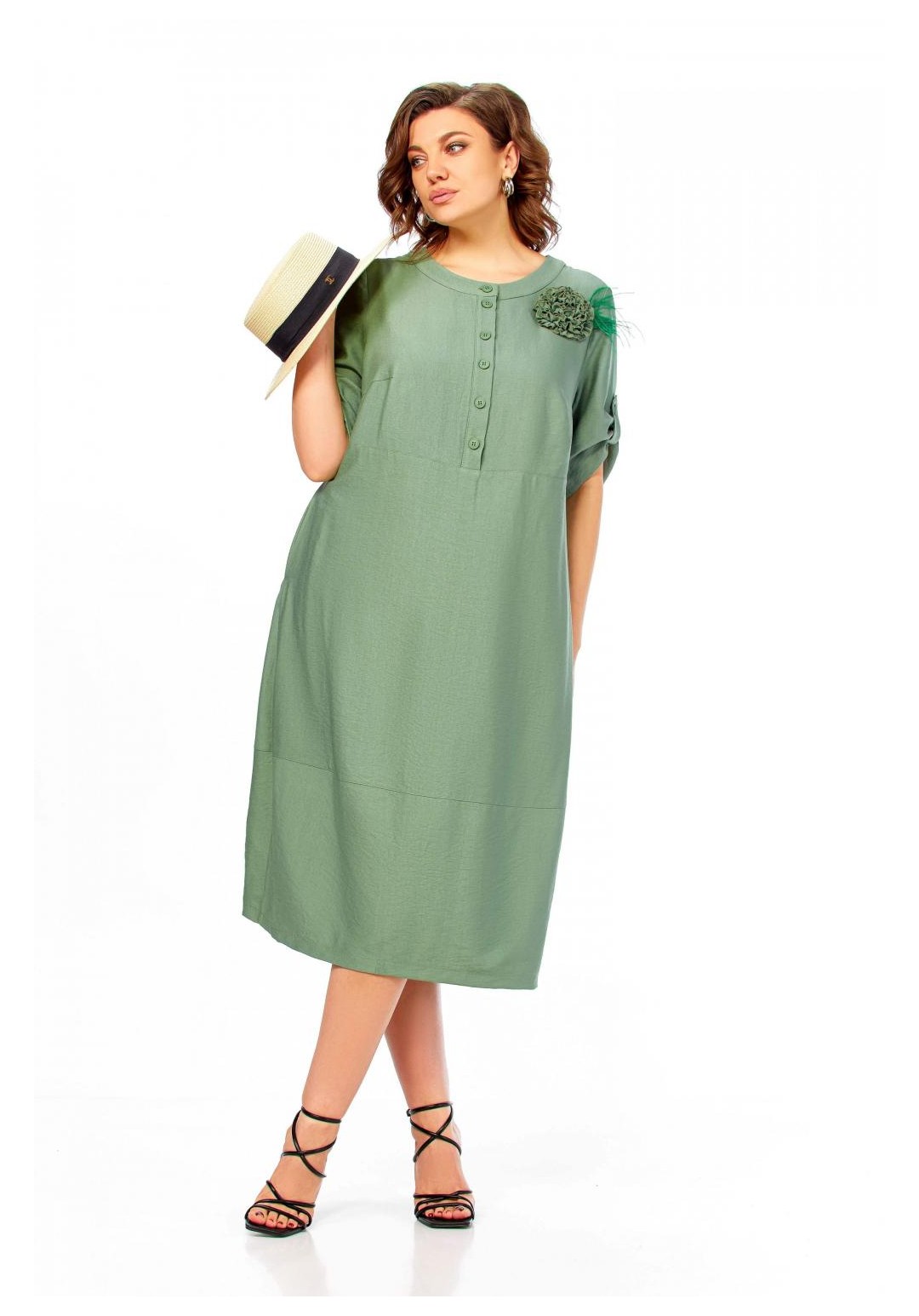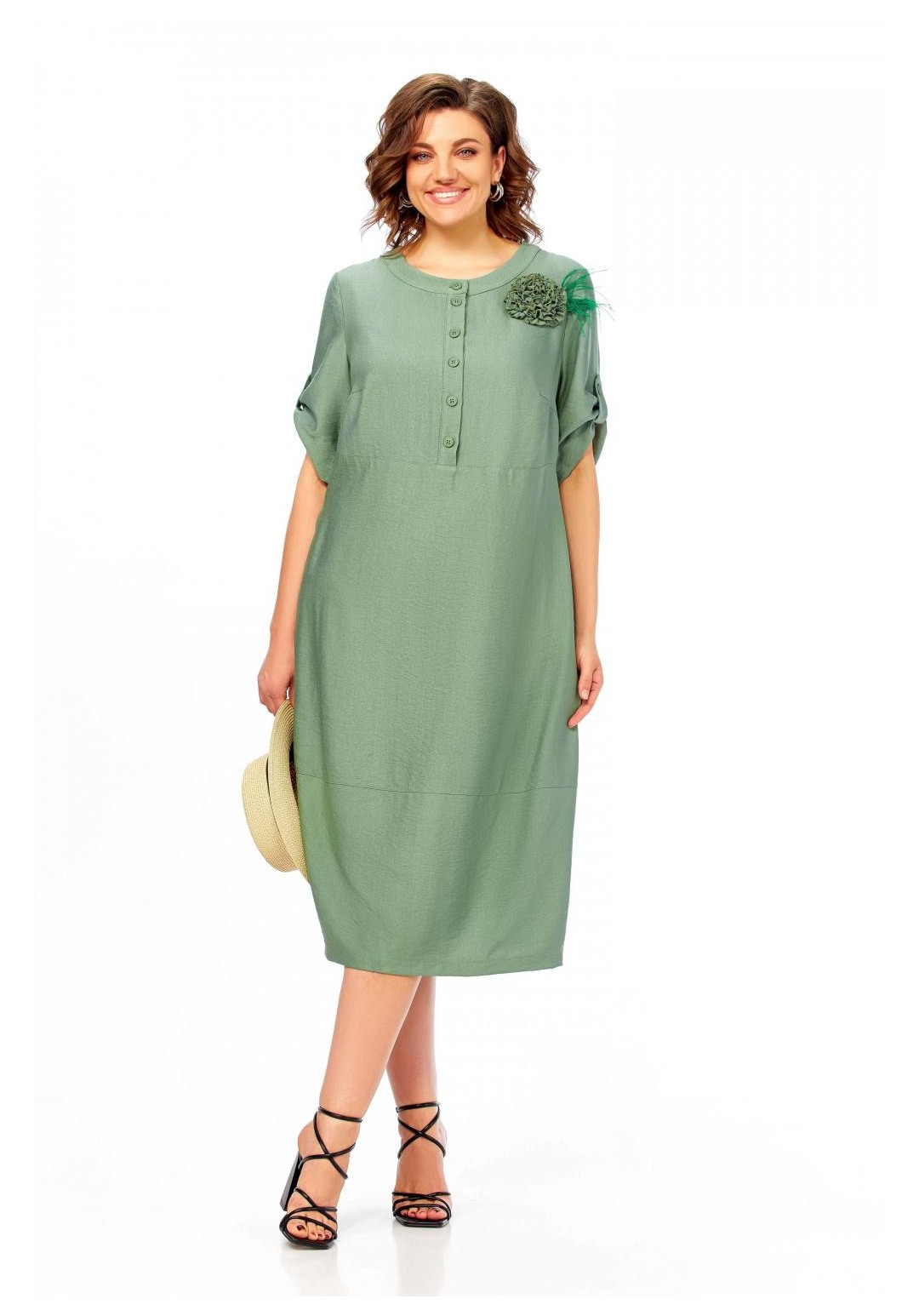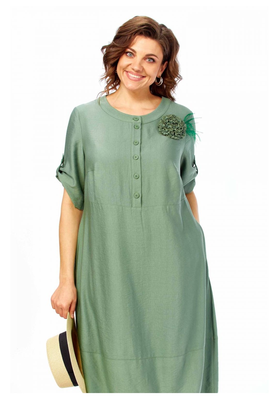 Платье женское, свободного силуэта с втачным рукавом, длина которого регулируется патой. Вырез горловины округлый, обработан притачной бейкой. По линии груди горизонтальный подрез. Застежка на полочке, на петли и пуговицы до подреза. Карманы в боковых швах. Декоративная брошь ручной работы в виде цветка. Длина платья 113см.