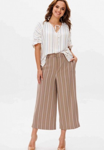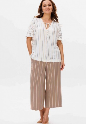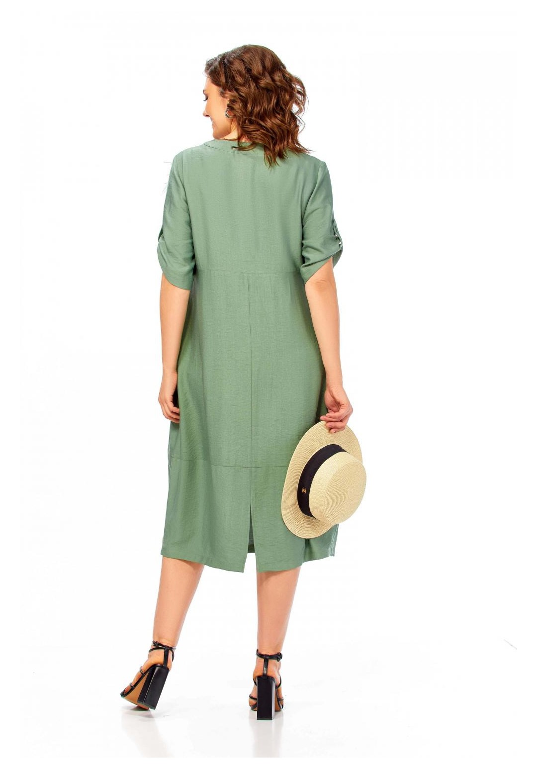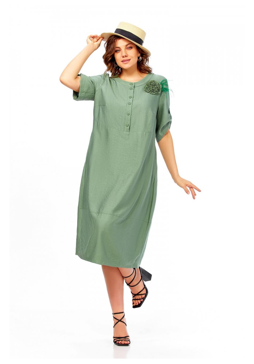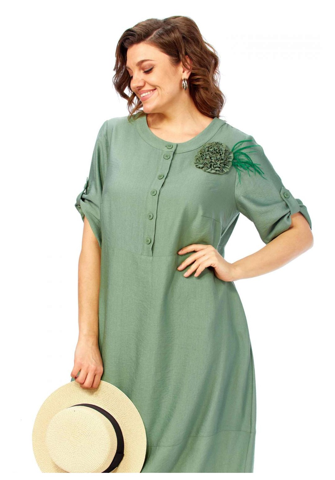 Платье женское, свободного силуэта с втачным рукавом, длина которого регулируется патой. Вырез горловины округлый, обработан притачной бейкой. По линии груди горизонтальный подрез. Застежка на полочке, на петли и пуговицы до подреза. Карманы в боковых швах. Декоративная брошь ручной работы в виде цветка. Длина платья 113см.