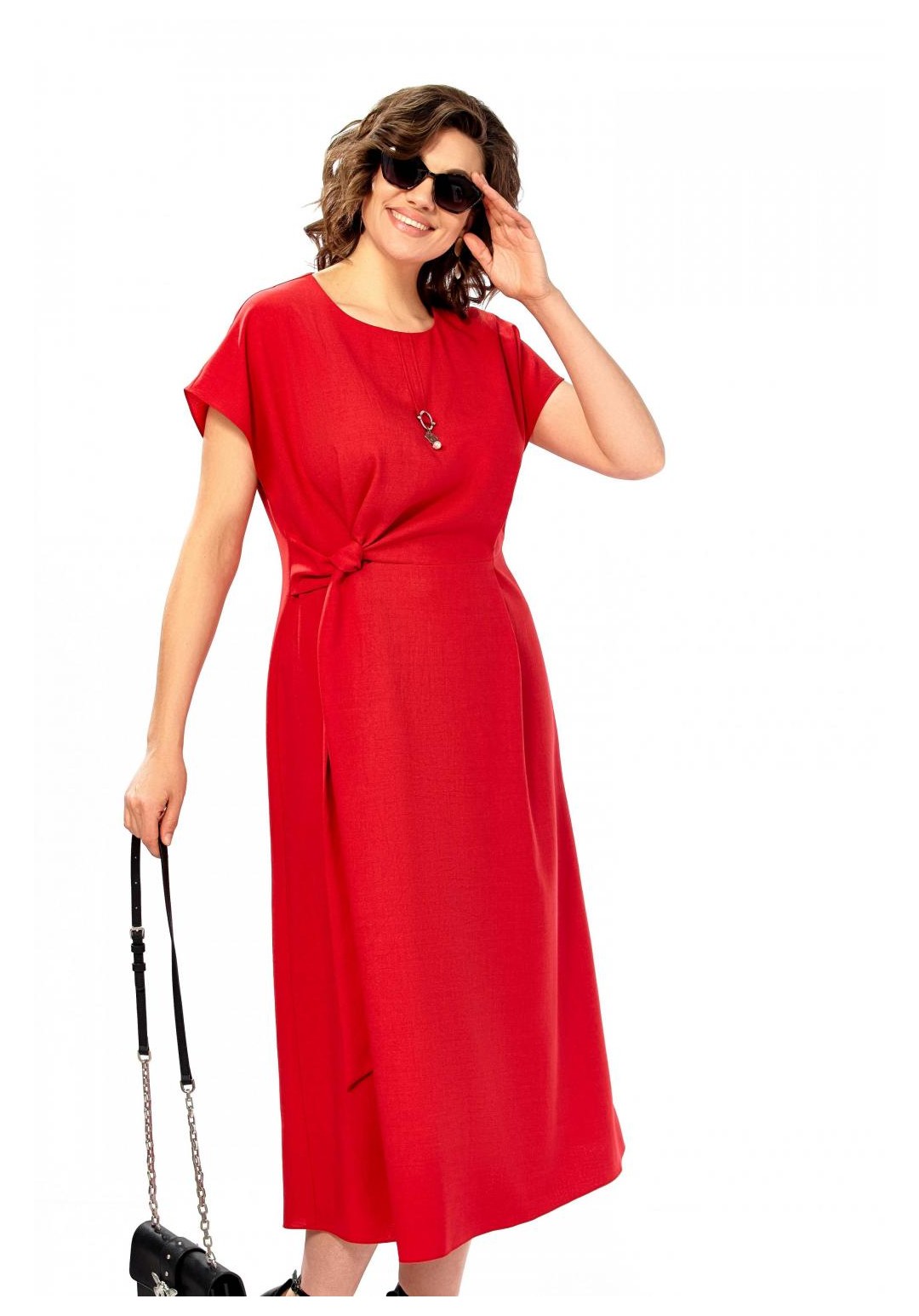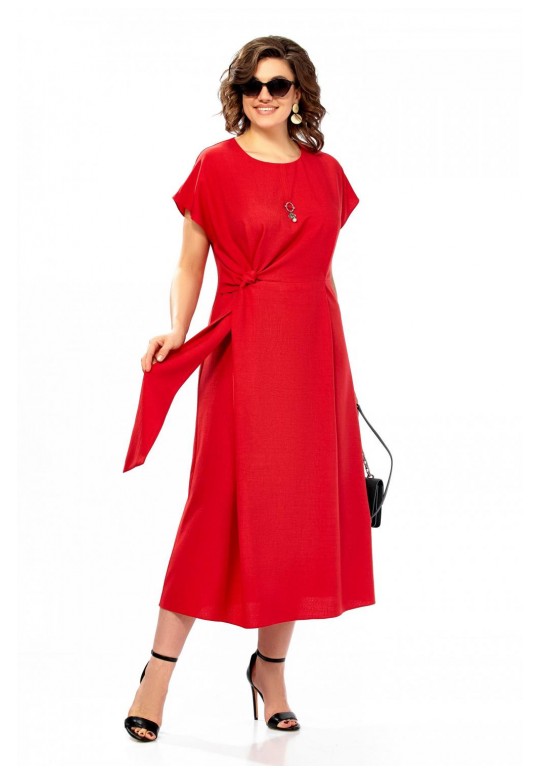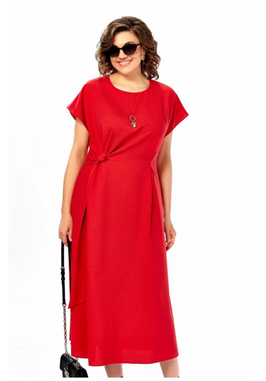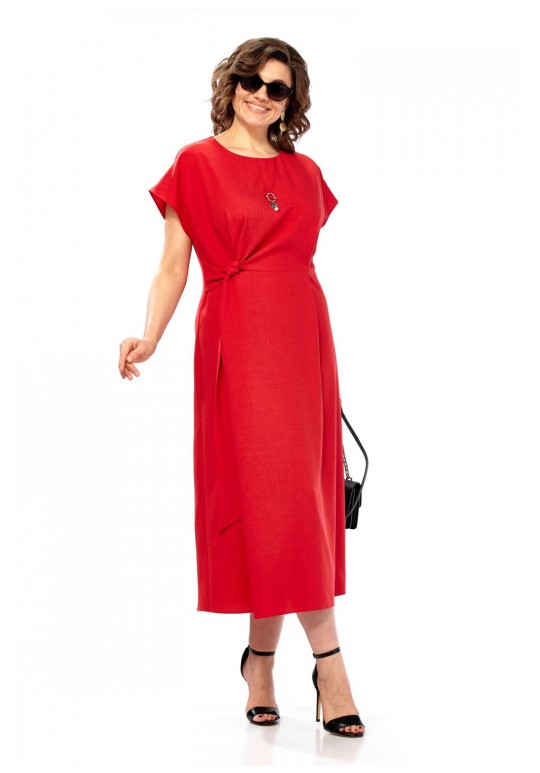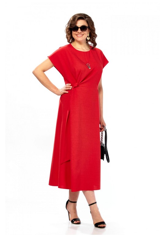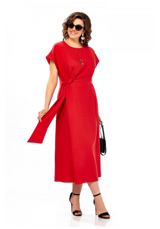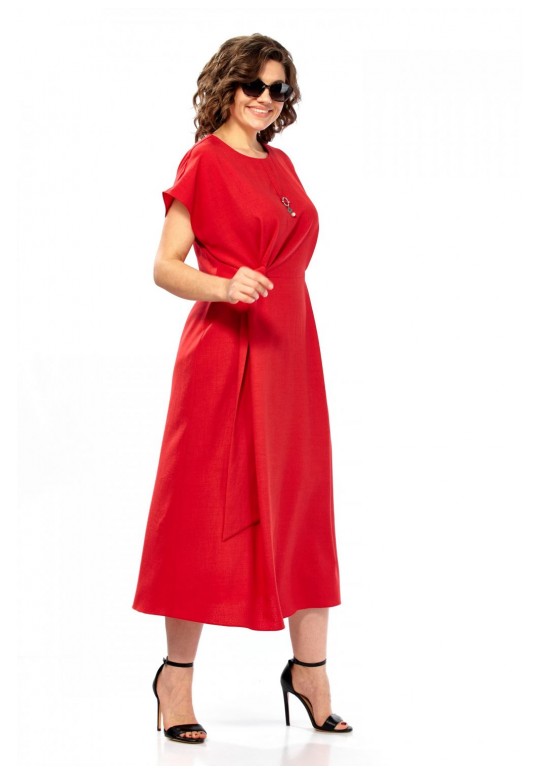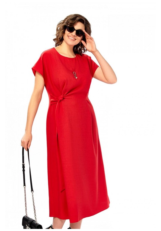 Платье женское, полуприлегающего силуэта со спущенным рукавом. Округлый вырез горловины, по центру от горловины настрочена планка с украшением. Отрезное по линии талии, по переду заложены складки. С правой стороны в области талии вставлен пояс из основной ткани. Спинка со средним швом и потайной молнией. Длина платья 123см.