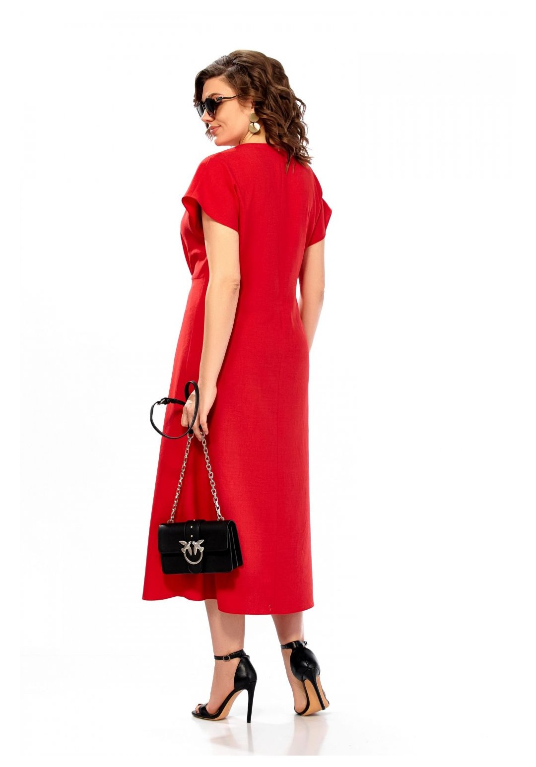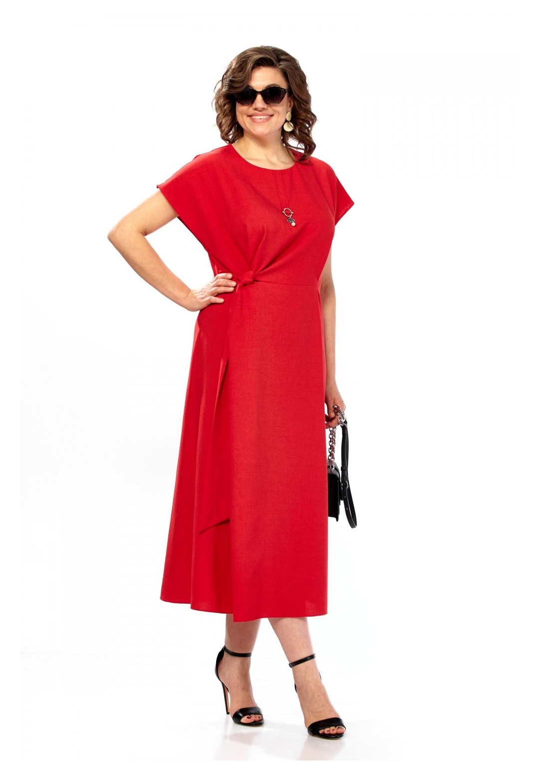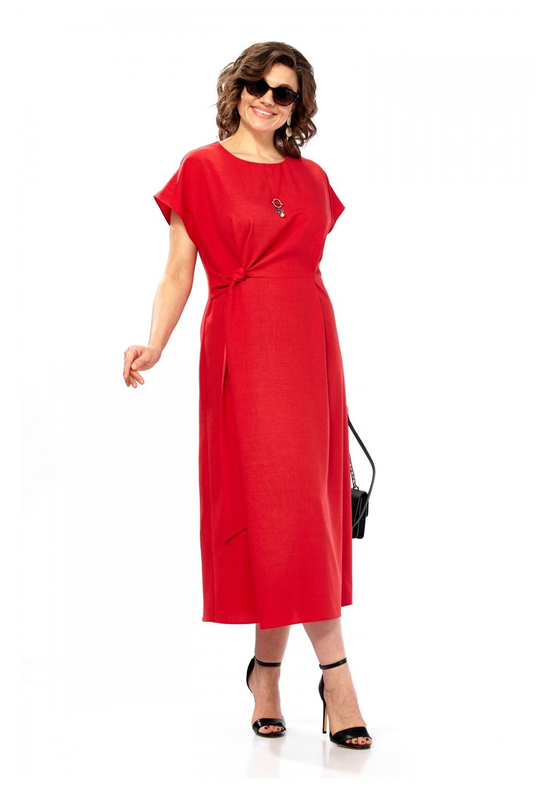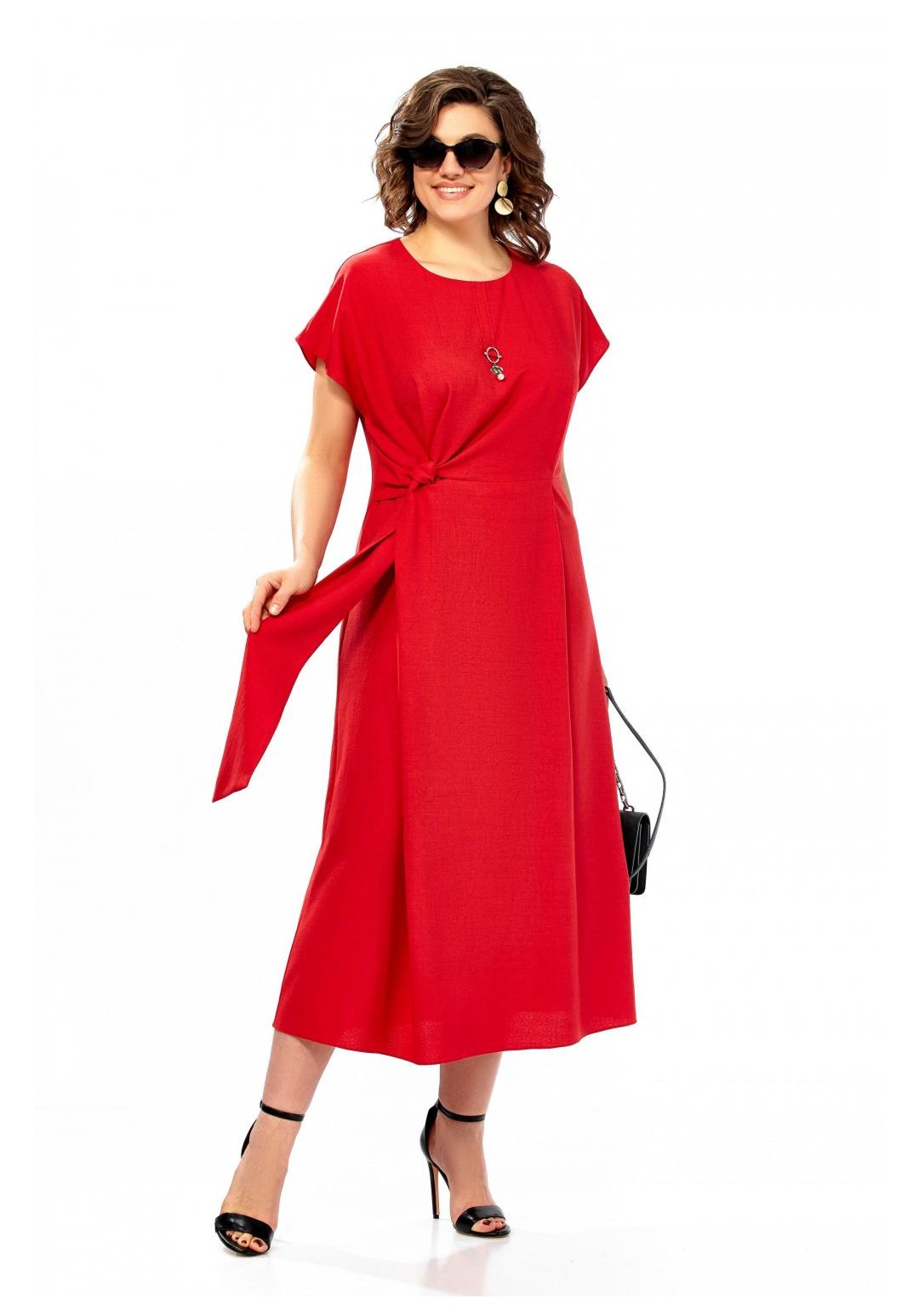 Платье женское, полуприлегающего силуэта со спущенным рукавом. Округлый вырез горловины, по центру от горловины настрочена планка с украшением. Отрезное по линии талии, по переду заложены складки. С правой стороны в области талии вставлен пояс из основной ткани. Спинка со средним швом и потайной молнией. Длина платья 123см.