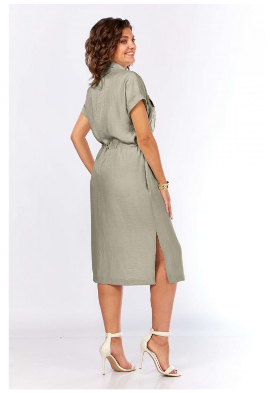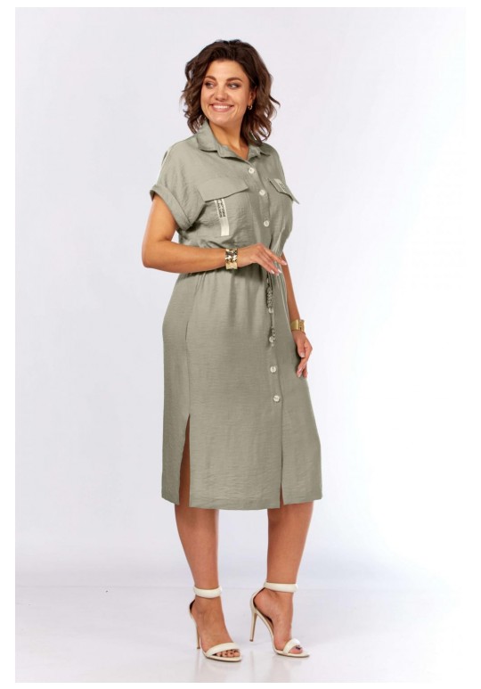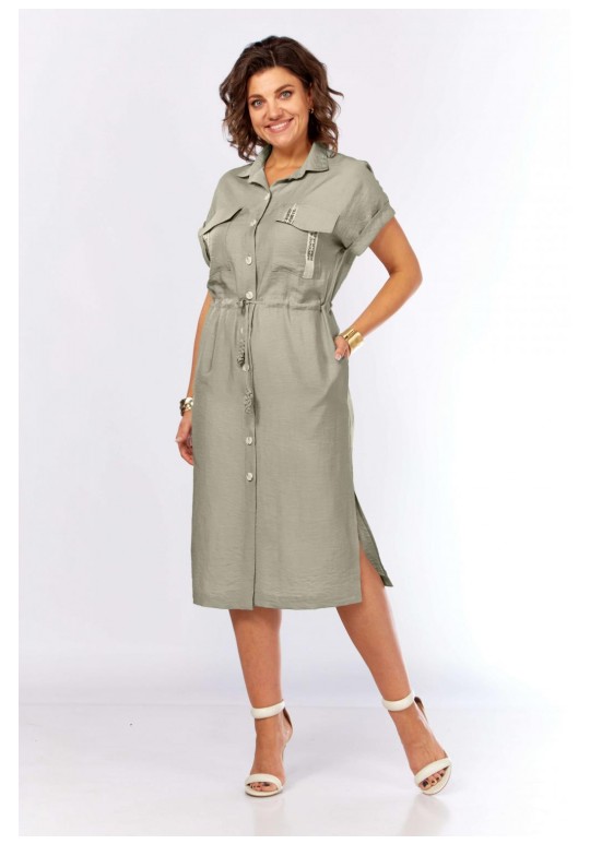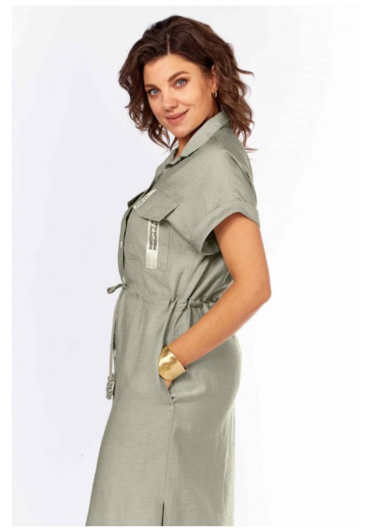 Шикарное платье-рубашка прямого силуэта с центральной застежкой на петли и пуговицы, с воротником рубашечного типа. Накладные карманы с клапанами, с декоративной тесьмой. По талии кулиска, в которую втянут шнур с интересными наконечниками ручной работы. Карманы в боковых швах. По низу разрезы по бокам. Рукав спущенный с притачными манжетами. Длина платья 115см.