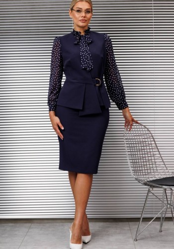 Женское платье расширенного к низу силуэта, выполненное из ткани костюмно-плательного ассортимента, отделкой служит эко-кожа. Из эко-кожи выполнен широкий волан по низу платья с фигурной линией притачивания. По переду справа в области бедер есть крупная печать с дополнительной отделкой из квадратных кусочков эко-кожи, которые крепятся к детали переда с помощью сквозных люверсов. Вырез горловины округлый. Рукав втачной со спущенной линией плеча.