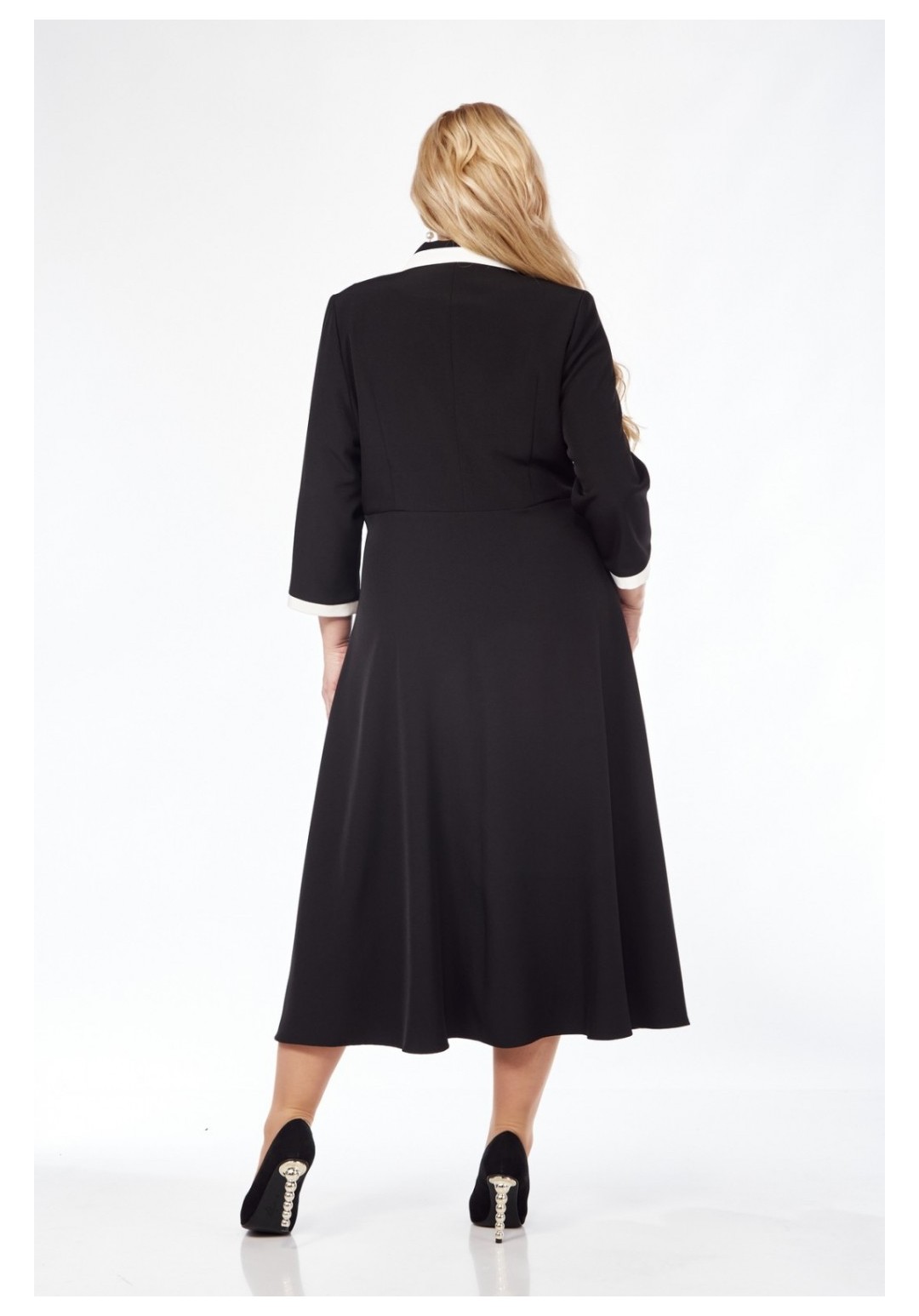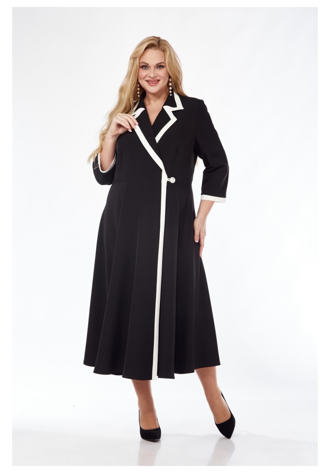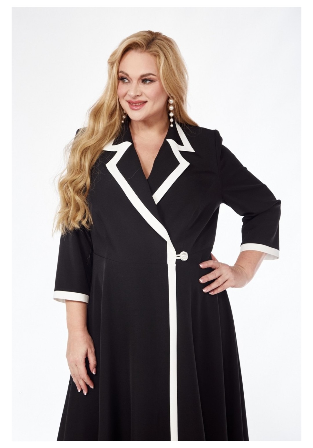 Платье с отрезным лифом и двубортной застёжкой на навесную петлю и пуговицу. Воротник пиджачного типа с отворотом лацкана. Рукава втачные одношовные. Низ платья с большим расширением. Лиф и рукава на подкладке. Воротник, лацканы и борт нижней детали переда отделан бейками контрастного цвета. Изделие с плечевыми накладками.