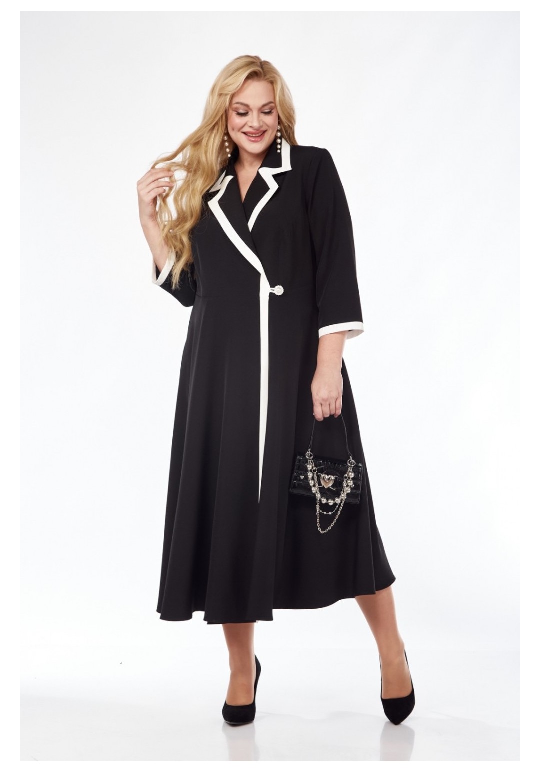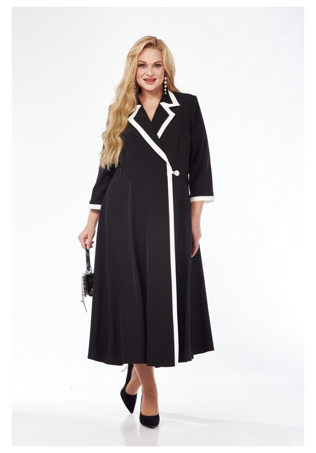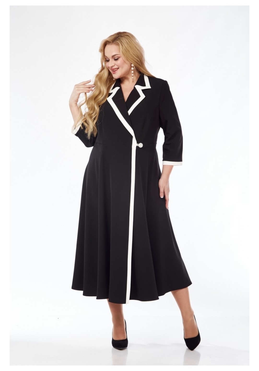 Платье с отрезным лифом и двубортной застёжкой на навесную петлю и пуговицу. Воротник пиджачного типа с отворотом лацкана. Рукава втачные одношовные. Низ платья с большим расширением. Лиф и рукава на подкладке. Воротник, лацканы и борт нижней детали переда отделан бейками контрастного цвета. Изделие с плечевыми накладками.