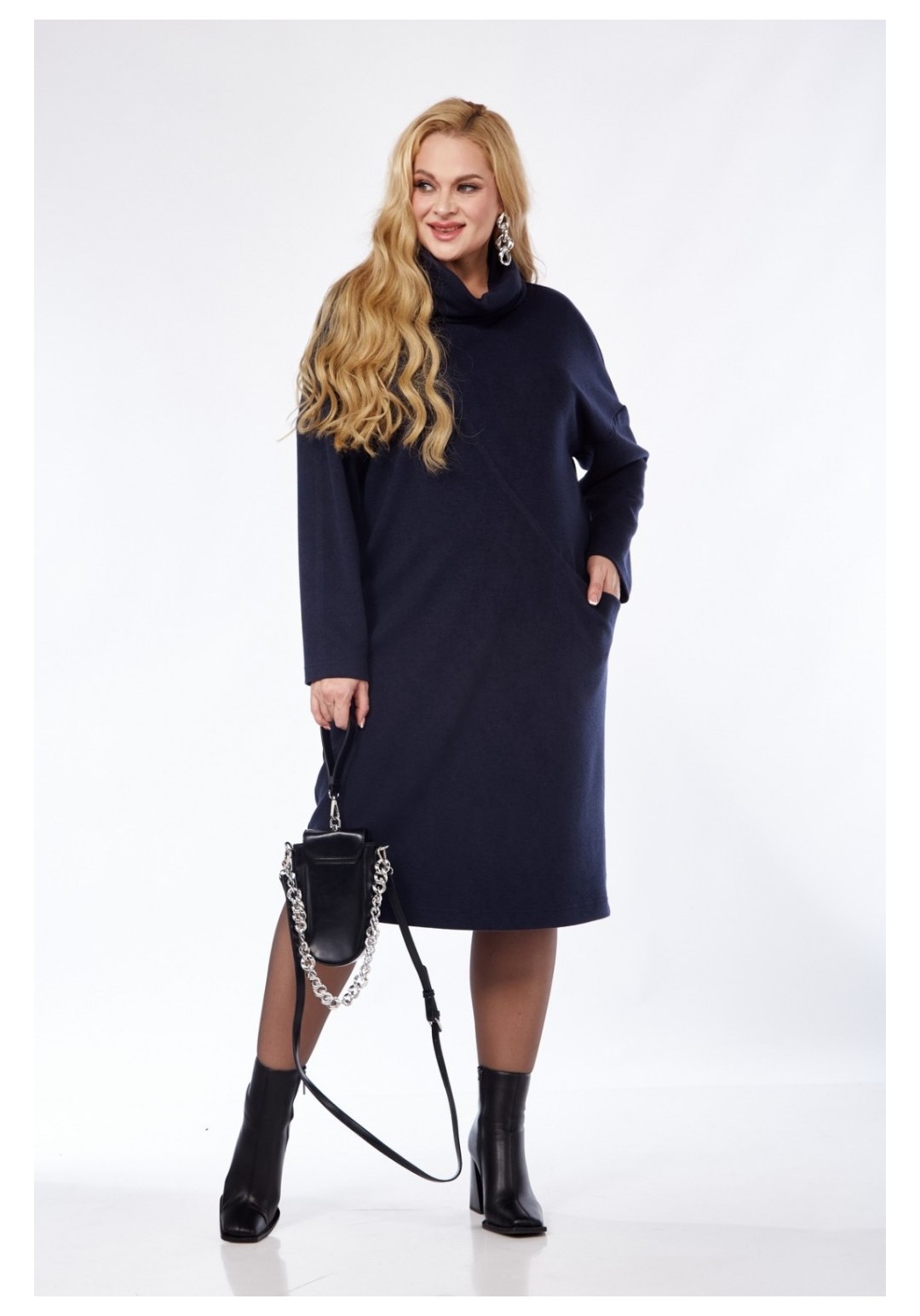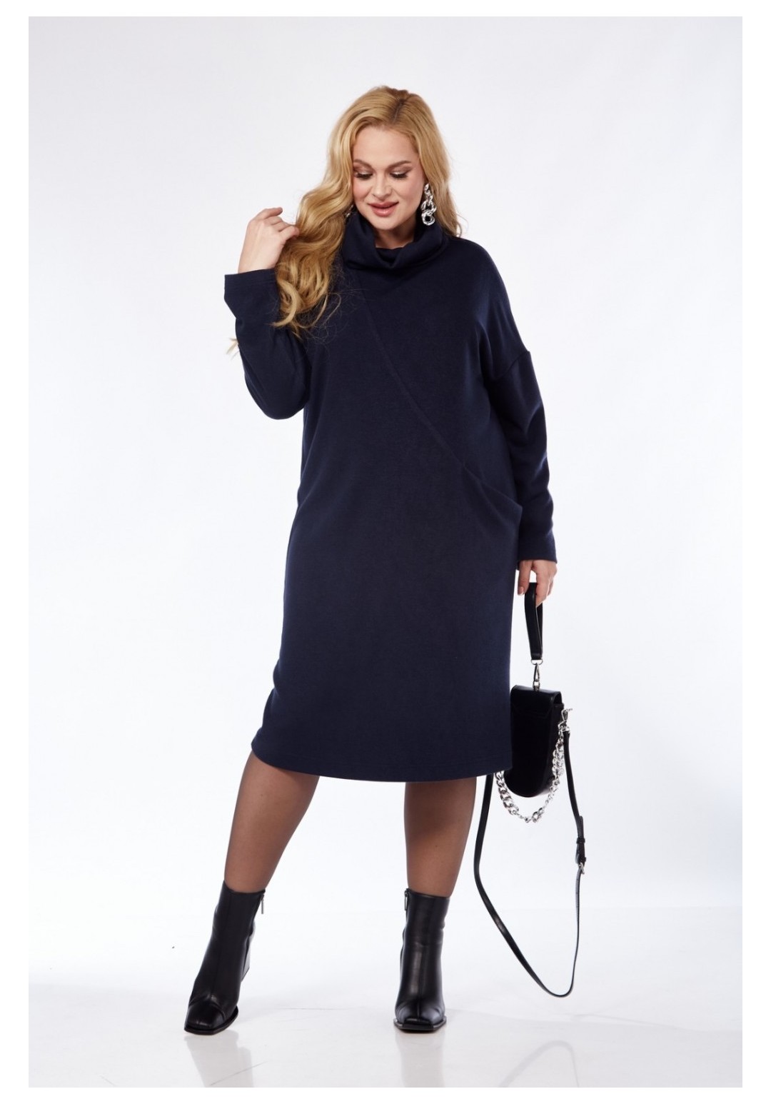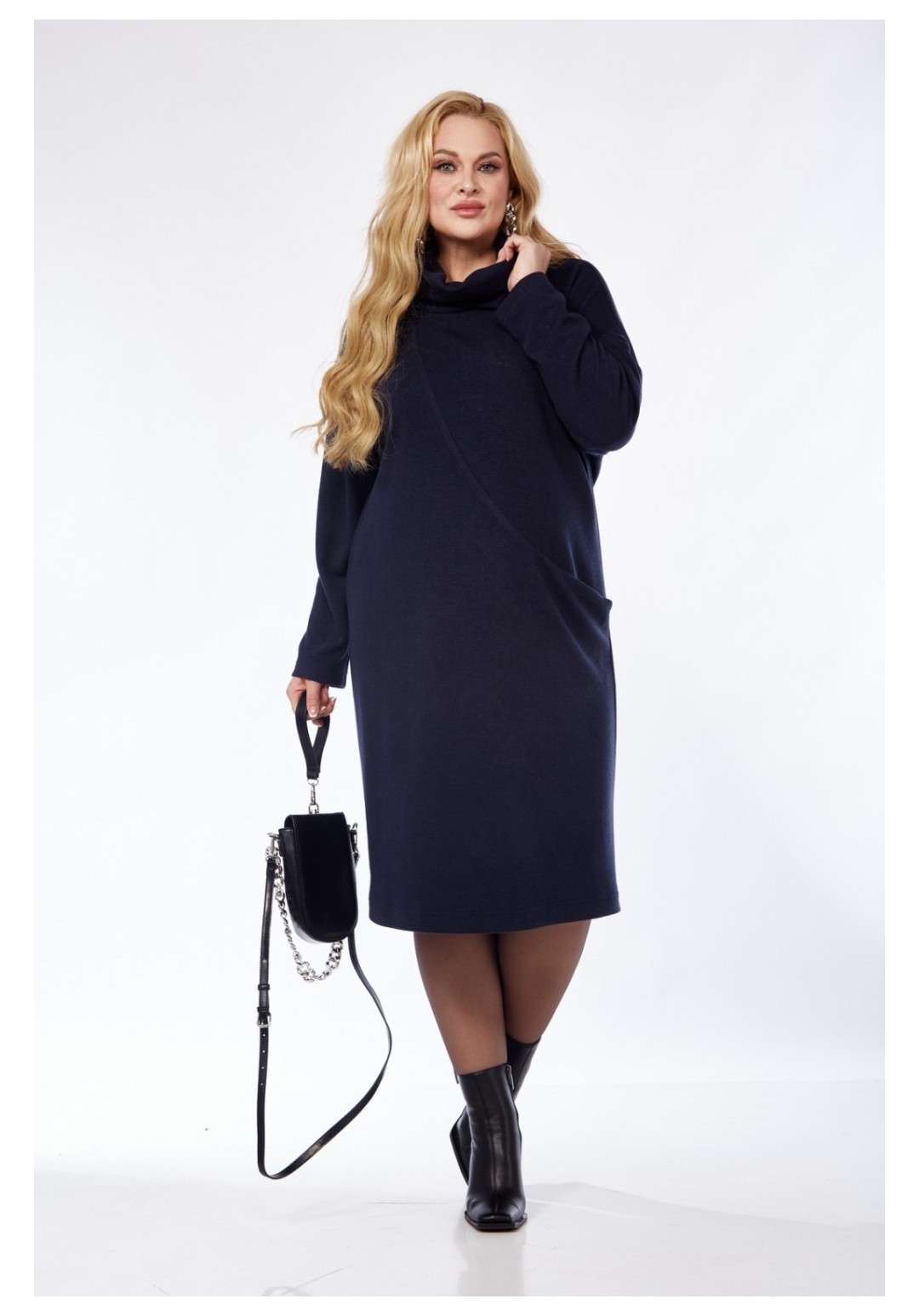 Трикотажное платье прилегающего силуэта с небольшим заужением к низу. На передней детали обработан ассиметричный подрез с карманом у левого бокового шва. В горловине обработан воротник-стойка типа хомут. Втачной рукав со спущенной проймой мягкой формы.