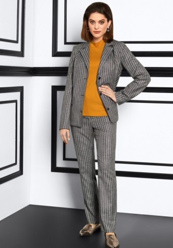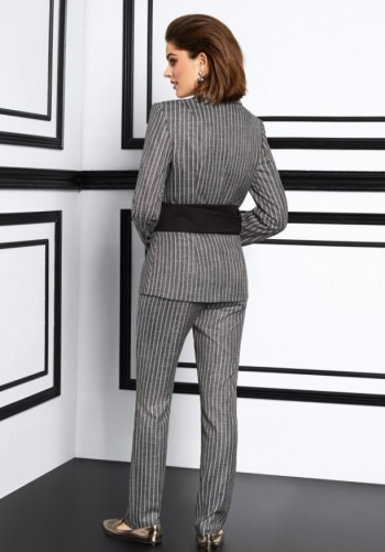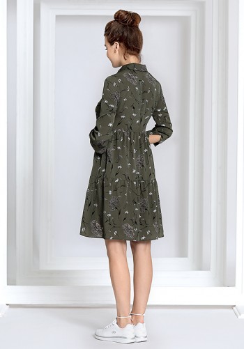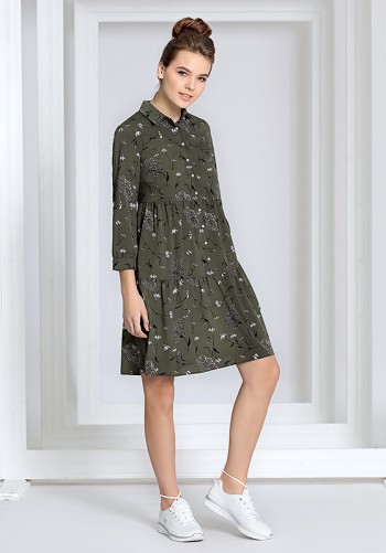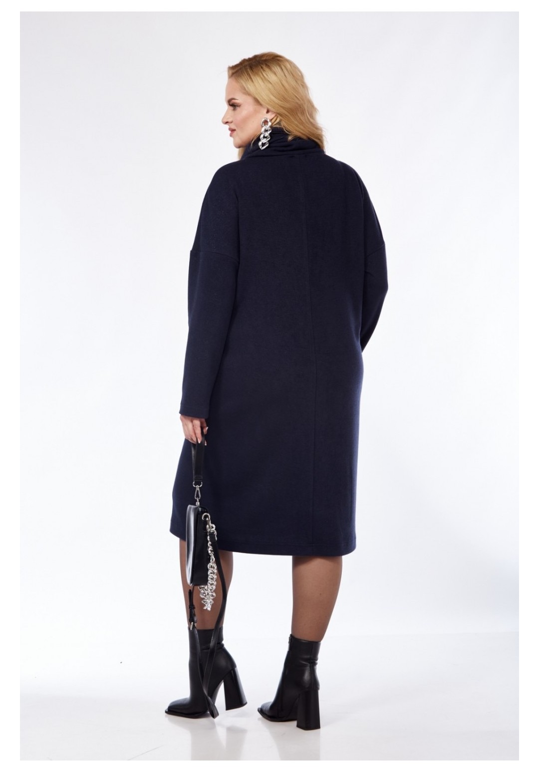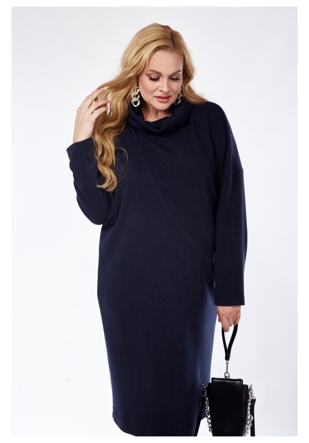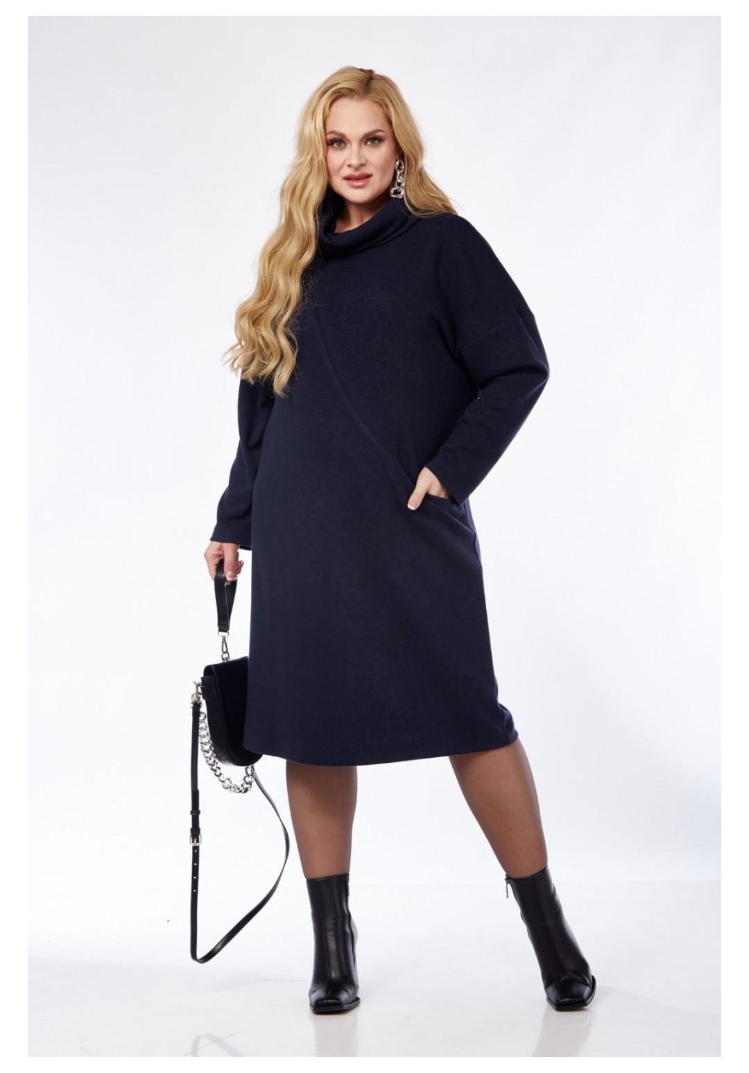Трикотажное платье прилегающего силуэта с небольшим заужением к низу. На передней детали обработан ассиметричный подрез с карманом у левого бокового шва. В горловине обработан воротник-стойка типа хомут. Втачной рукав со спущенной проймой мягкой формы.