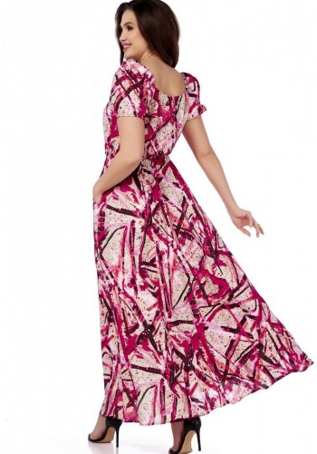 Платье отрезное по линии талии на резинке, выполнено из вискозы с принтом рептилии. Горловина с окантованным вырезом круглой формы. Рукава-реглан, в длине 3/4 собраны на резинку по низу. По спинке обработан разрез с застежкой в среднем шве на навесную петлю и пуговицу. В комплекте прилагается съемный ремень.