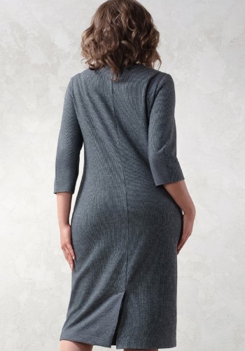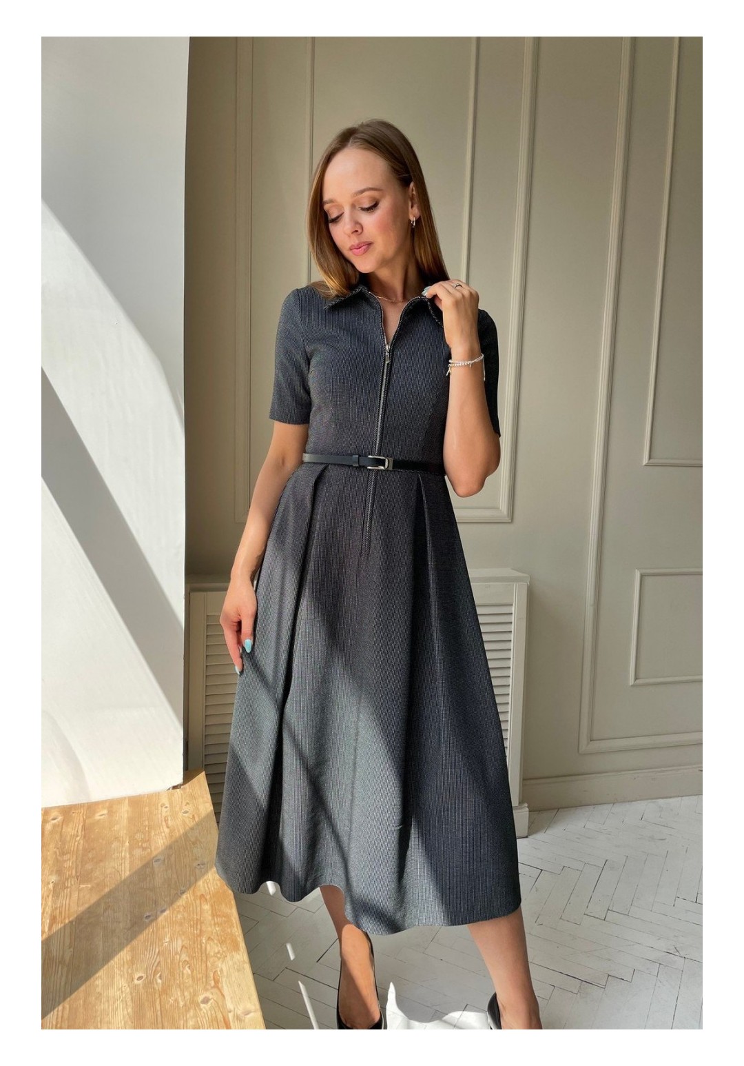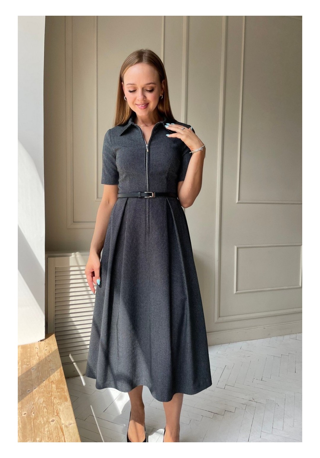 Элегантное платье с отрещной талией, с функционирующей молнией спереди.Ремень в комплекте. Воротник отложной.Материал неплотный, хорошо держит форму.