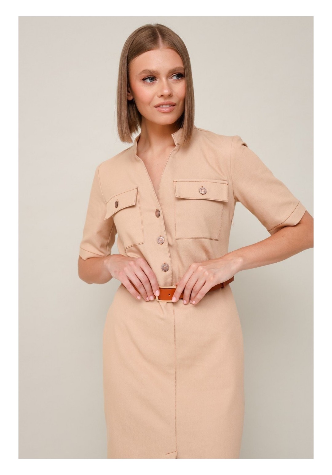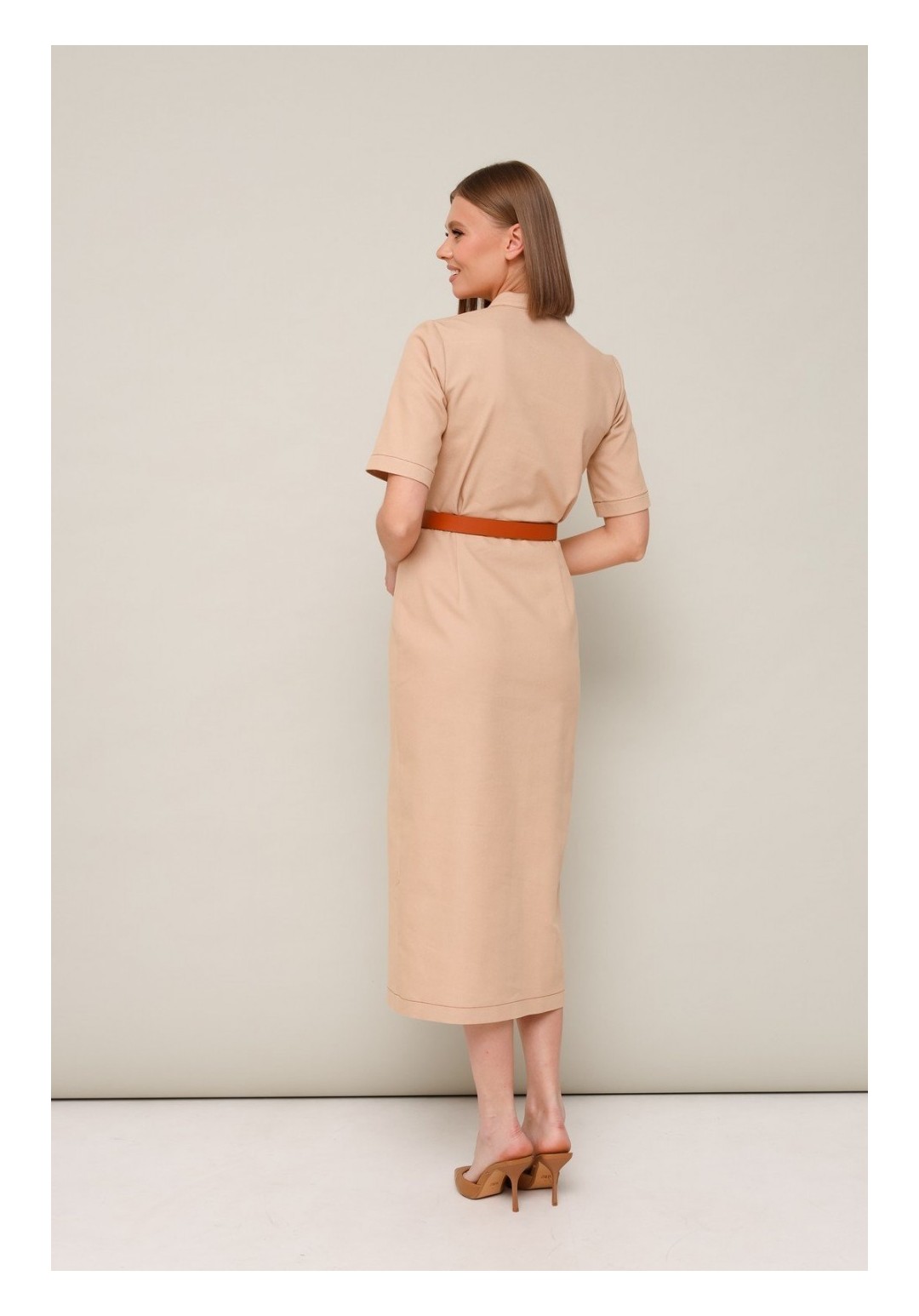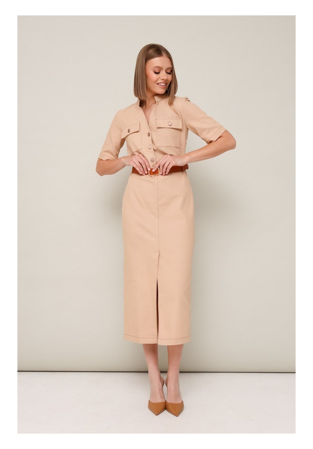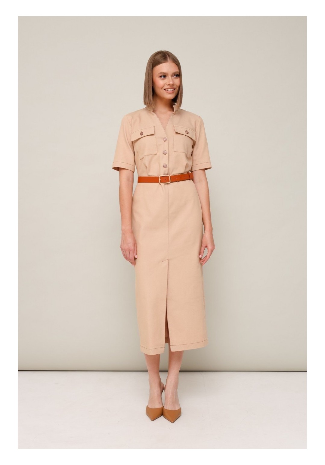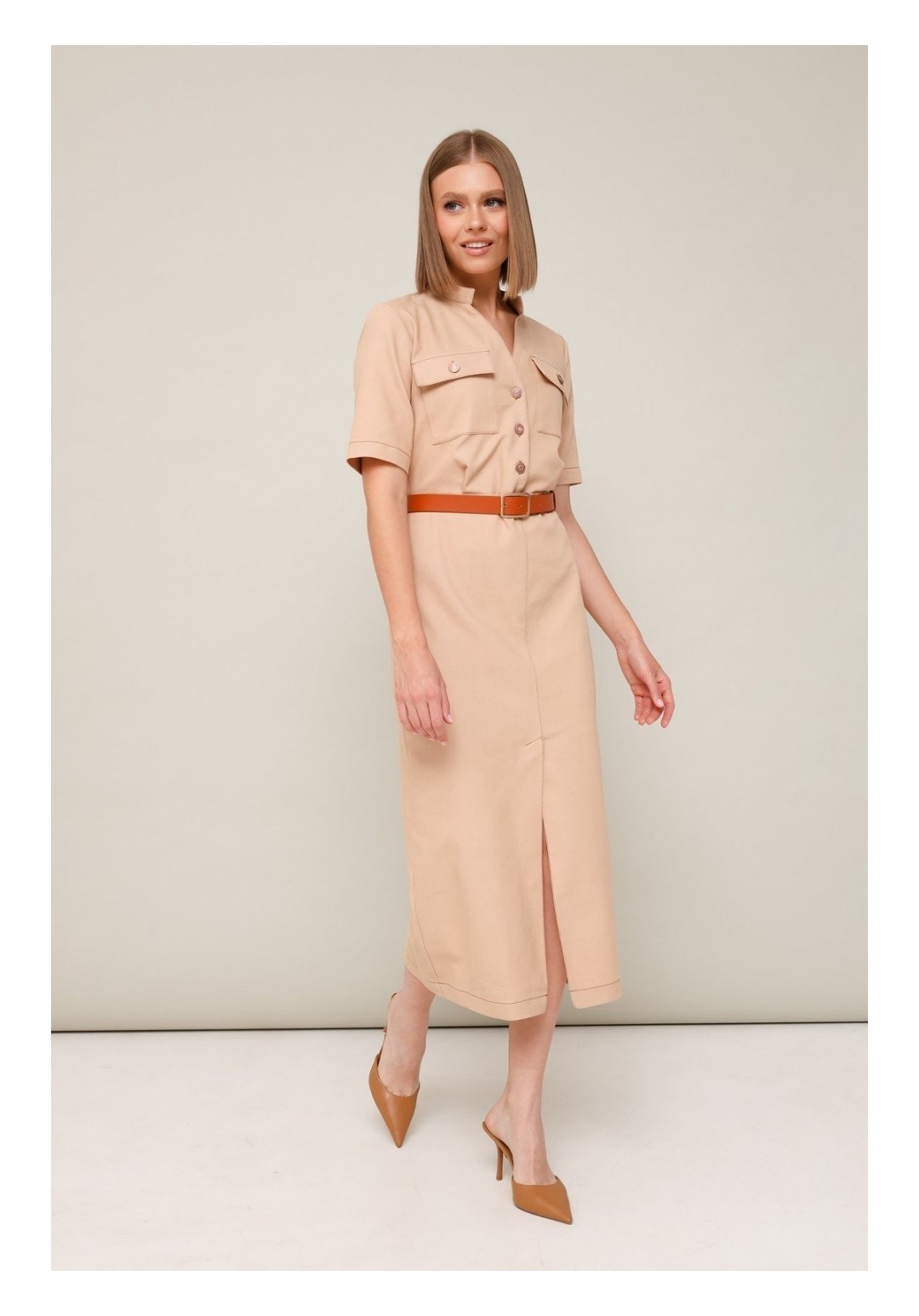 Спереди по низу неглубокий разрез,что добавляет элегантности и женственности этой модели.Ремень в комплекте.