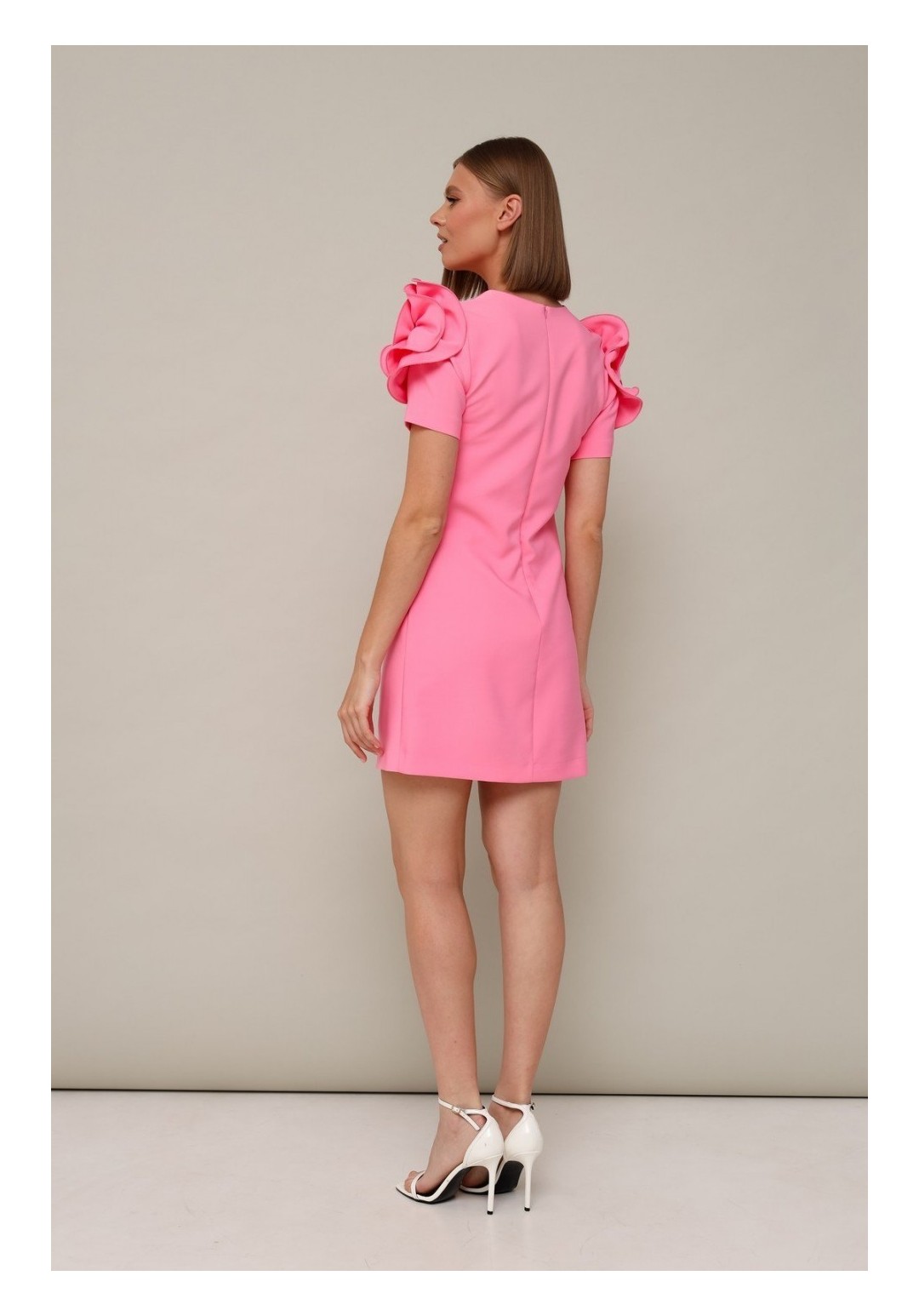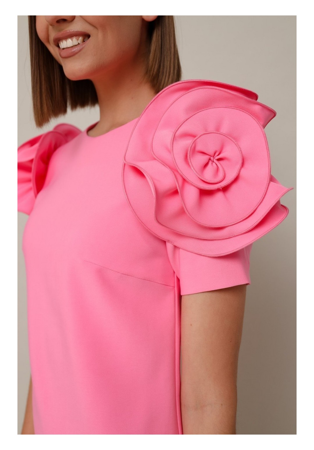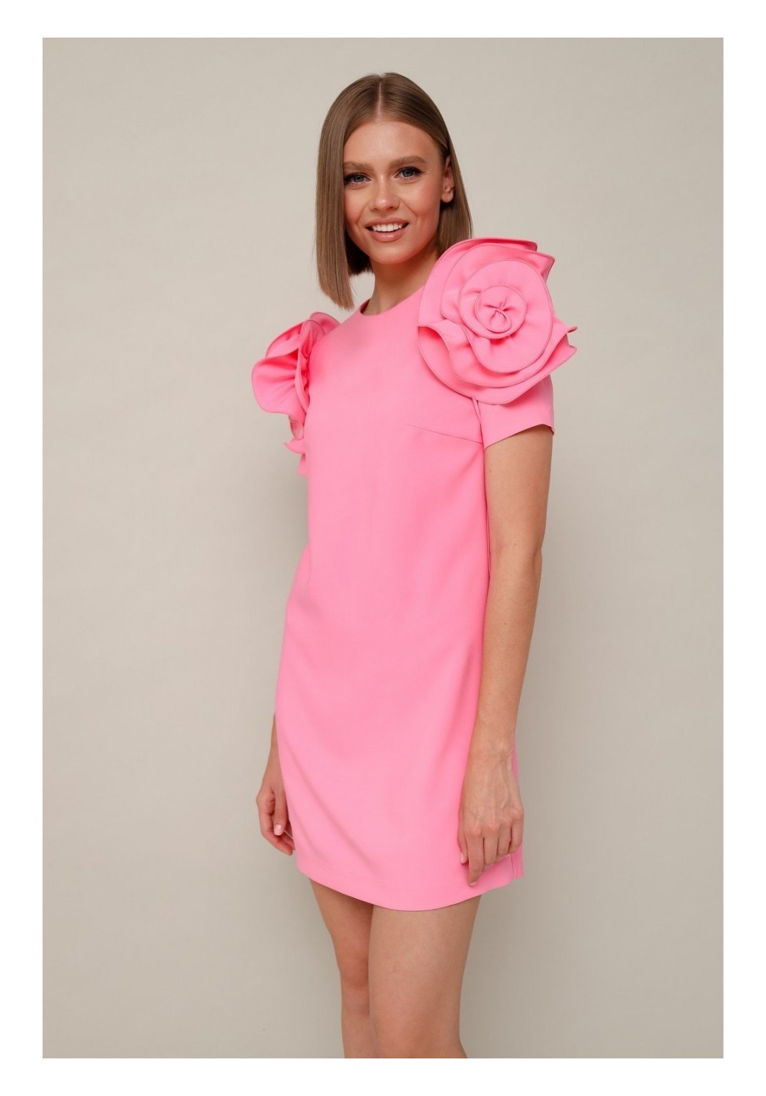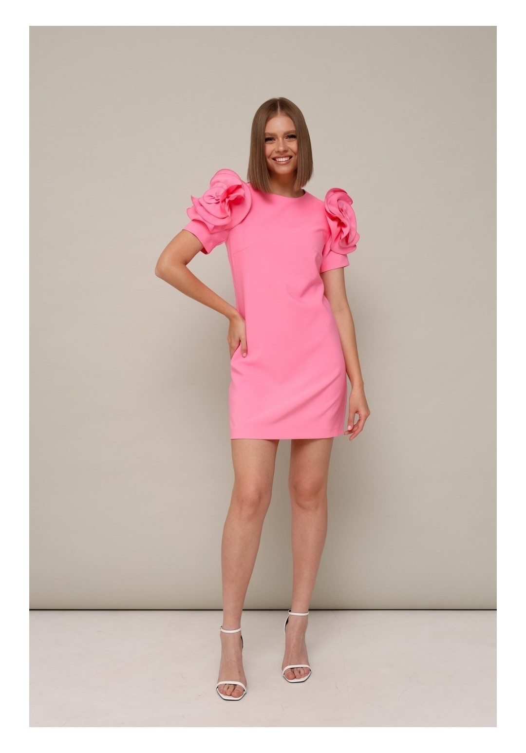 Платье А-образного силуэта. Округлый вырез горловины. Втачные короткие рукава, декорированные элементами из основной ткани в виде цветка. Застежка по спинке в среднем шве на потайную молнию. Платье без подкладки.