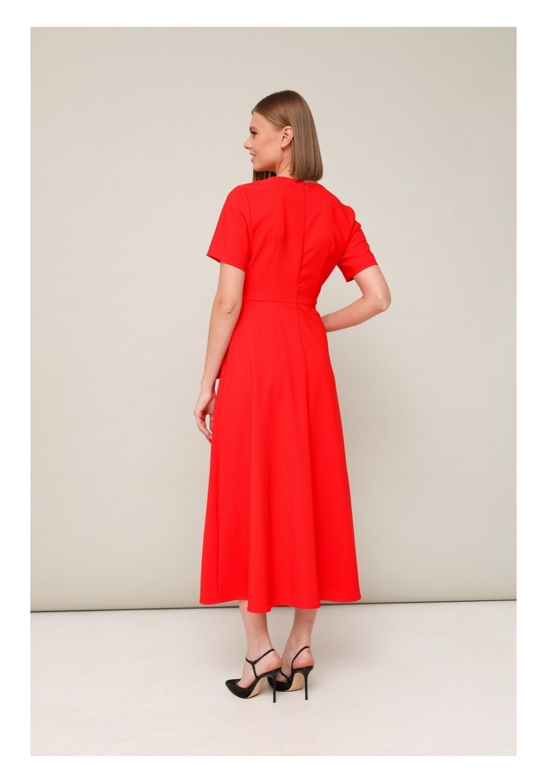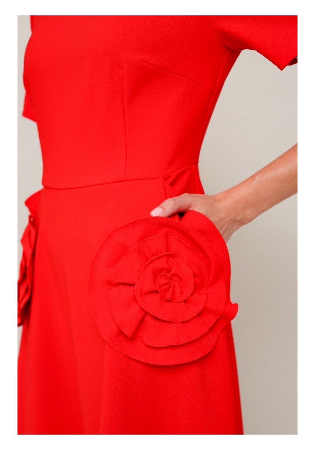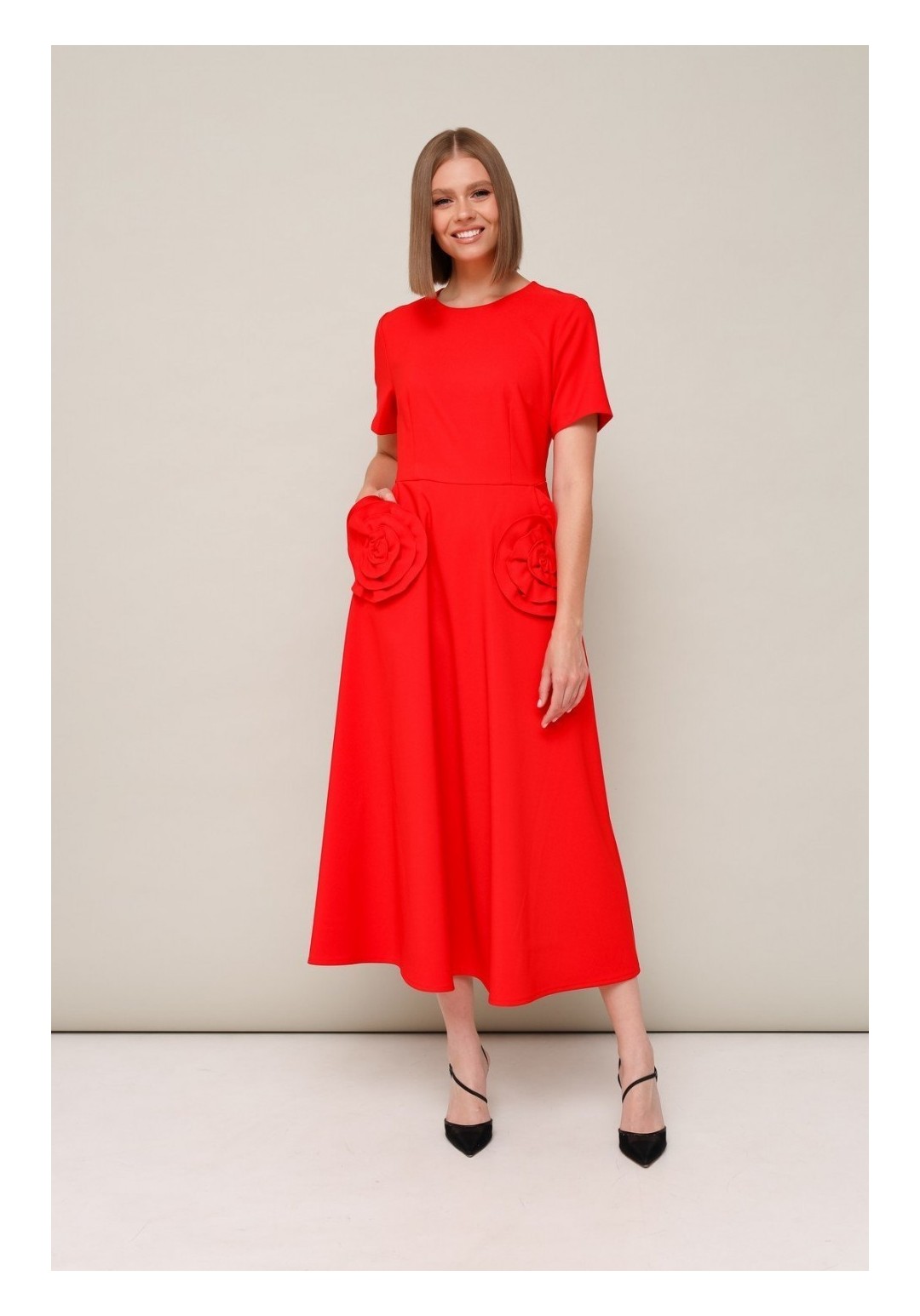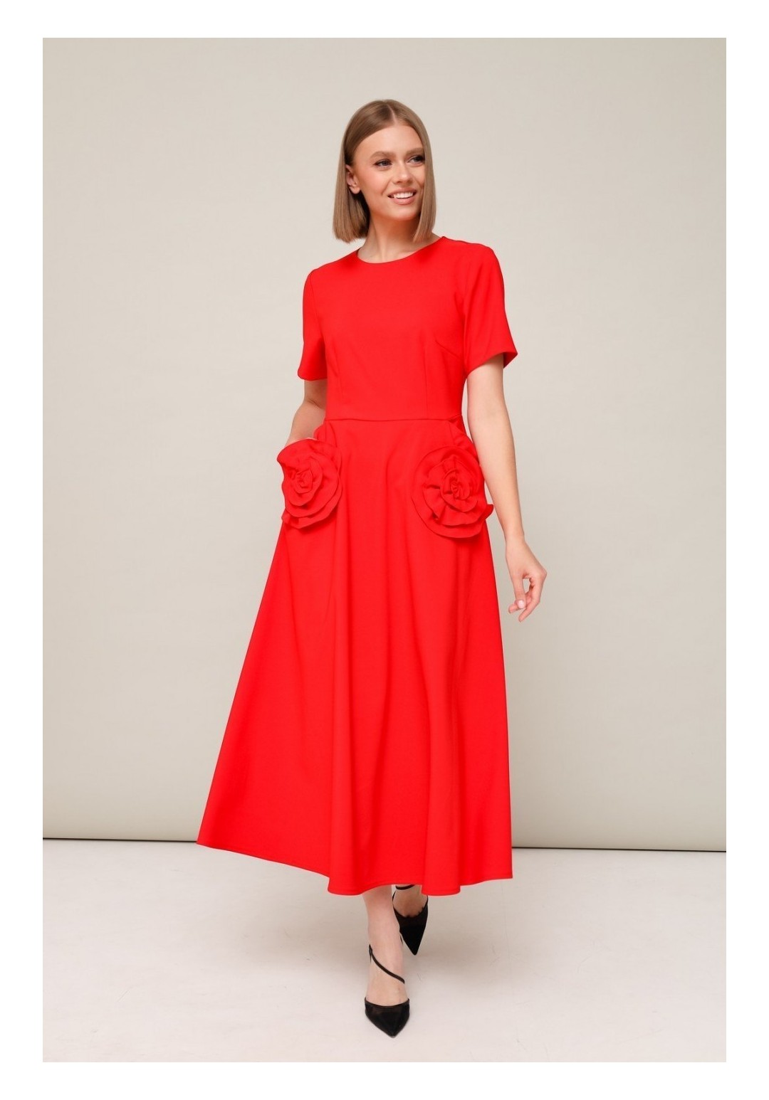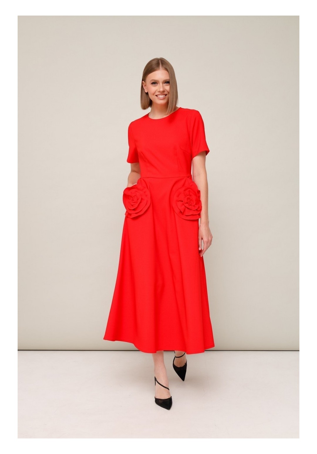 Эффектное платье, отрезное по линии талии с юбкой А-образного силуэта. Горловина округлой формы. Боковые наклонные карманы, декорированные элементами из основной ткани в виде цветка. Застежка по спинке в среднем шве на потайную молнию. Платье без подкладки.