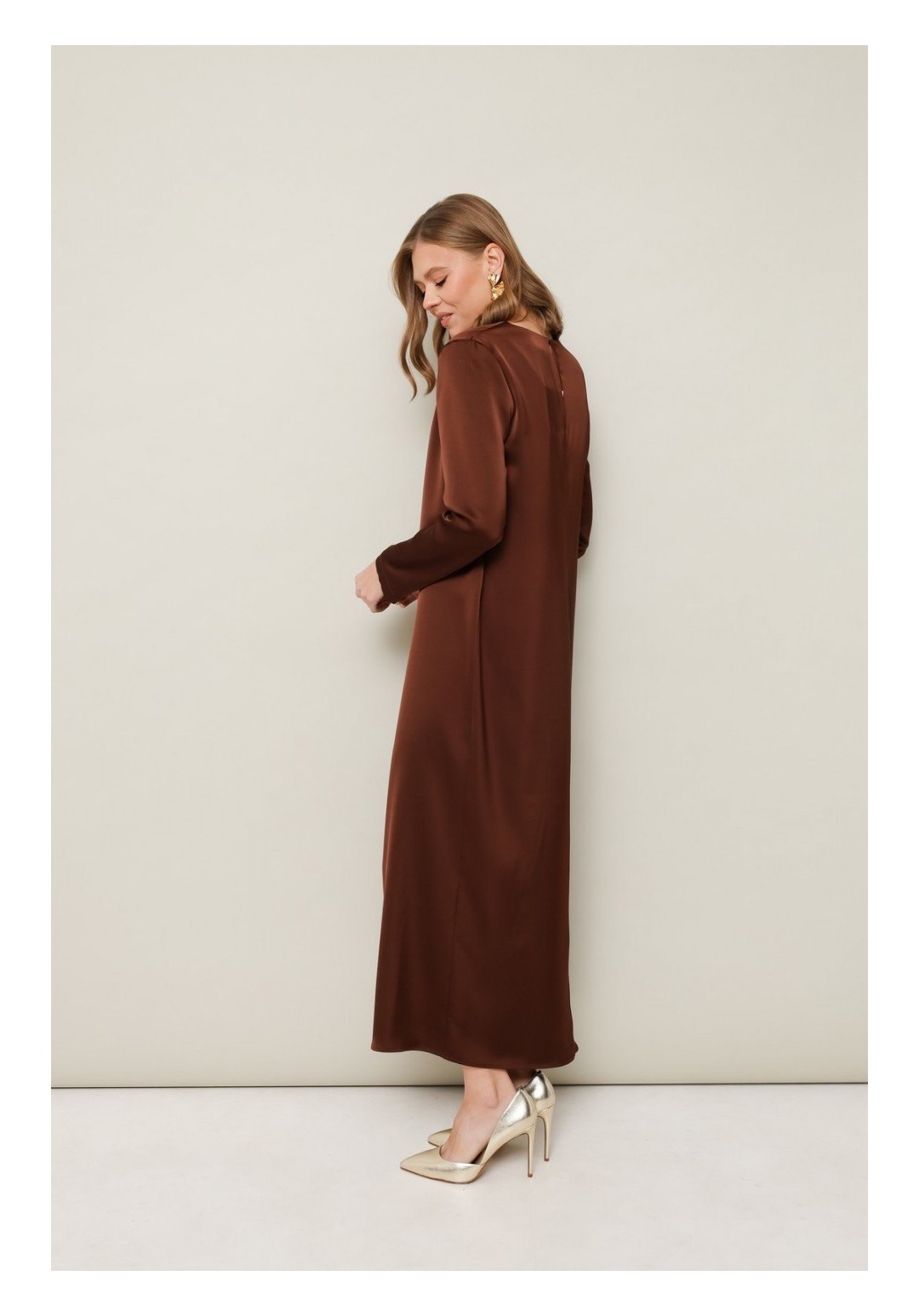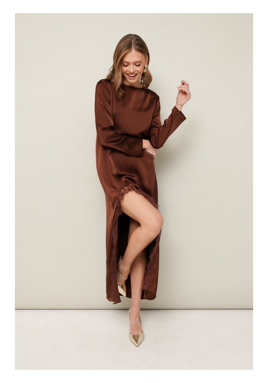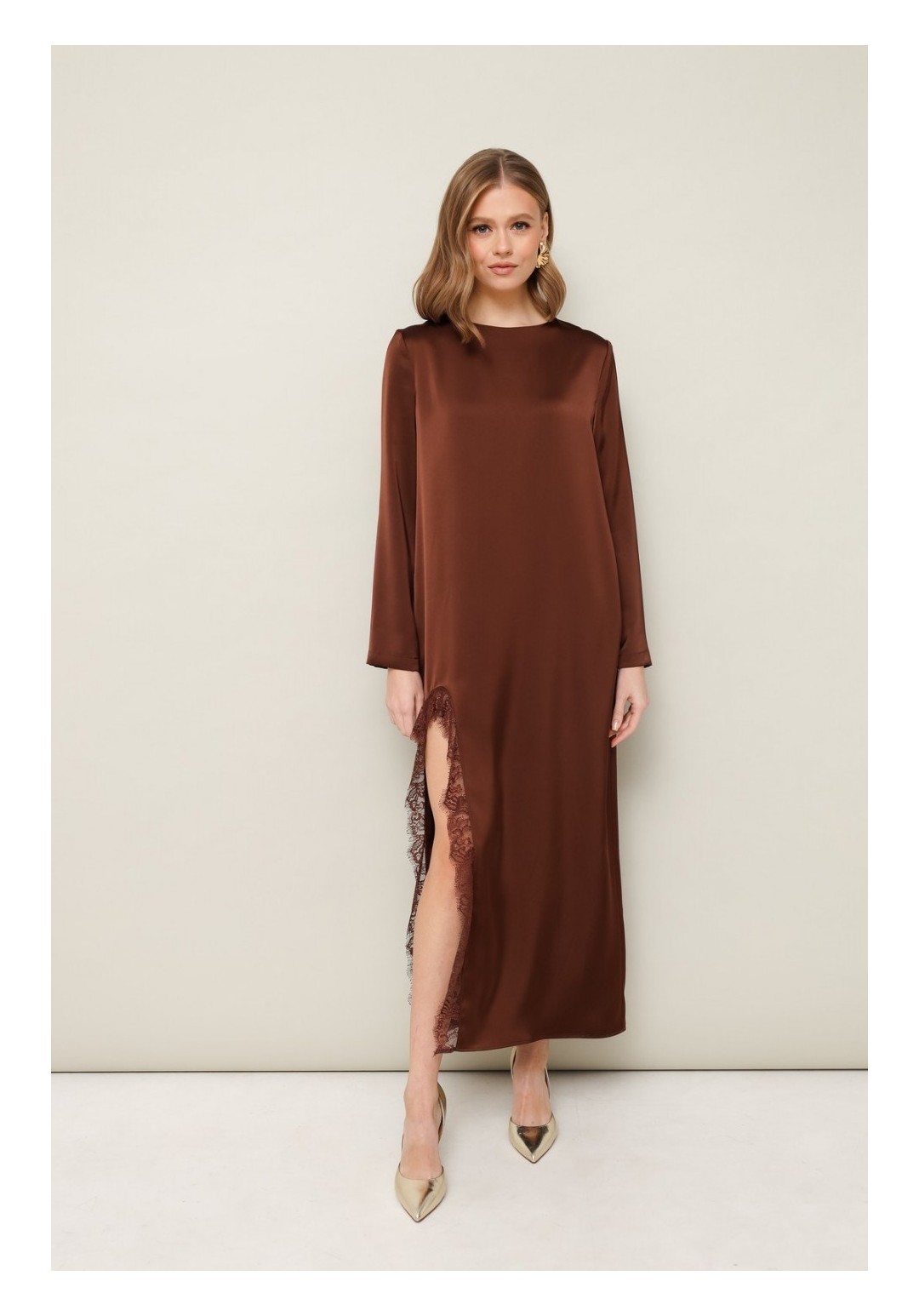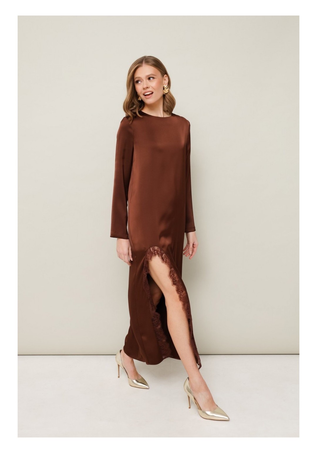Стильное платье прямого силуэта, выполнено из струящейся ткани с благородным матовым блеском. Округлый вырез горловины. Рукава длинные втачные. Внизу обработан высокий разрез с кружевной отделкой. Застёжка по спинке в среднем шве капля на пуговицу и навесную петлю.