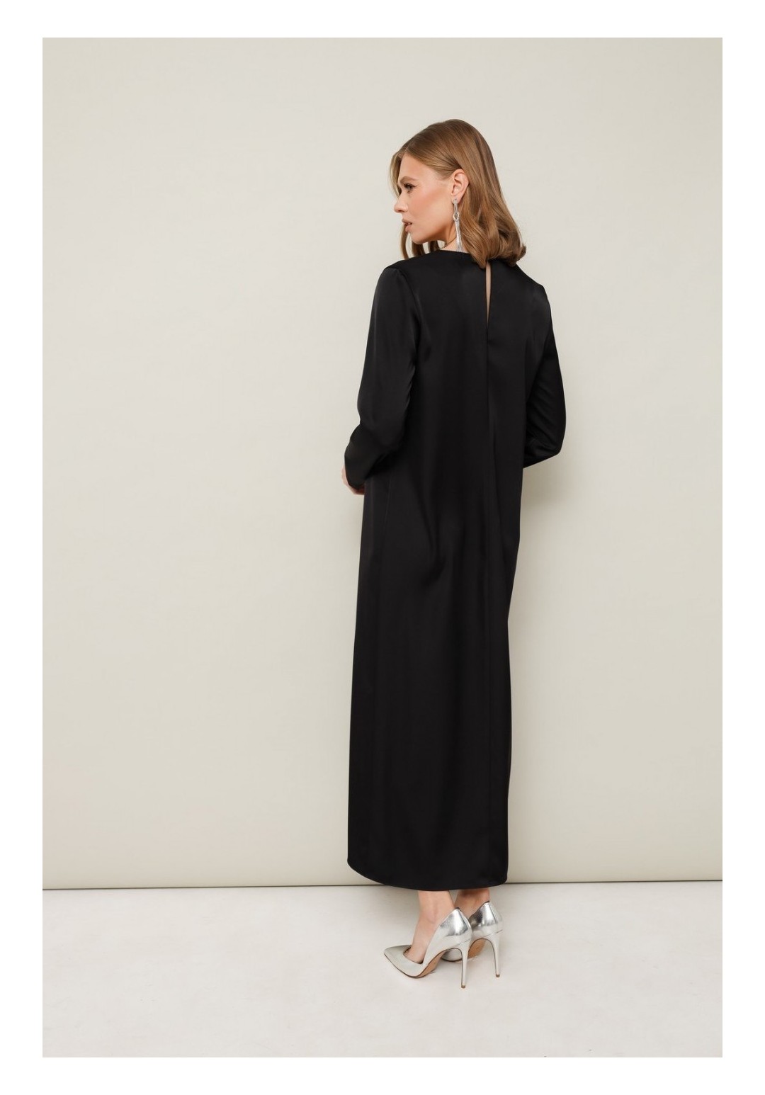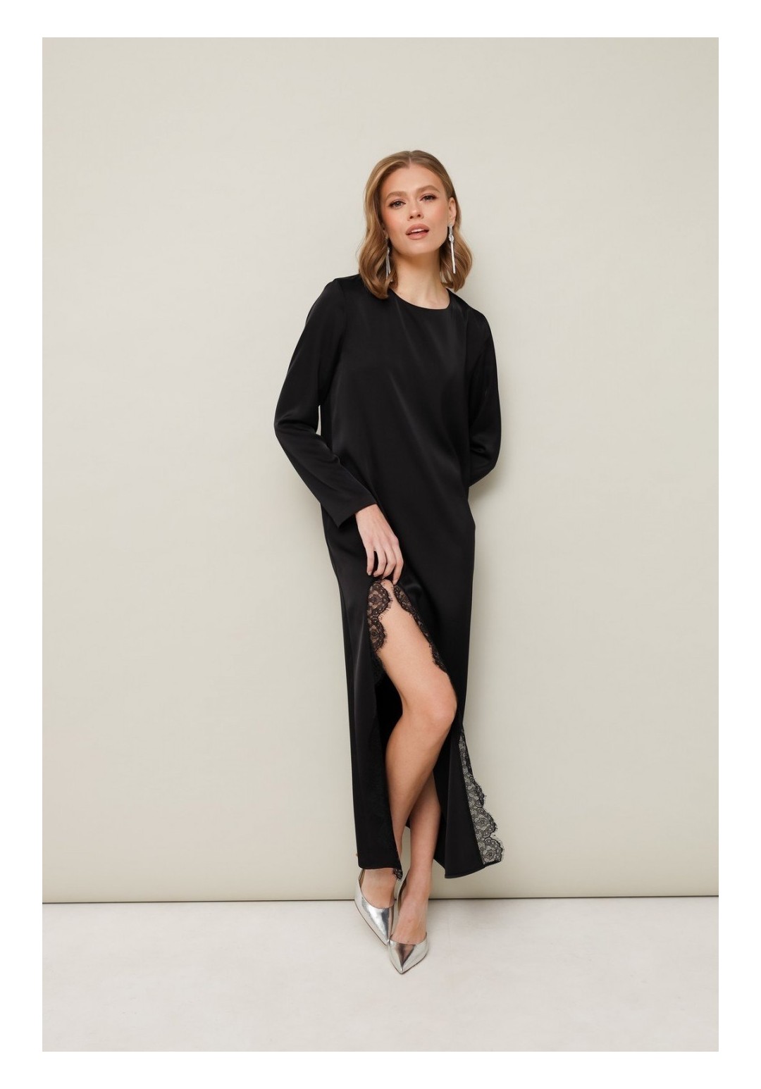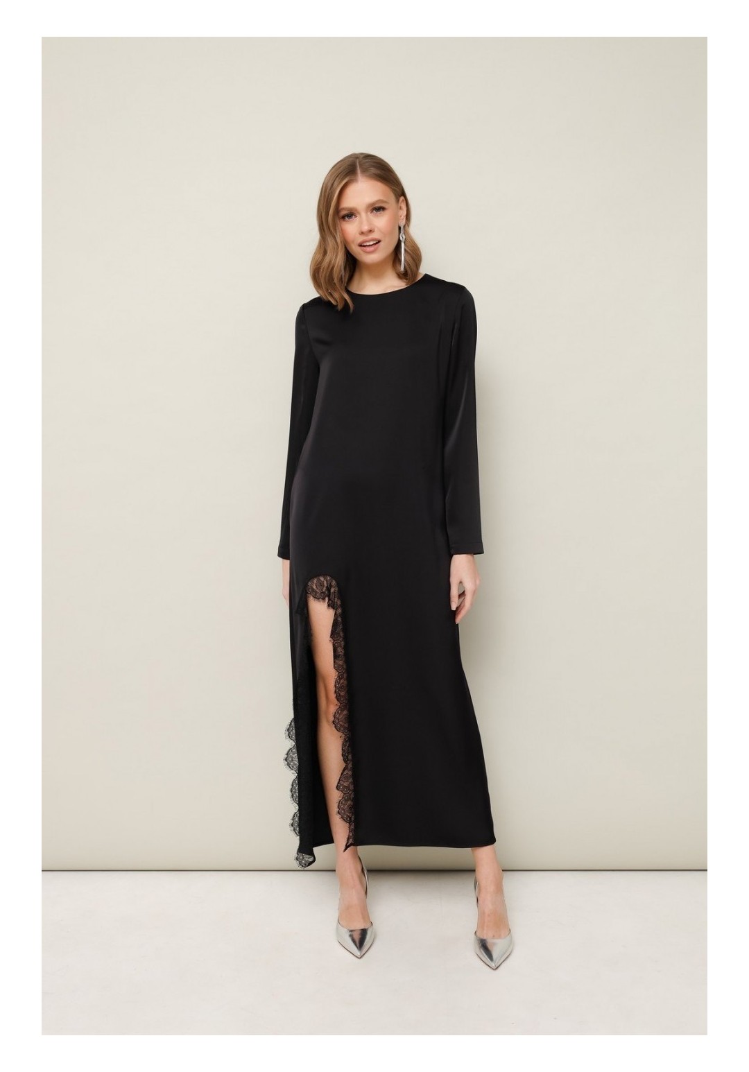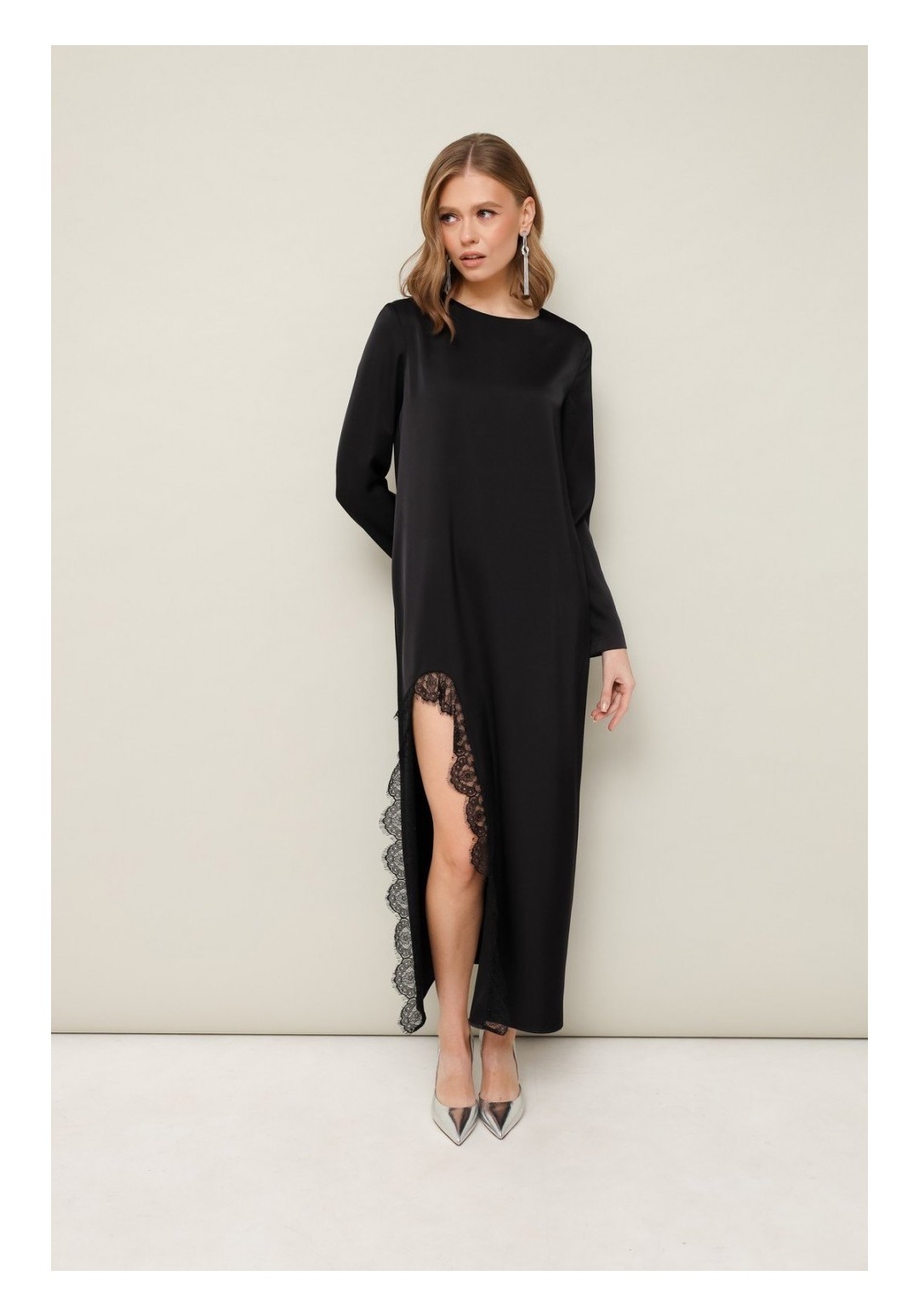 Стильное платье прямого силуэта, выполнено из струящейся ткани с благородным матовым блеском. Округлый вырез горловины. Рукава длинные втачные. Внизу обработан высокий разрез с кружевной отделкой. Застёжка по спинке в среднем шве капля на пуговицу и навесную петлю.