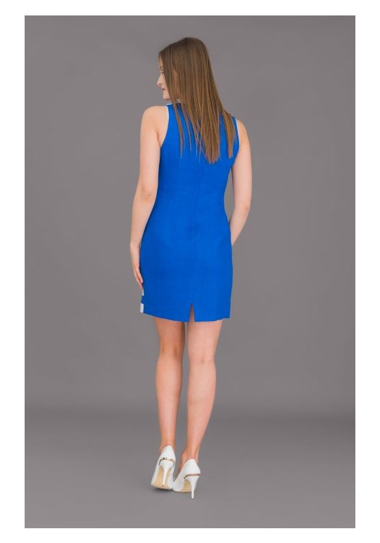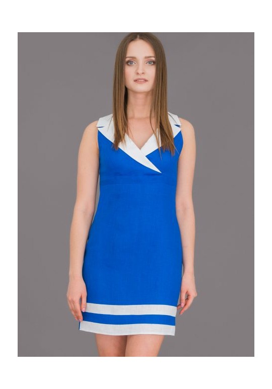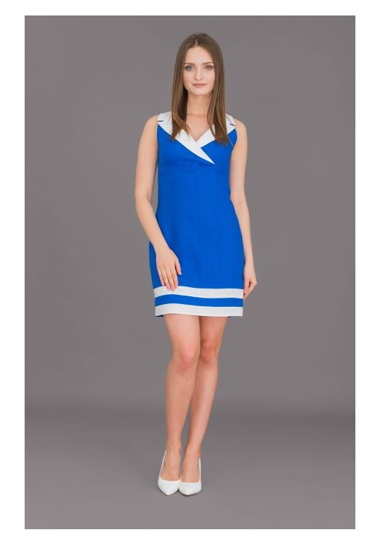 Строгое платье полуприлегающего силуэта с подрезом под грудью и втачным полупоясом. V-образный вырез горловины с заходом и отложным воротником. Для удобства по спинке потайная молния и открытая шлица. Синка однотонная. Белые полосы по низу изделия и белый воротник освежают и напоминают нам о море и прогулках на катере в жаркий летний день.