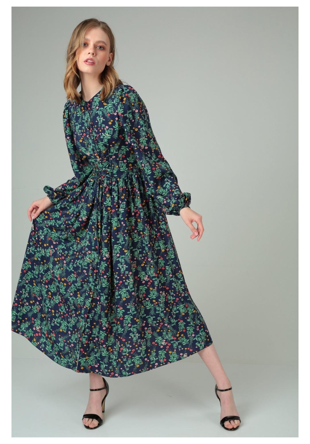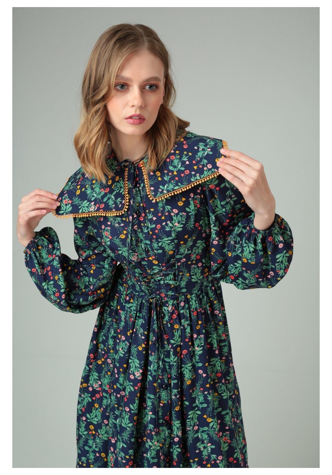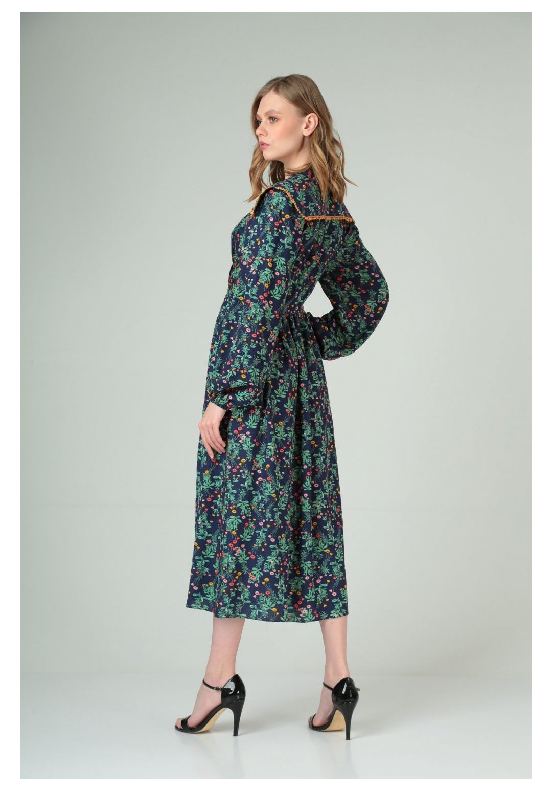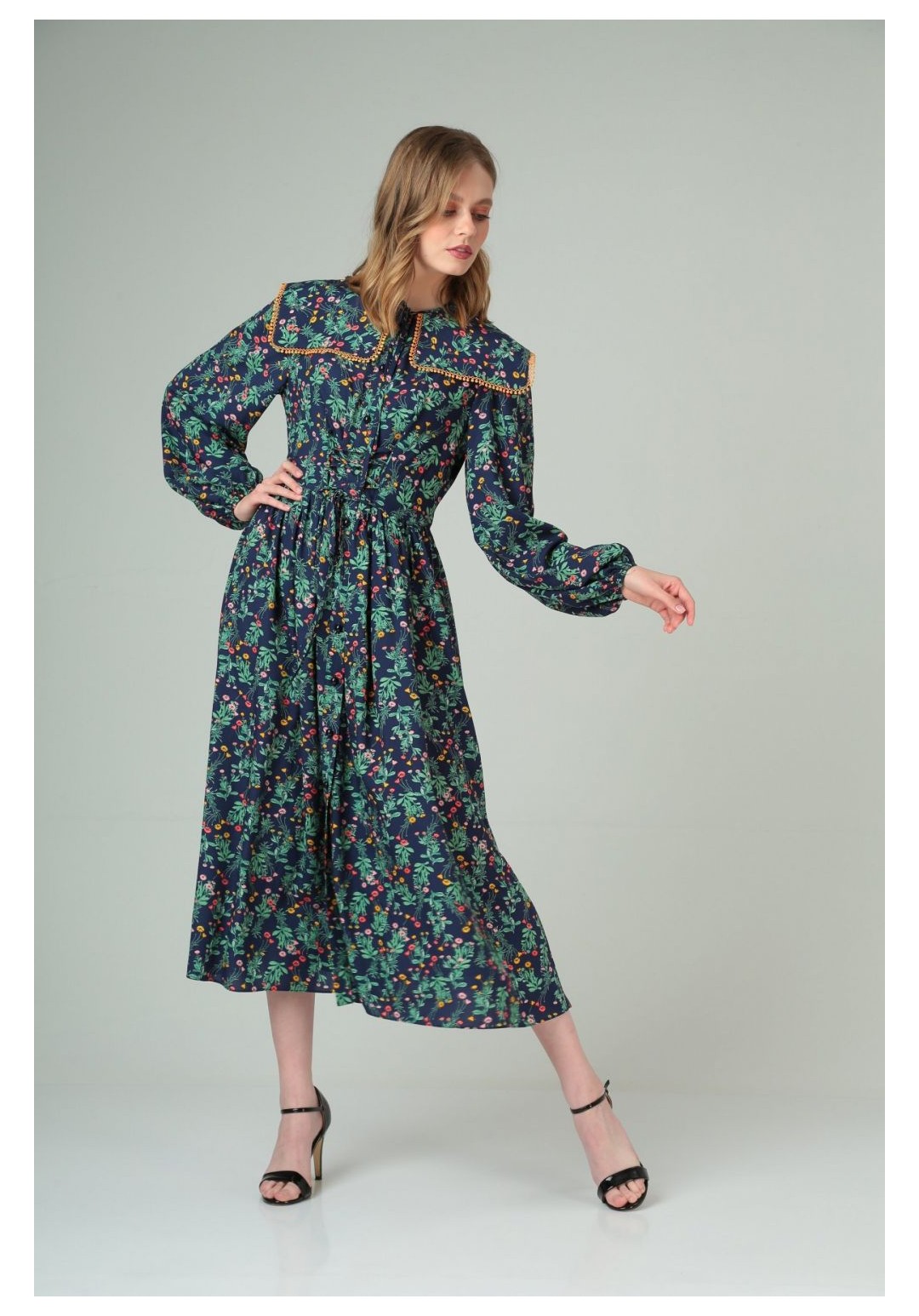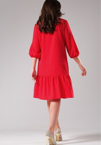 Платье женское повседневное из прозрачного шифона. Платье отрезное по линии талии. Перед и спинка с талиевыми выточками, с круглым вырезом. Перед платья с застежкой на планке на 10 петель-пуговиц. В выточках переда расположены по 4 навесных петли, в которые вставлен декоративный шнур.Съемный воротник отделан по краю декоротивной тесьмой. Застежка съемного воротника на 9 петель-пуговиц. Рукава втачные со сборкой. Юбка платья со сборкой по линии талии.