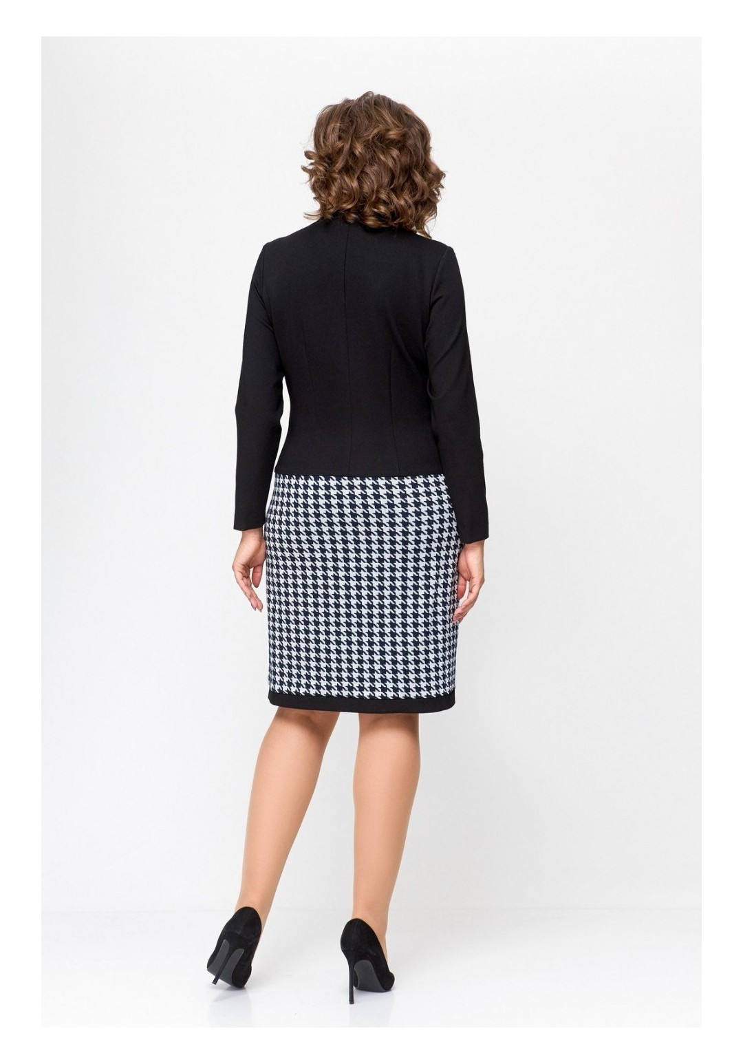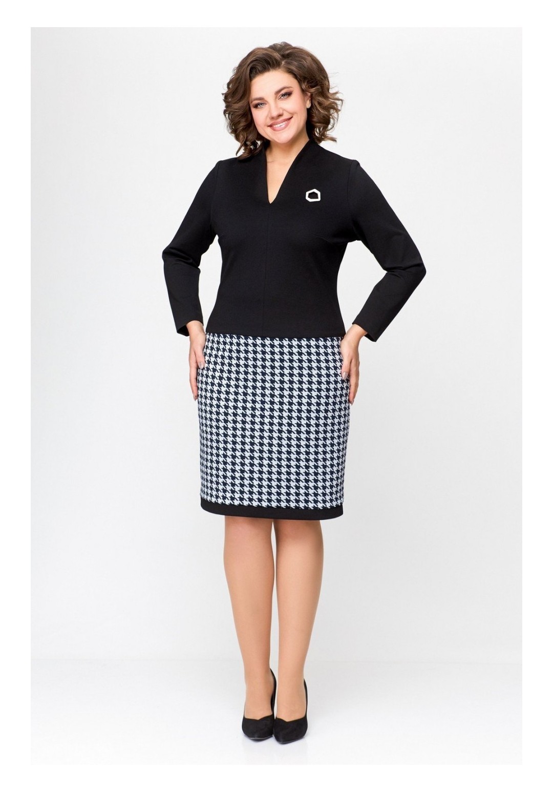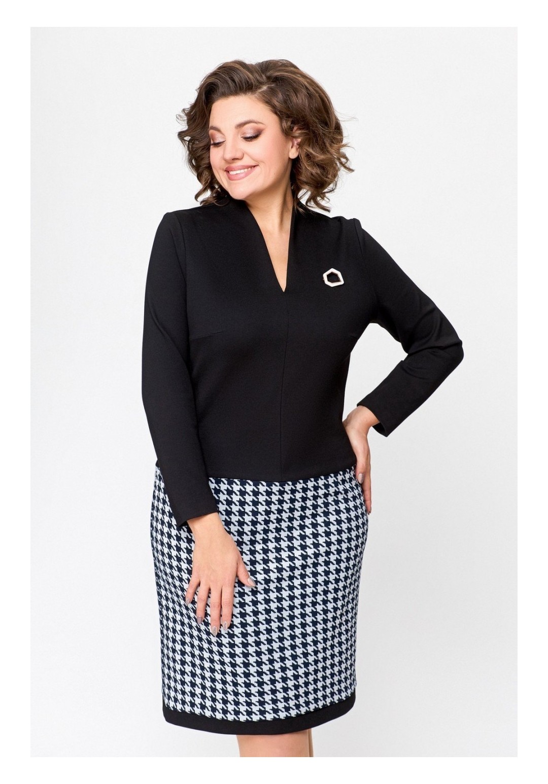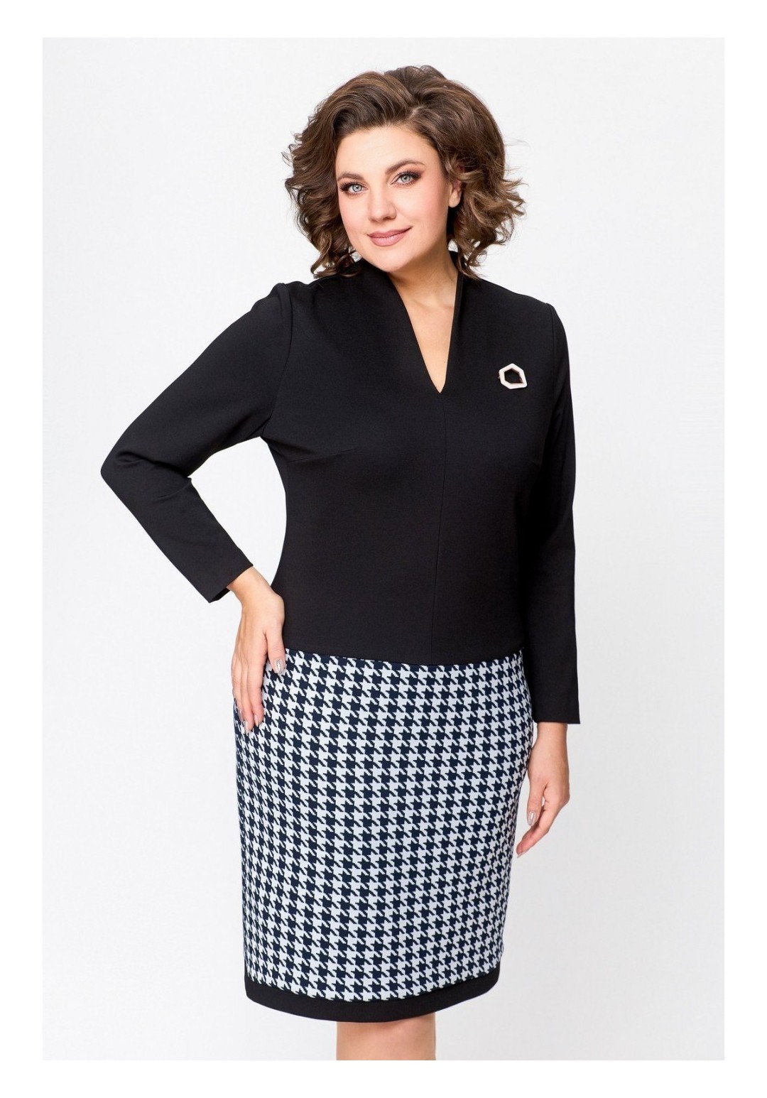 Платье женское полуприлегающего силуэта из эластичного трикотажного полотна. Платье отрезное ниже линии талии. Верхняя часть выполнена из однотонного полотна, нижняя часть – с дизайном гусиная лапка. Передняя часть лифа со средним швом и нагрудными вытачками. Спинка лифа со средним швом и талиевыми вытачками. По горловиле спинки обработана притачная стойка высотой 3 см, плавно переходящая в V-образный вырез по переду, обработанный обтачкой. Передняя и задняя части юбки цельнокроеные с отрезной планкой по низу из однотонной ткани шириной 3 см. Длина изделия 48,50,52 размер - 98 см. (±1 см). Длина изделия 54,56,58 размер - 100 см. (±1 см). В комплект входит декоративное украшение-брошь. В зависимости от партии украшение может меняться.