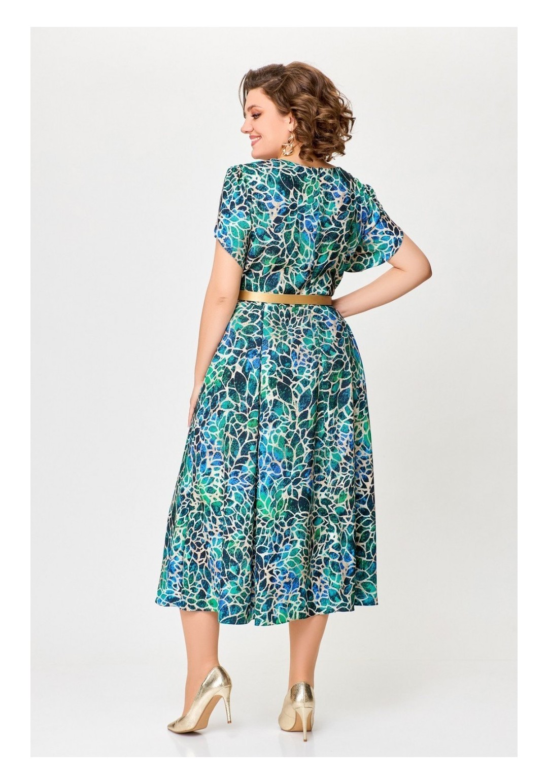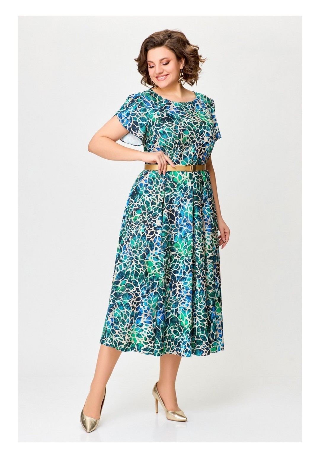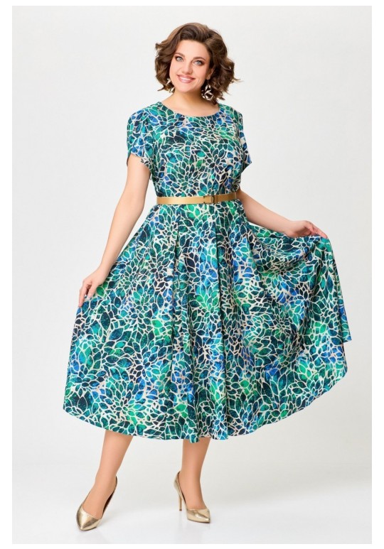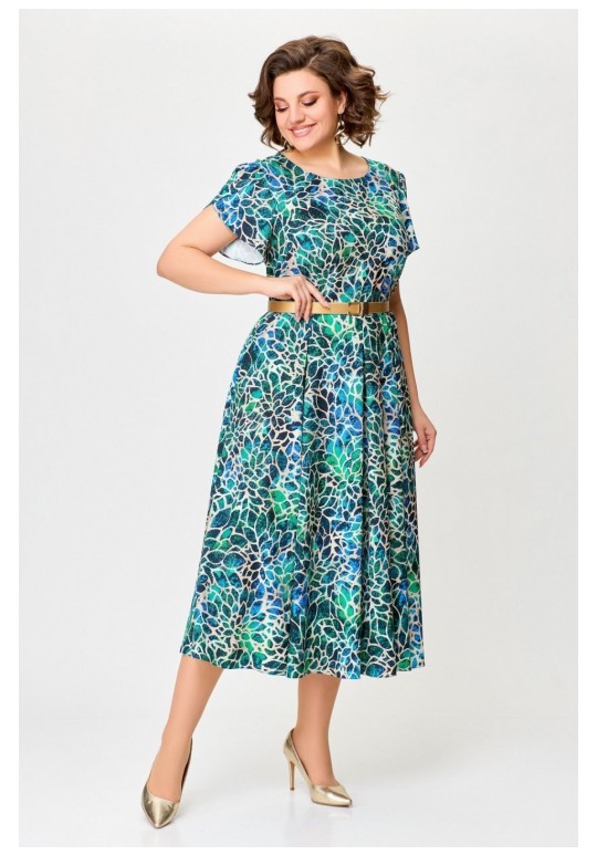 Платье из текстиля прилегающего силуэта. Платье отрезное по линии талии. По переду и спинке лифа расположены рельефы. Юбка расклешенная из шести клиньев со встречными складками по линии талии. В среднем шве спинки предусмотрена молния. Рукав втачной покроя тюльпан, длина рукава 15 см. В комплекте ремень с декоративной пряжкой. Длина изделия по спинке 120 см