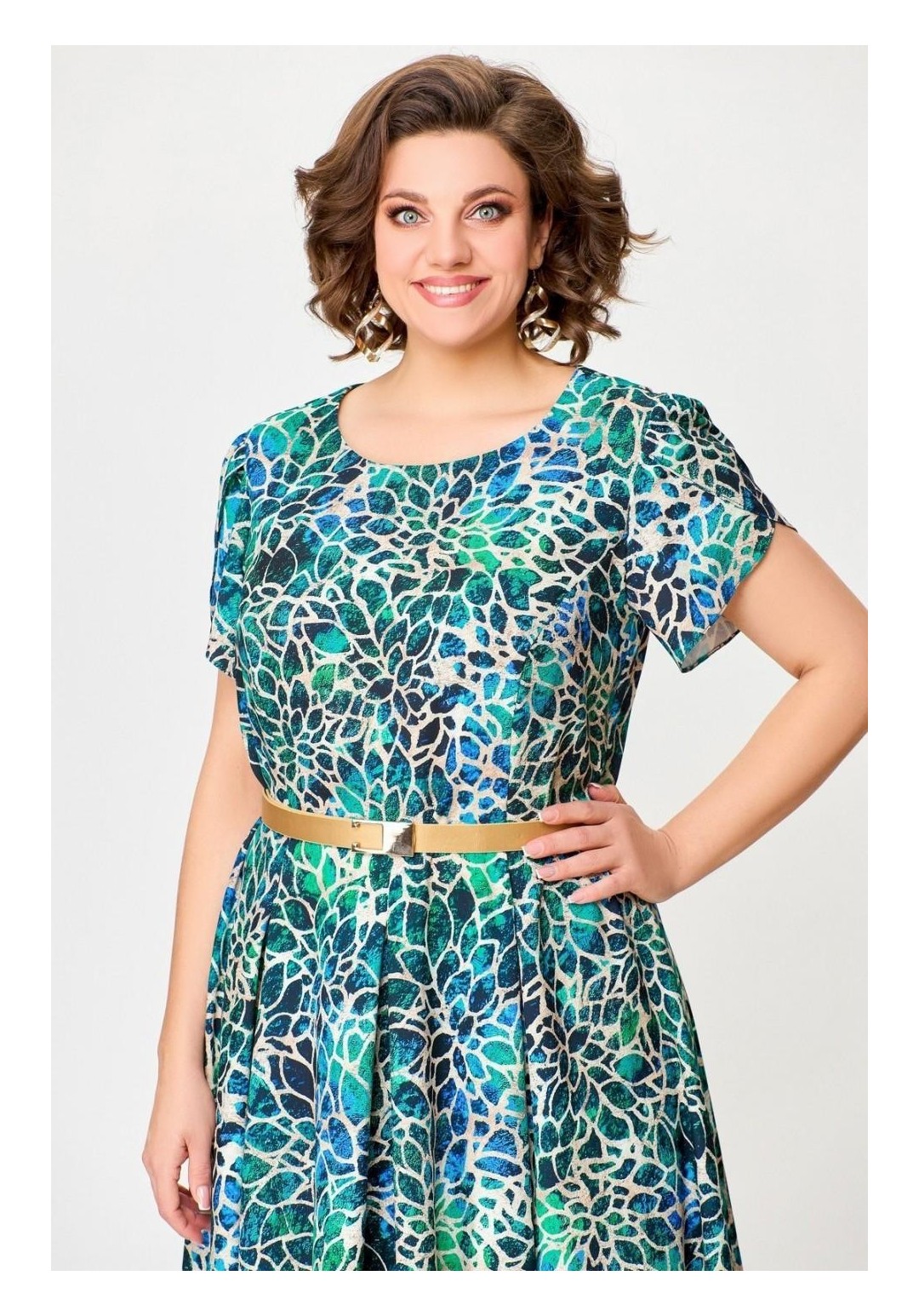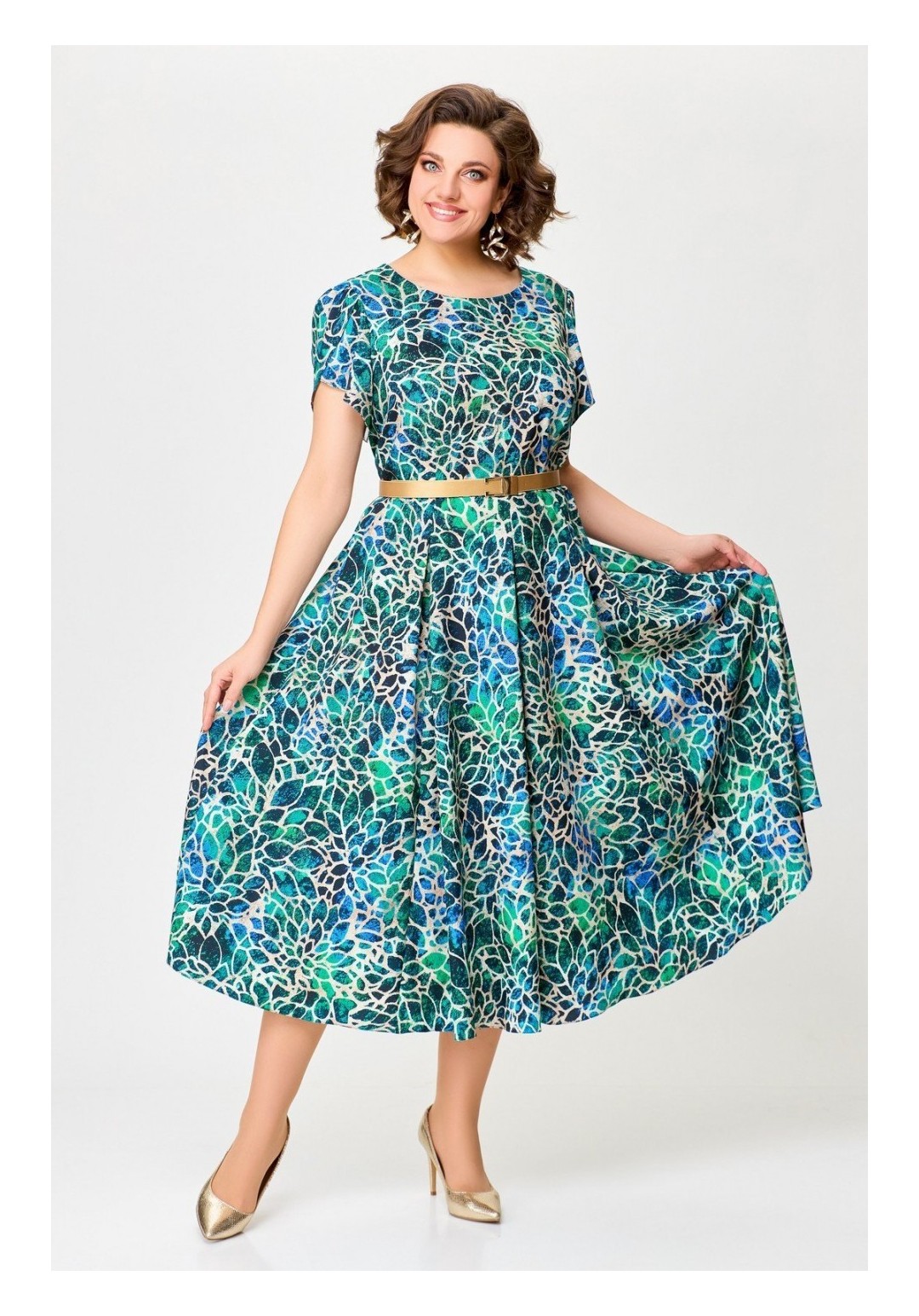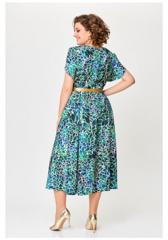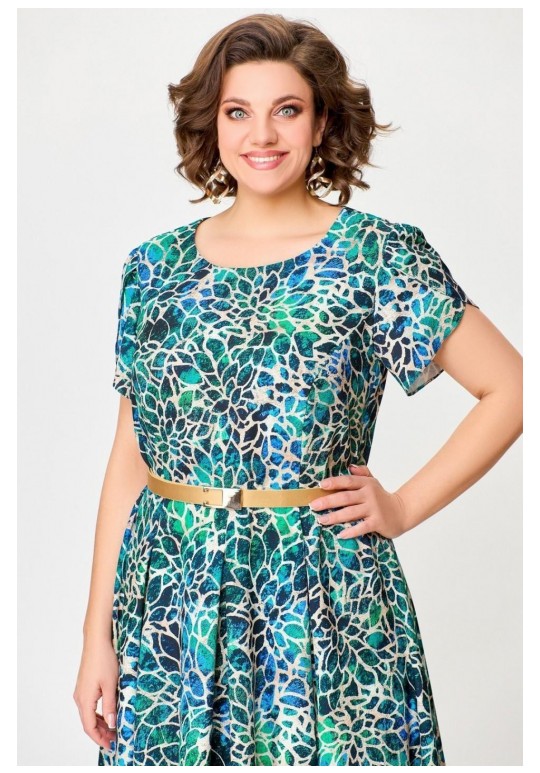 Платье из текстиля прилегающего силуэта. Платье отрезное по линии талии. По переду и спинке лифа расположены рельефы. Юбка расклешенная из шести клиньев со встречными складками по линии талии. В среднем шве спинки предусмотрена молния. Рукав втачной покроя тюльпан, длина рукава 15 см. В комплекте ремень с декоративной пряжкой. Длина изделия по спинке 120 см