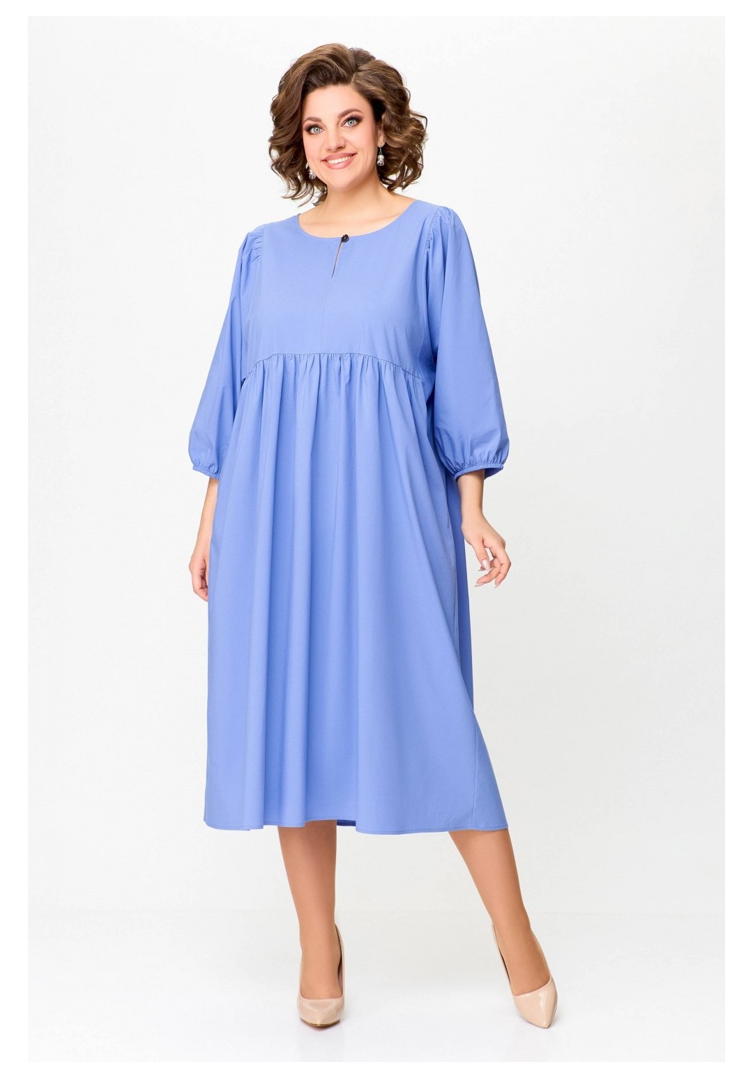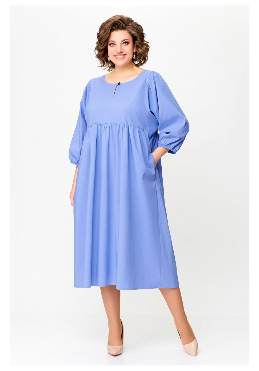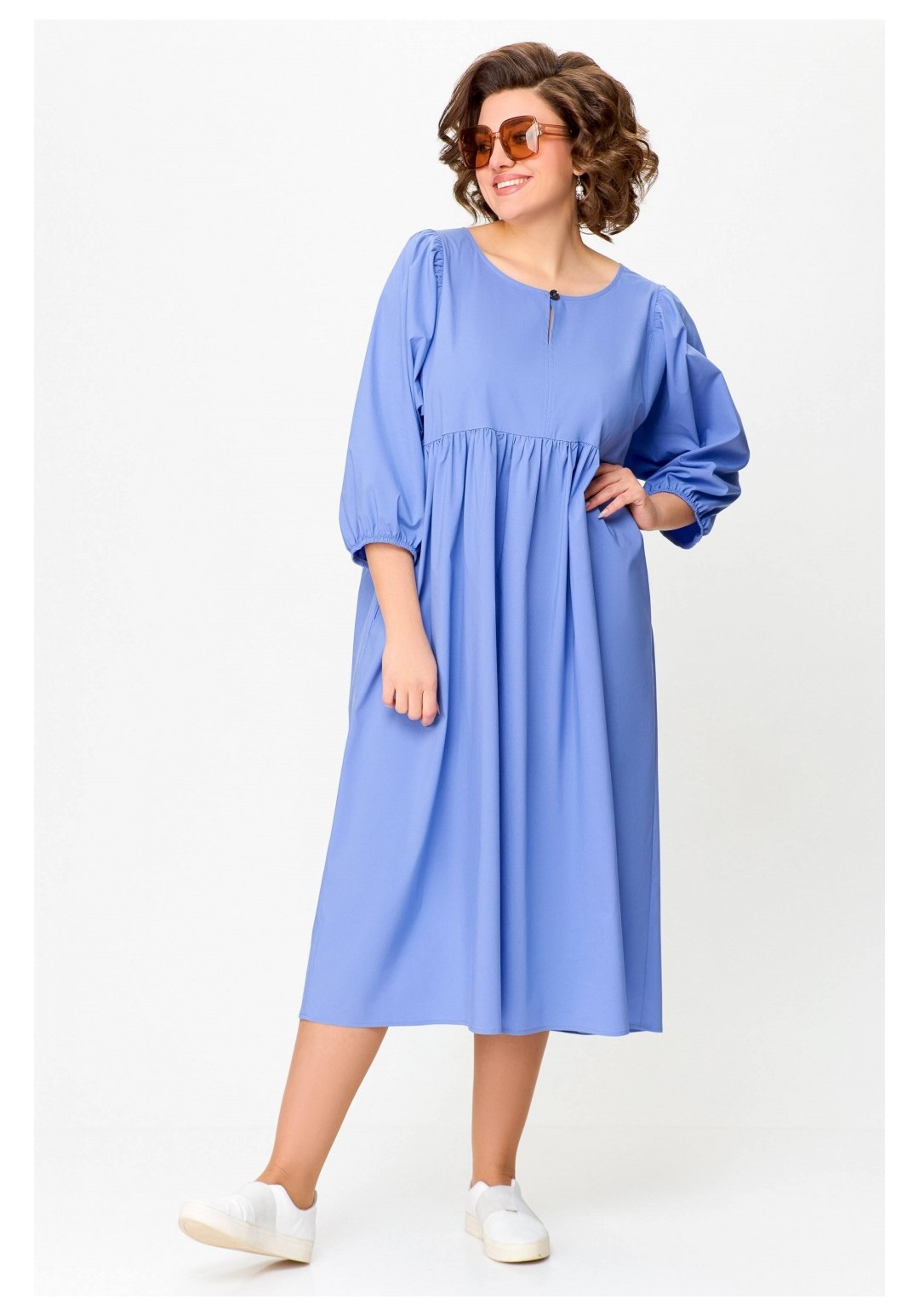 Платье прямого силуэта из эластичной хлопковой ткани. Платье отрезное по линии талии. Перед лифа со средним швом и разрезом с застёжкой по горловине на навесную петлю и декоративную пуговицу. Юбка со сборкой по линии талии и карманами в боковых швах. По низу юбки пришита фирменная эмблема SWАLLOW. Рукав цельнокроеный, отрезной по линии проймы, со сборкой по окату. Низ рукава собран на эластичную тесьму. Длина рукава в размерах 52-56 – 50 см; в размерах 58-62 – 52 см. Длина изделия по спинке 116 см