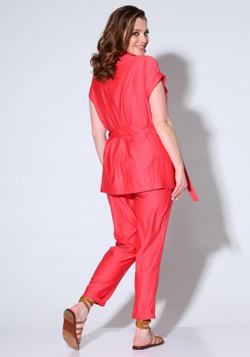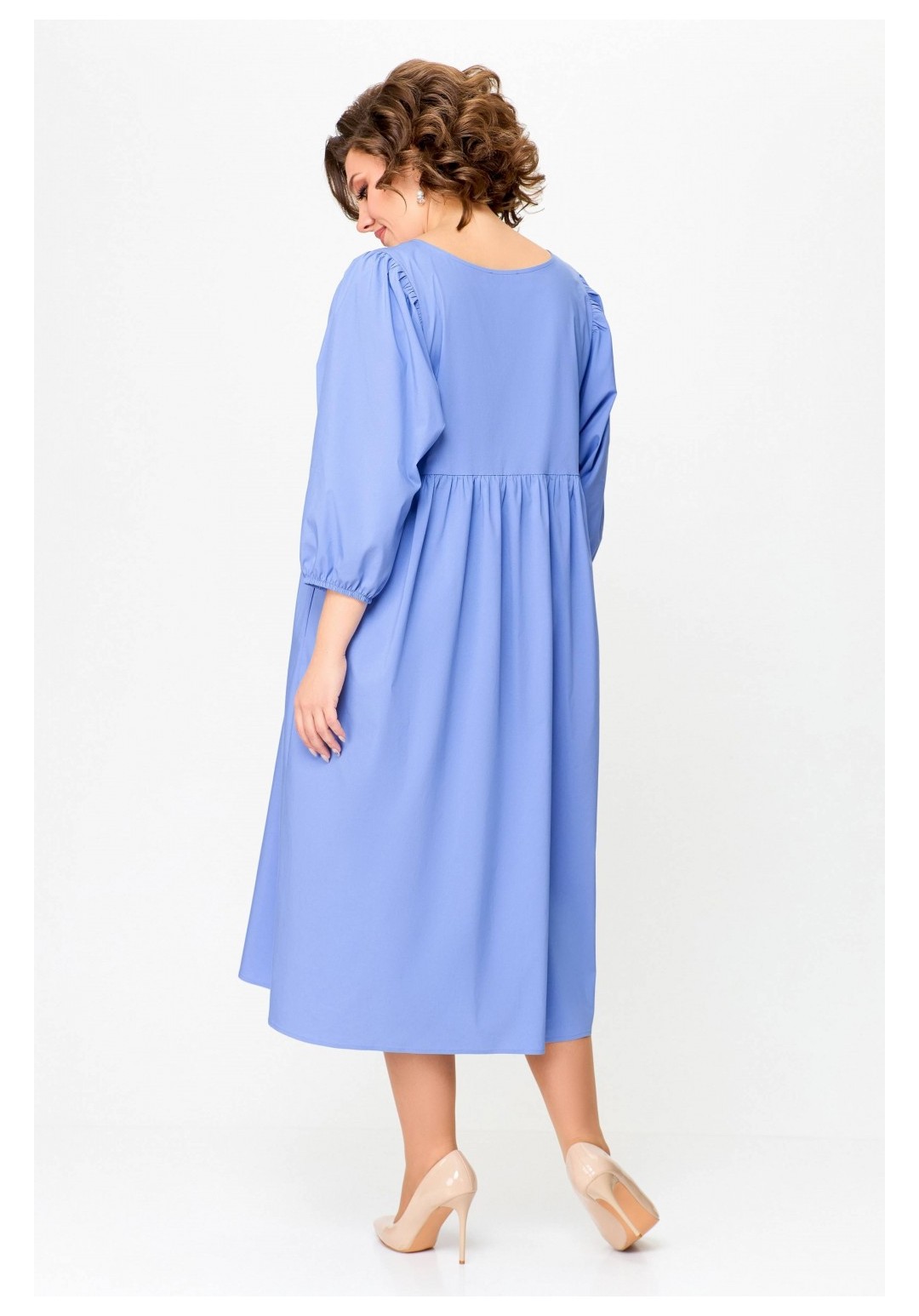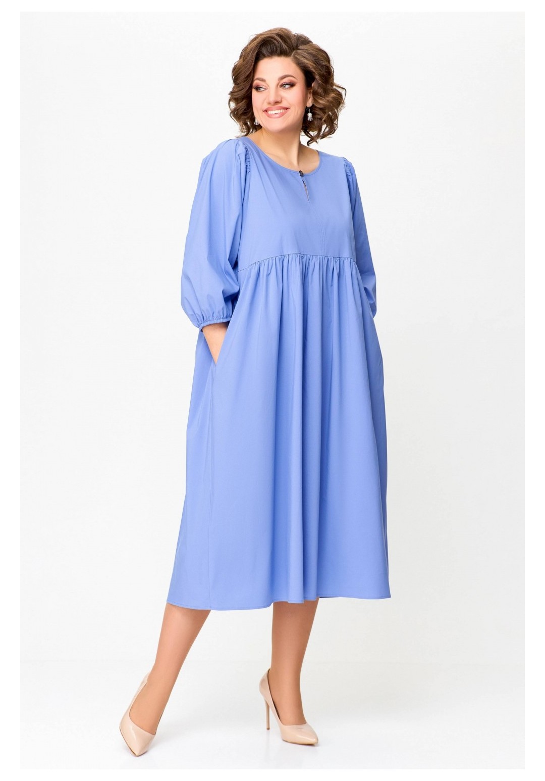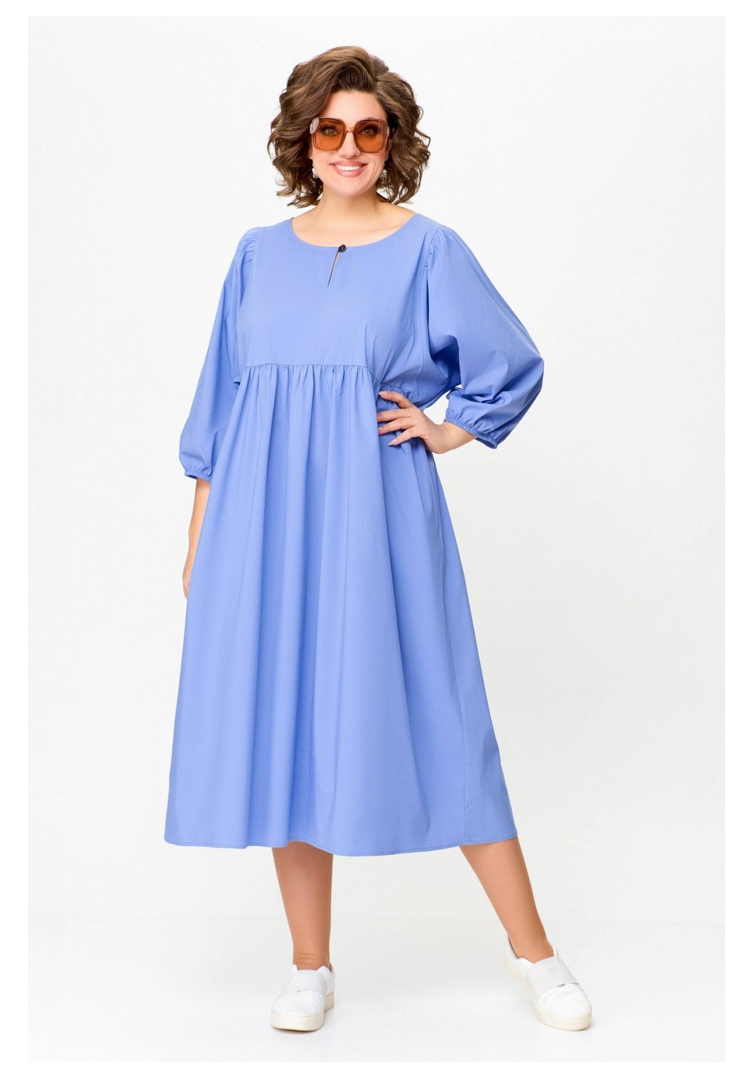 Платье прямого силуэта из эластичной хлопковой ткани. Платье отрезное по линии талии. Перед лифа со средним швом и разрезом с застёжкой по горловине на навесную петлю и декоративную пуговицу. Юбка со сборкой по линии талии и карманами в боковых швах. По низу юбки пришита фирменная эмблема SWАLLOW. Рукав цельнокроеный, отрезной по линии проймы, со сборкой по окату. Низ рукава собран на эластичную тесьму. Длина рукава в размерах 52-56 – 50 см; в размерах 58-62 – 52 см. Длина изделия по спинке 116 см