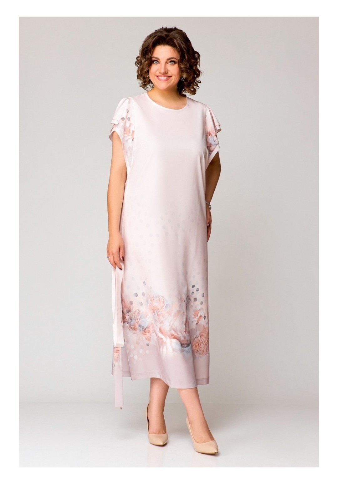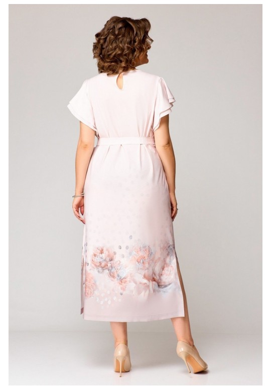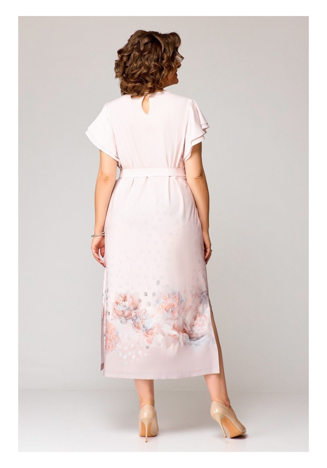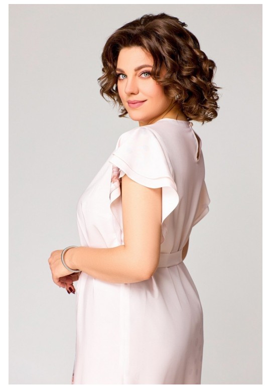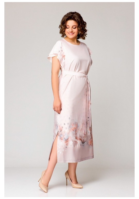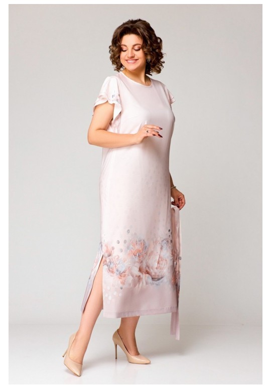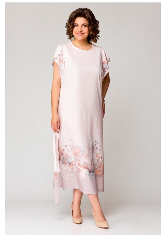 Платье женское из лёгкой ткани, прямого силуэта со съёмным поясом. По переду платья нагрудные выточки, спинка цельная. Вырез горловины овальный, сзади застёжка в виде капельки, на навесную петлю и пуговицу. В пройму вставлены двойные воланы, длина нижнего волана – 15см, верхнего – 12 см. В боковых швах платья разрезы длиной 32 см. Длина платья по спинке 127 см.(+-1 см)
