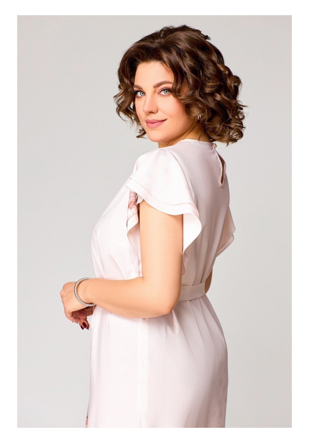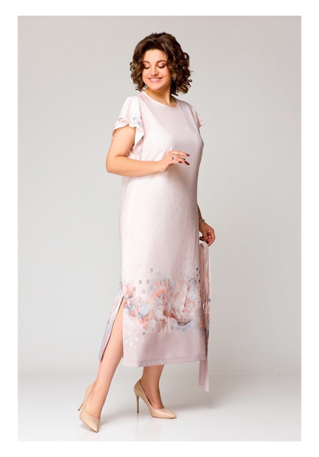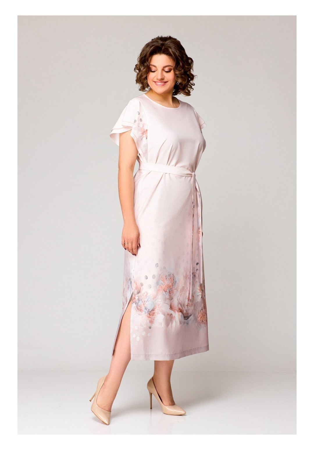Платье женское из лёгкой ткани, прямого силуэта со съёмным поясом. По переду платья нагрудные выточки, спинка цельная. Вырез горловины овальный, сзади застёжка в виде капельки, на навесную петлю и пуговицу. В пройму вставлены двойные воланы, длина нижнего волана – 15см, верхнего – 12 см. В боковых швах платья разрезы длиной 32 см. Длина платья по спинке 127 см.(+-1 см)