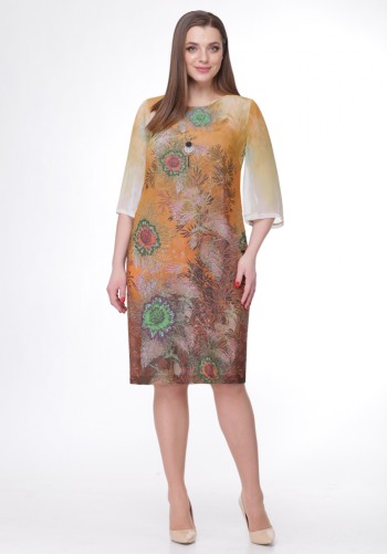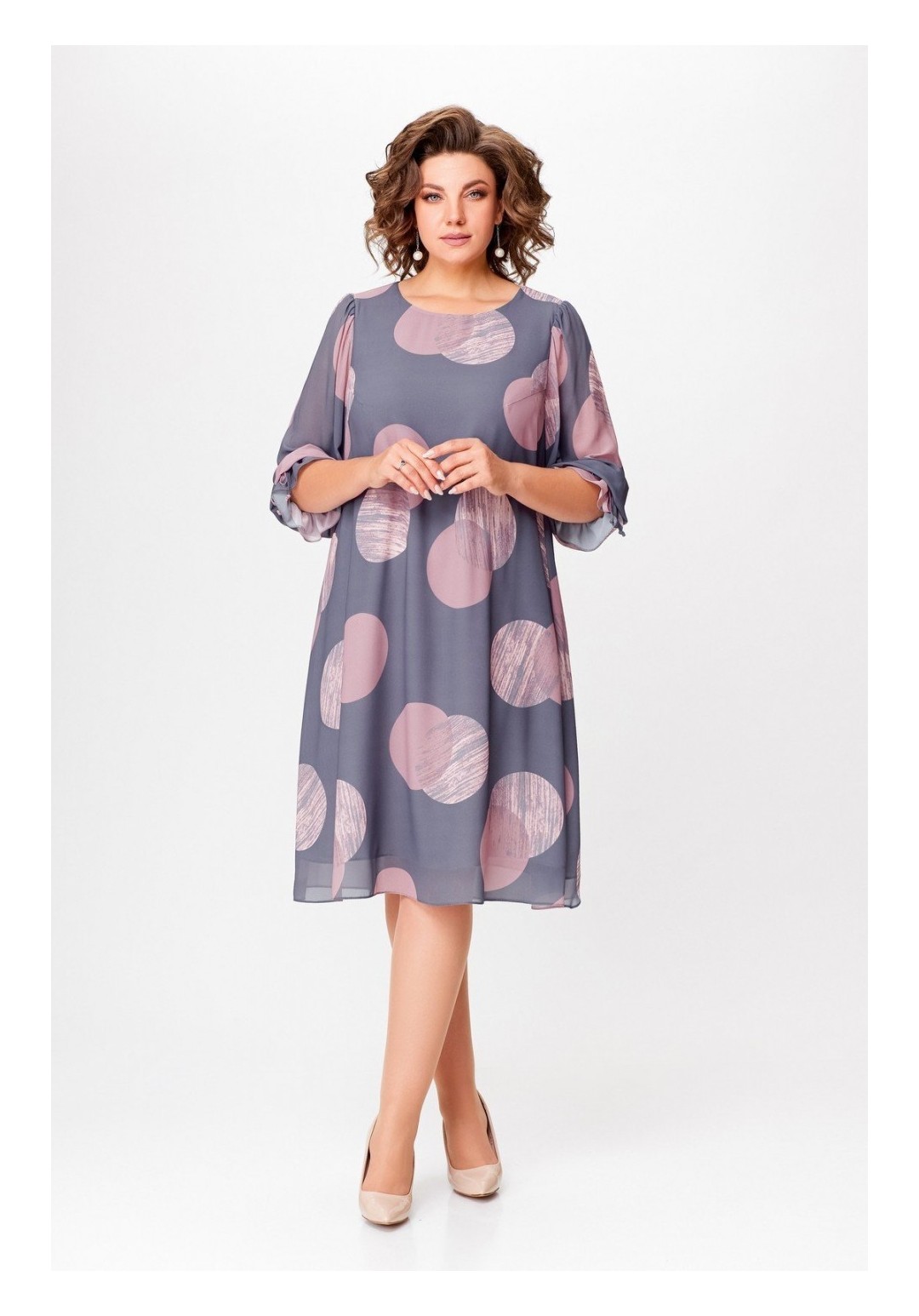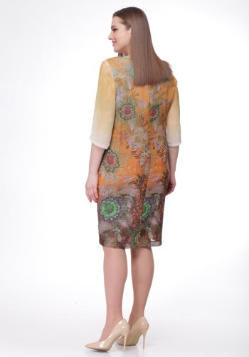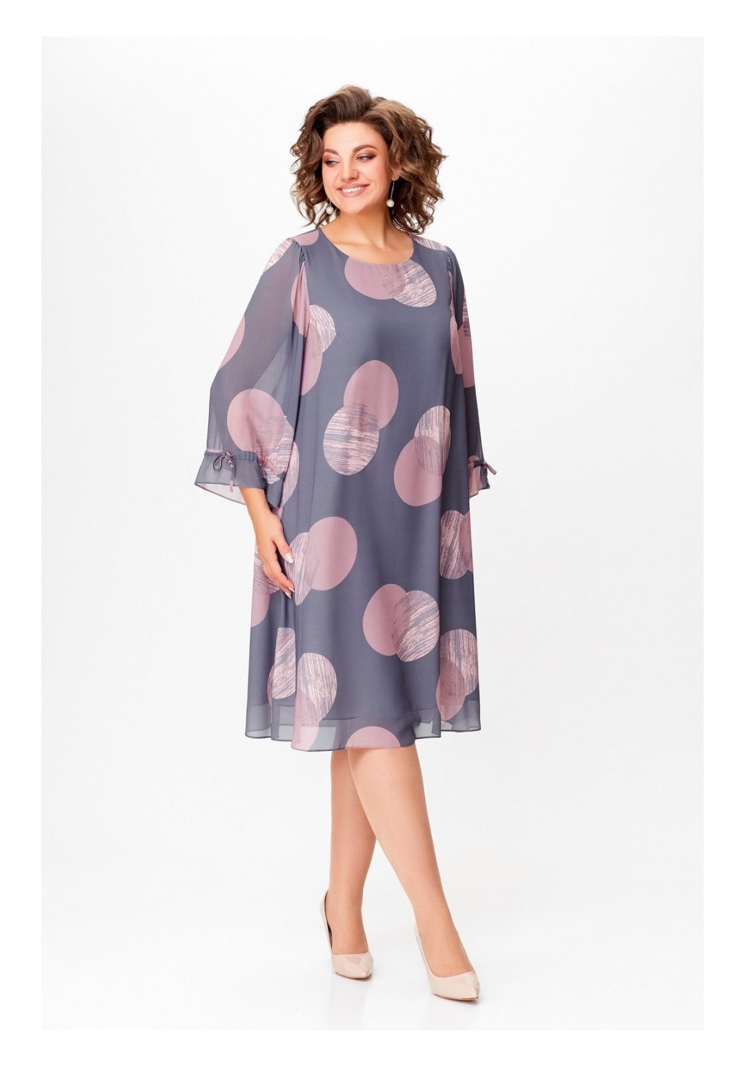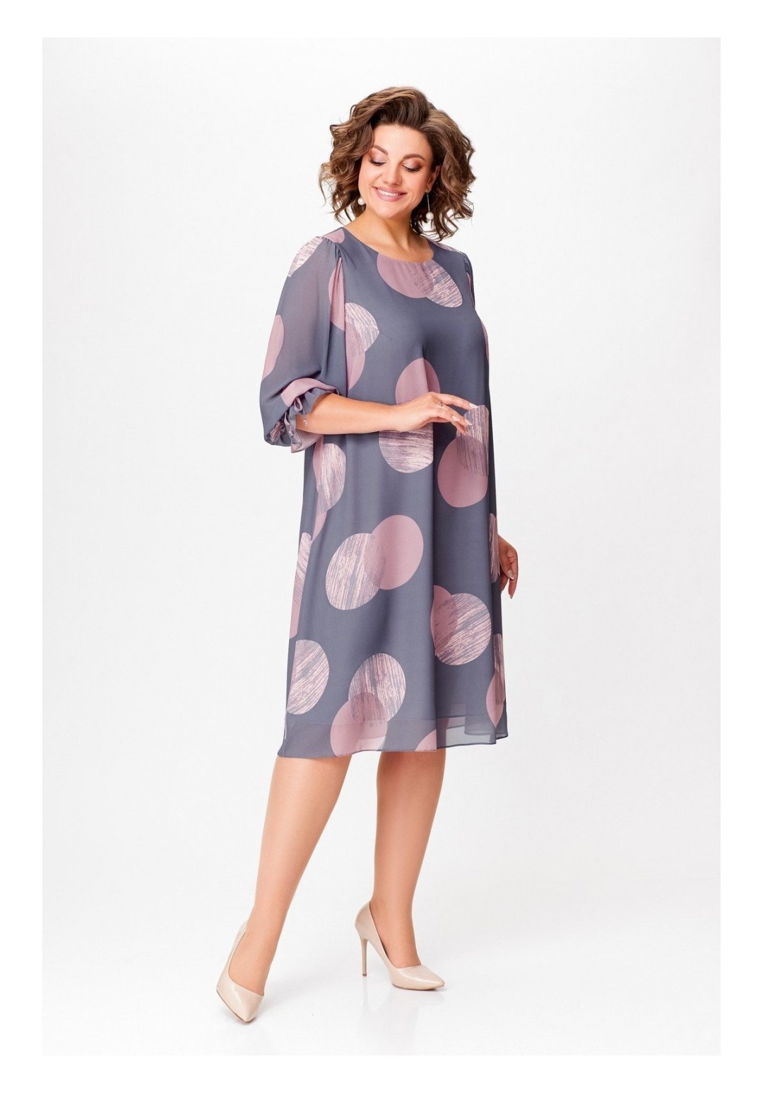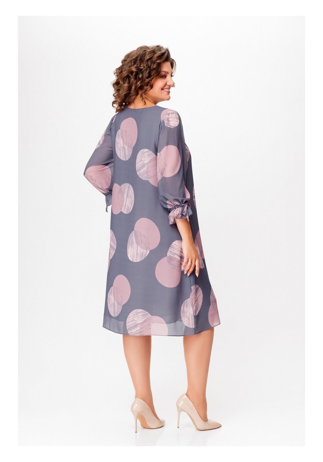 Платье А-силуэта, из струящейся шифоновой ткани на подкладке из шифона. По переду платья нагрудные выточки, выходящие из проймы, спинка цельная. Вырез горловины овальный. Рукав длиной 7/8, в нижней части кулиса с завязкой, которая регулирует ширину рукава и создаёт по низу рюшу. Длина платья по спинке 103 см.(+-1 см) Длина рукава регулируется завязкой.