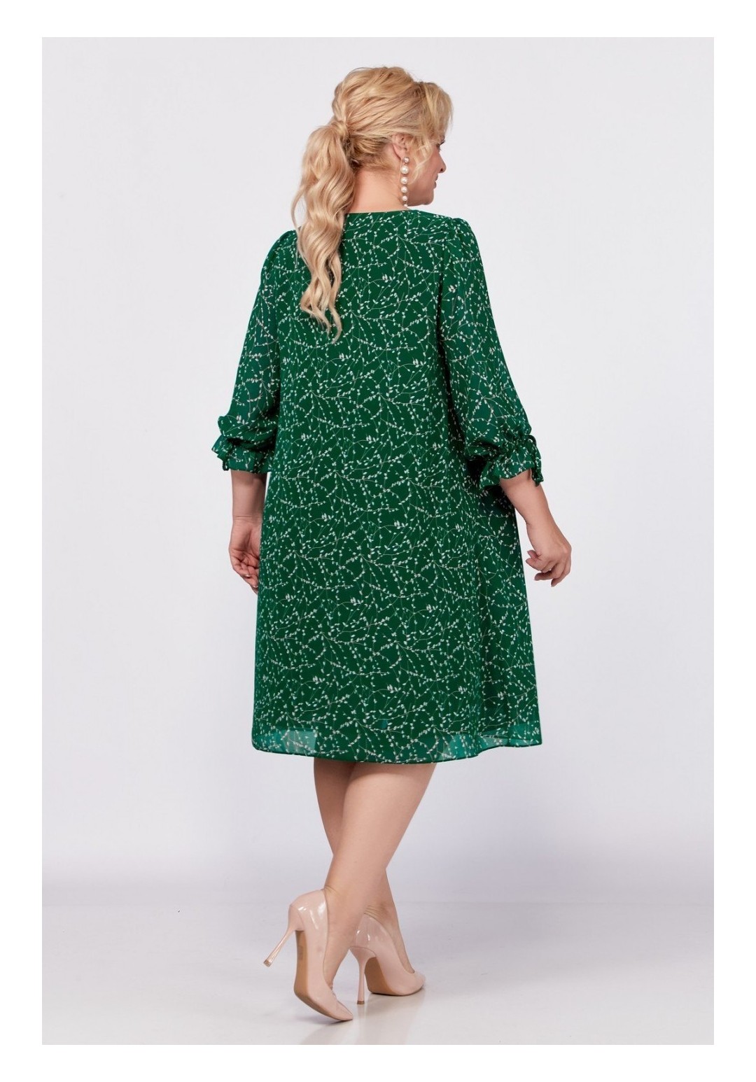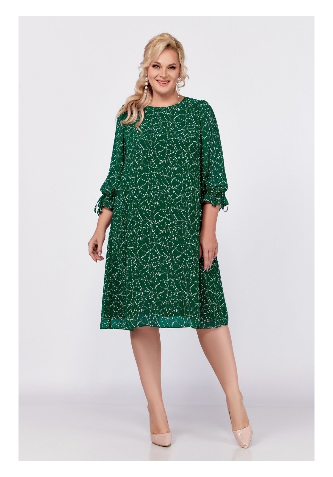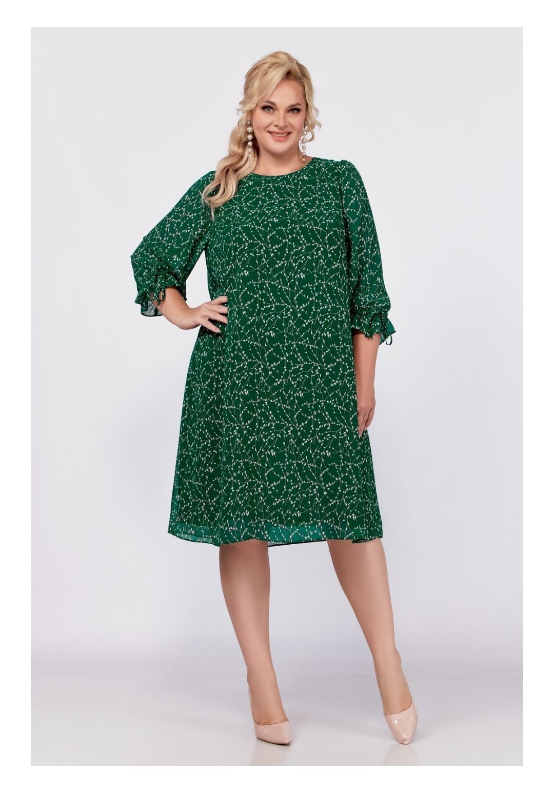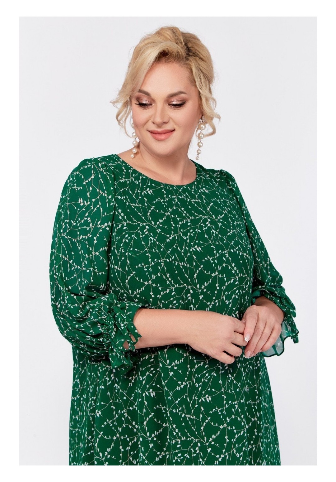 Платье А-силуэта, из струящейся шифоновой ткани на подкладке из шифона. По переду платья нагрудные выточки, выходящие из проймы, спинка цельная. Вырез горловины овальный. Рукав длиной 7/8, в нижней части кулиса с завязкой, которая регулирует ширину рукава и создаёт по низу рюшу. Длина платья по спинке 103 см.(+-1 см) Длина рукава регулируется завязкой.