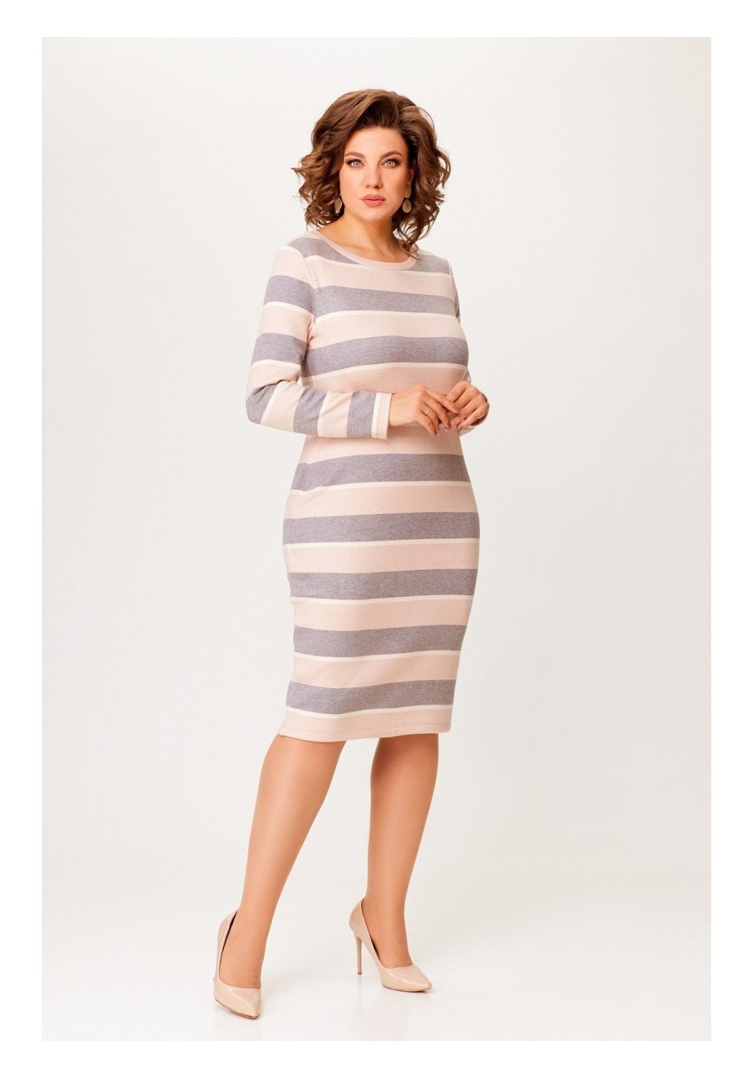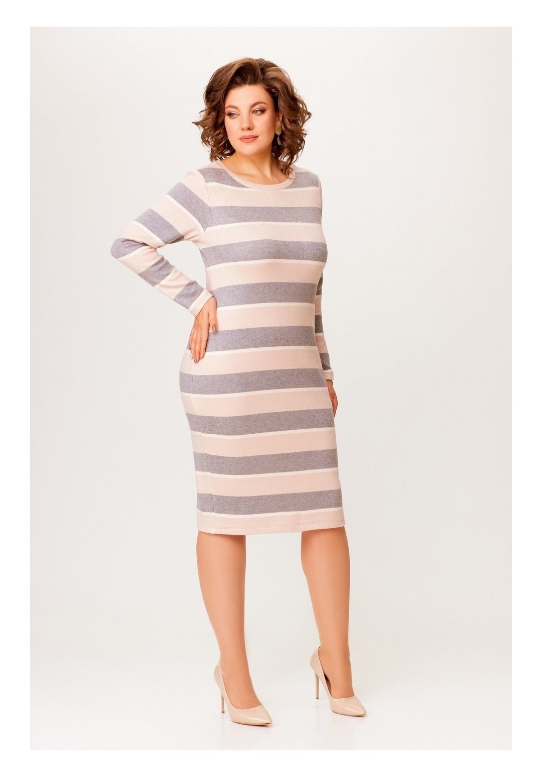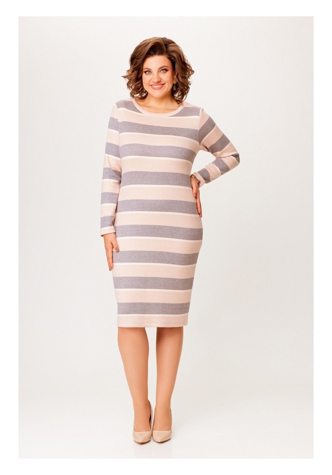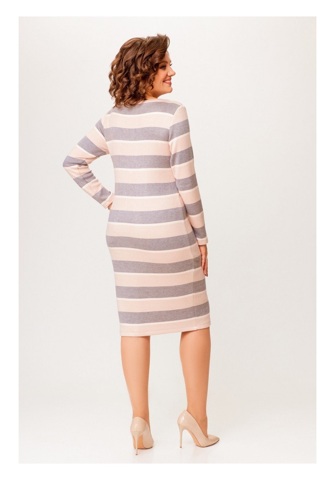 Платье из мягкой трикотажной ткани, прилегающего силуэта длины миди. Горловина круглая, обработана притачной планкой, рукав втачной, длинный. Длина по спинке 105 см. (+/-1 см.) Длина рукава 61 см. (+/- 1 см.)