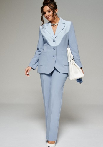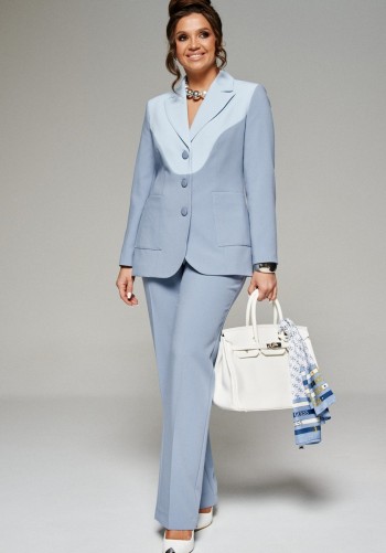 Платье из мягкой вискозной ткани, Х-образного силуэта с полуприлегающим лифом. Платье отрезное по линии талии. Перед лифа с вертикальными рельефами и застёжкой на петли и 4 декоративные пуговицы. Горловина V-образной формы, с отложными лацканами и воротником пиджачного типа. Спинка лифа с талиевыми выточками. Рукав втачной, длиной ¾, по низу манжет с разрезом. Застёжка в боковом шве на потайную тесьму молнию. В комплекте пояс из основной ткани с пряжкой, лацкан украшен отстёгивающейся брошью. Длина рукава – 43 см. Длина изделия по спинке – 102 см. (+/-1 см.)