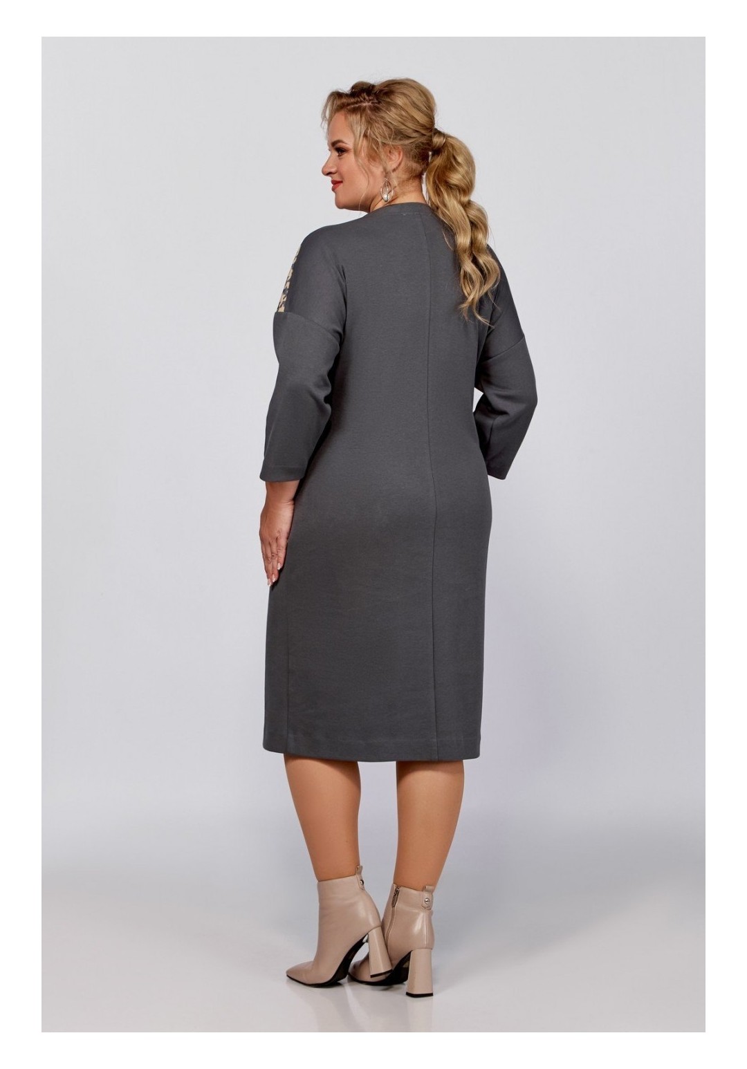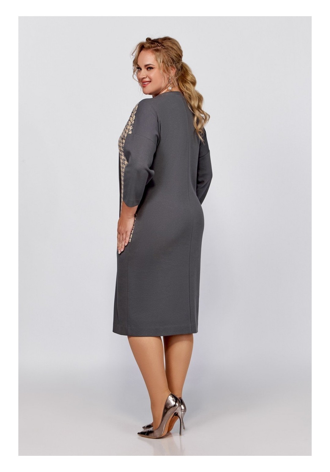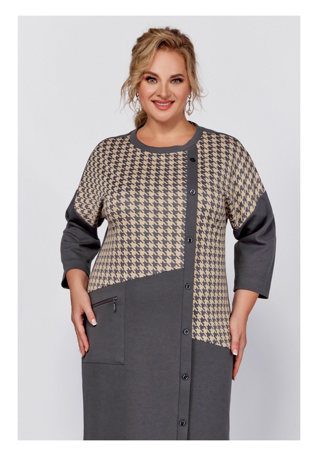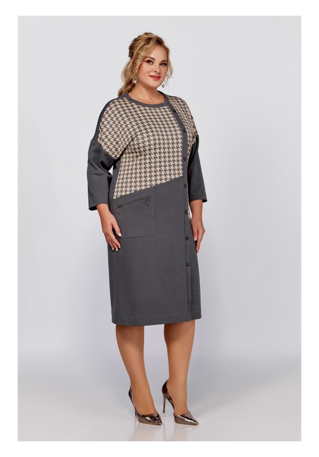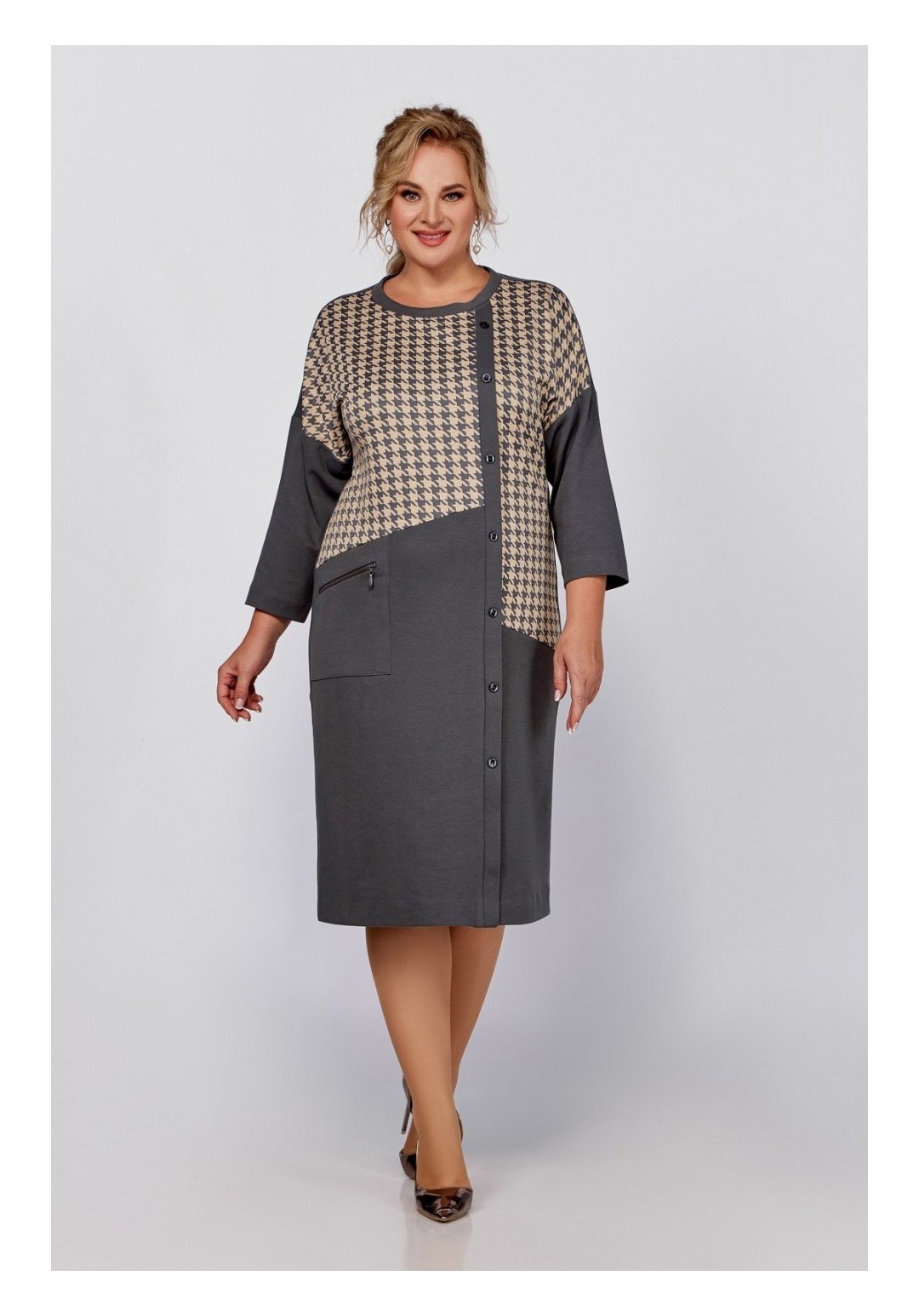 Платье прямого силуэта со спущенной линией плеча, скомбинировано из двух видов трикотажных полотен. Перед с косыми подрезами и смещённой от линии центра притачной планкой с декоративными пуговицами. В области бедра расположен накладной карман с функционирующей декоративной молнией. Спинка со средним швом. Пройма спущена, рукав длиной 7/8, горловина круглая. Длина платья по спинке: в размерах 56,58,60 – 107 (+/-1) см. в размерах 62,64,66 – 111 (+/-) см. Длина от верхней плечевой точки до низа рукава: В размерах 56,58, 60 - 60 (+/- 1) см В размерах 62,64,66 – 62(+/-1) см