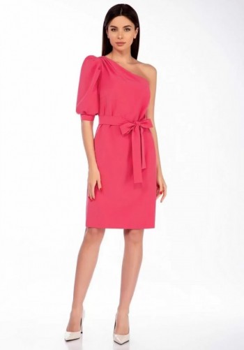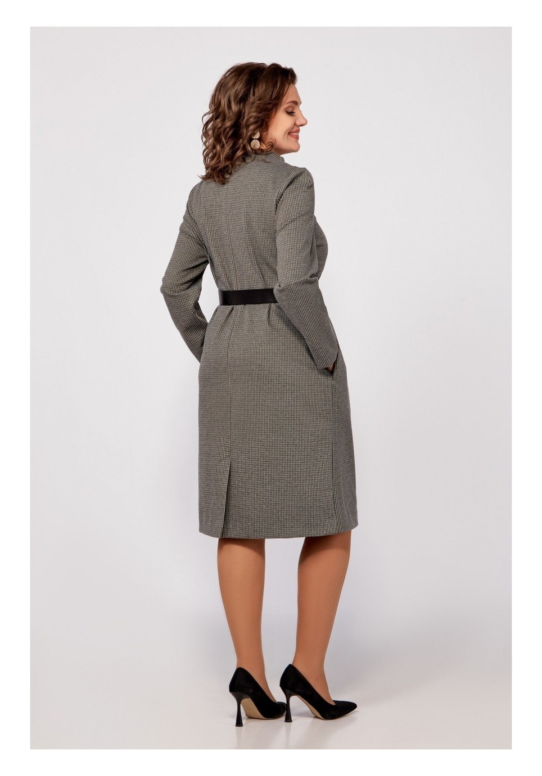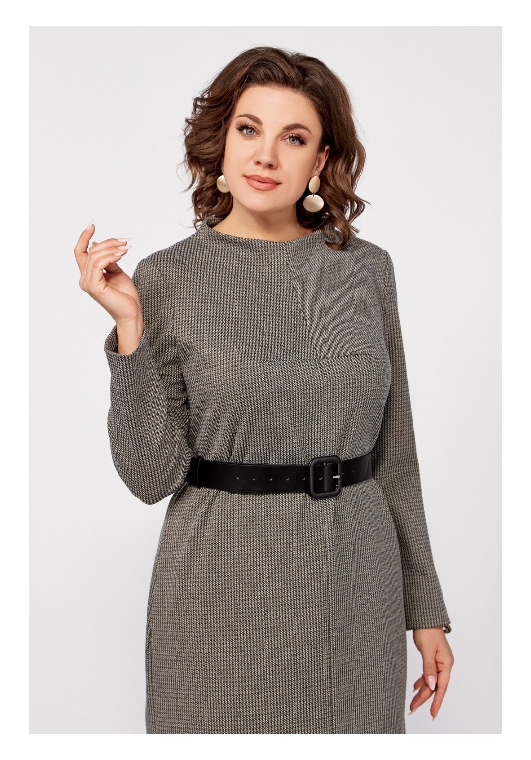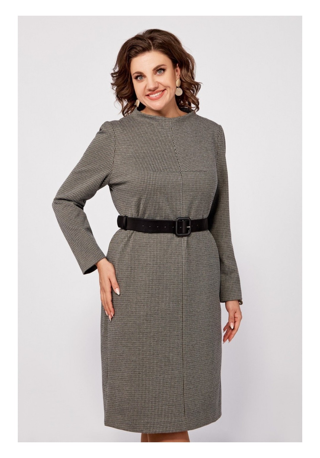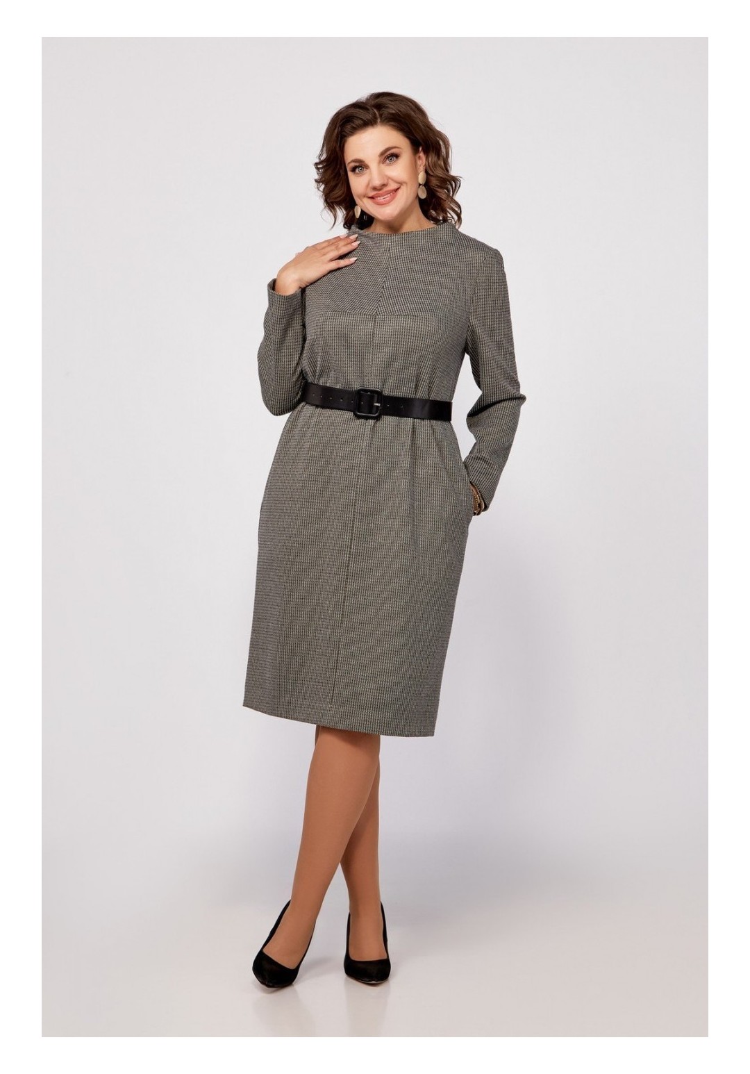 Платье из мягкого трикотажного полотна прямого силуэта. В боковых швах расположены карманы. Полочка с центральным швом и выходящими из него нагрудными выточками, по спинке средний шов с застёжкой на потайную тесьму-молнию и шлица. Горловина оформлена цельнокроеной стойкой, рукав втачной длиный. В комплекте ремень с декоративной пряжкой. Длина платья по спинке р.50,52,54 – 106 (+/-1) см., 56,58,60 – 110 (+/-1)см. Длина рукава – 61 см.
