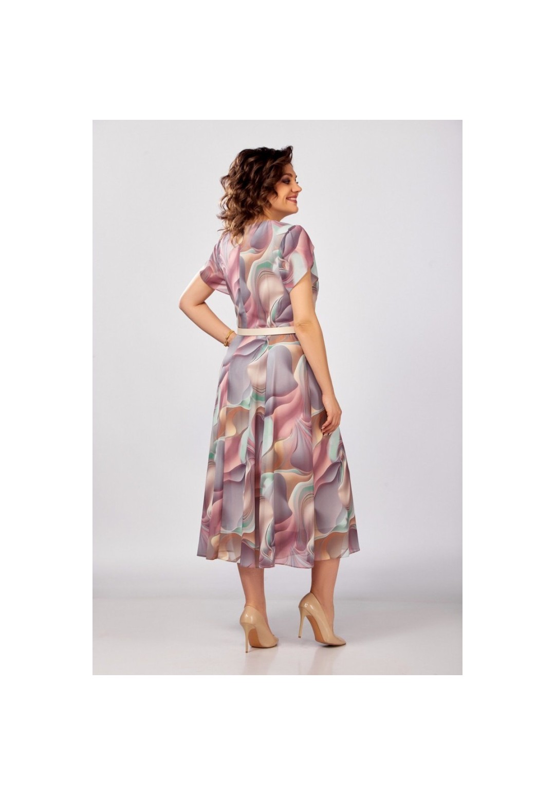 Платье из шифона на трикотажной подкладке, Х-образного силуэта с полуприлегающим лифом. Платье отрезное по линии талии. По переду лифа расположены рельефы, по спинке лифа талиевые выточки. Юбка расклешенная из шести клиньев со встречными складками по линии талии. В среднем шве спинки предусмотрена потайная тесьма- молния. Рукав втачной покроя тюльпан, длина рукава 15 см. В подарок ремень с декоративной пряжкой. Размер 64 комплектуется поясом из основной ткани. Длина изделия по спинке 120 см
