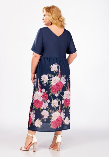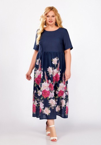 Платье полуприлегающего силуэта из мягкой поливискозной ткани с оригинальным дизайнерским принтом. По полочке выполнены рельефные швы, по спинке рельефные швы, средний шов со шлицей и застёжкой на потайную тесьму-молнию. Горловина круглая, обработана обтачкой. Рукав втачной, короткий. Длина платья по спинке – 101(+/-1) см. Длина рукава – 22(+/-1) см.