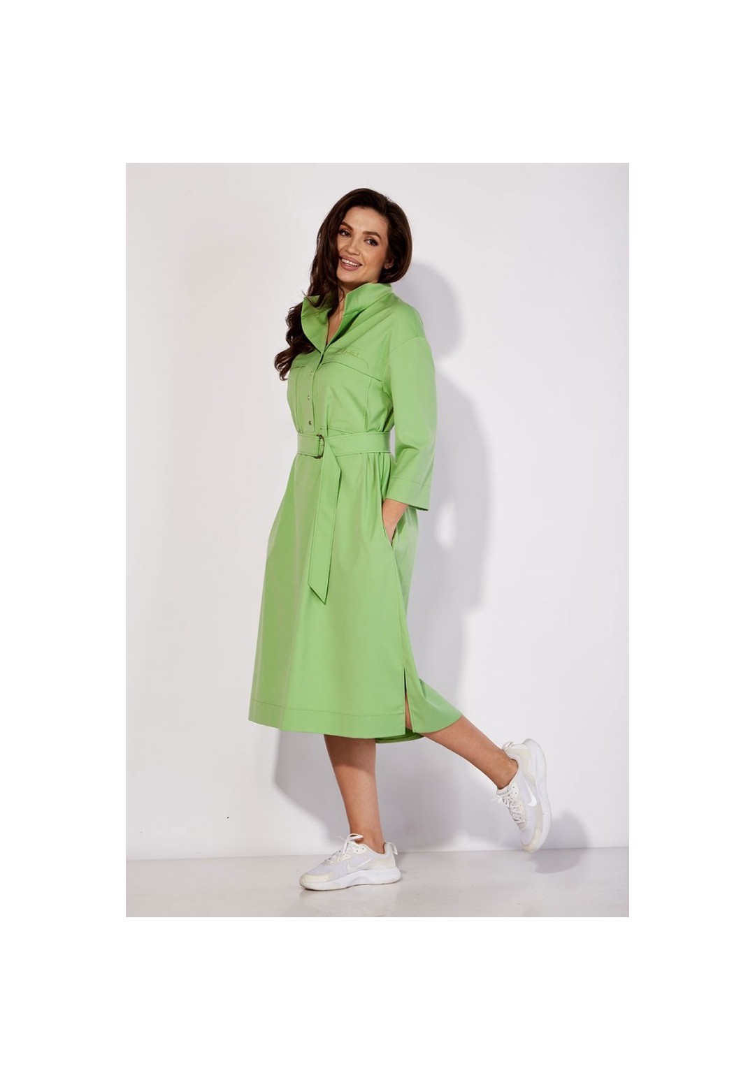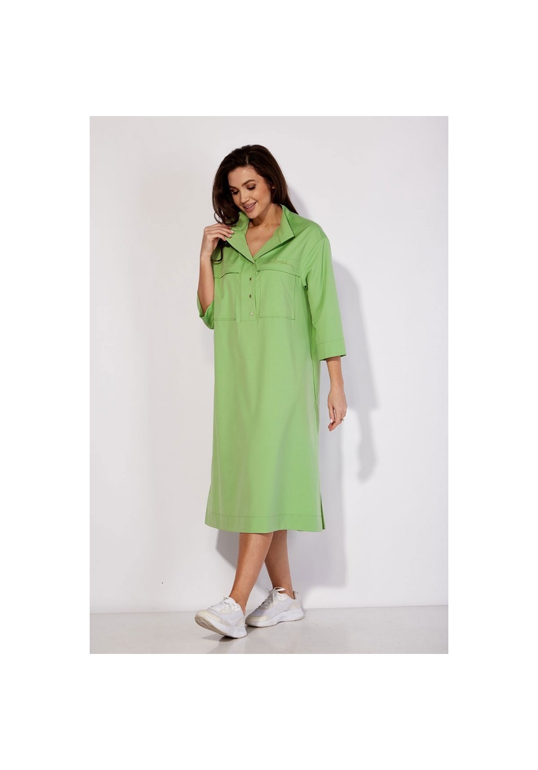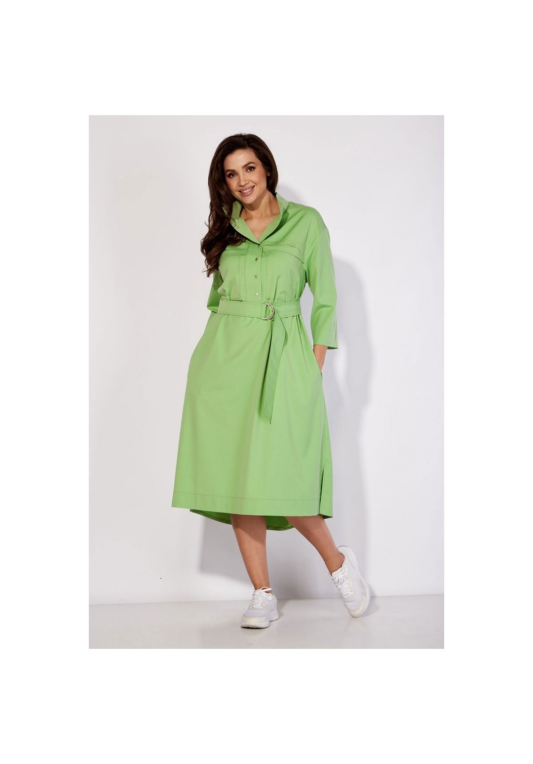Платье-рубашка свободного силуэта, с рукавом длинной 3/4. Рукав со спущенной линией плеча. По переду кокетка, с отлетной складкой и накладными карманами. На складке- декор вышивка. Горловина оформлена стойкой. Застежка на широкую планку с кнопками. В боковых швах функциональные карманы. По спинке кокетка и мягкая встрачная складка. По бокам разрезы. Низ платья разноуровневый (сзади длиннее) Талию подчеркивает съемный пояс с пряжкой из полукольц.