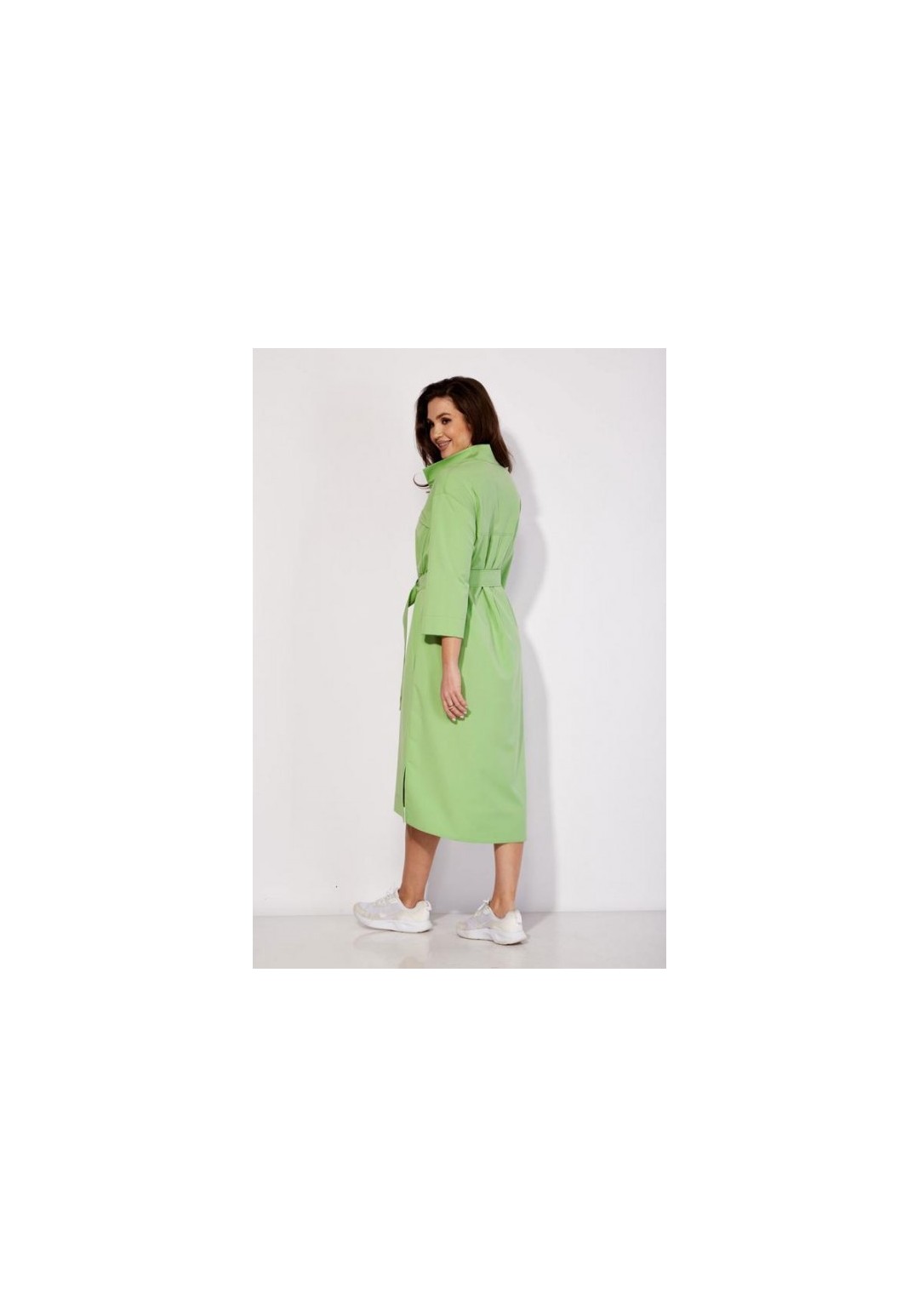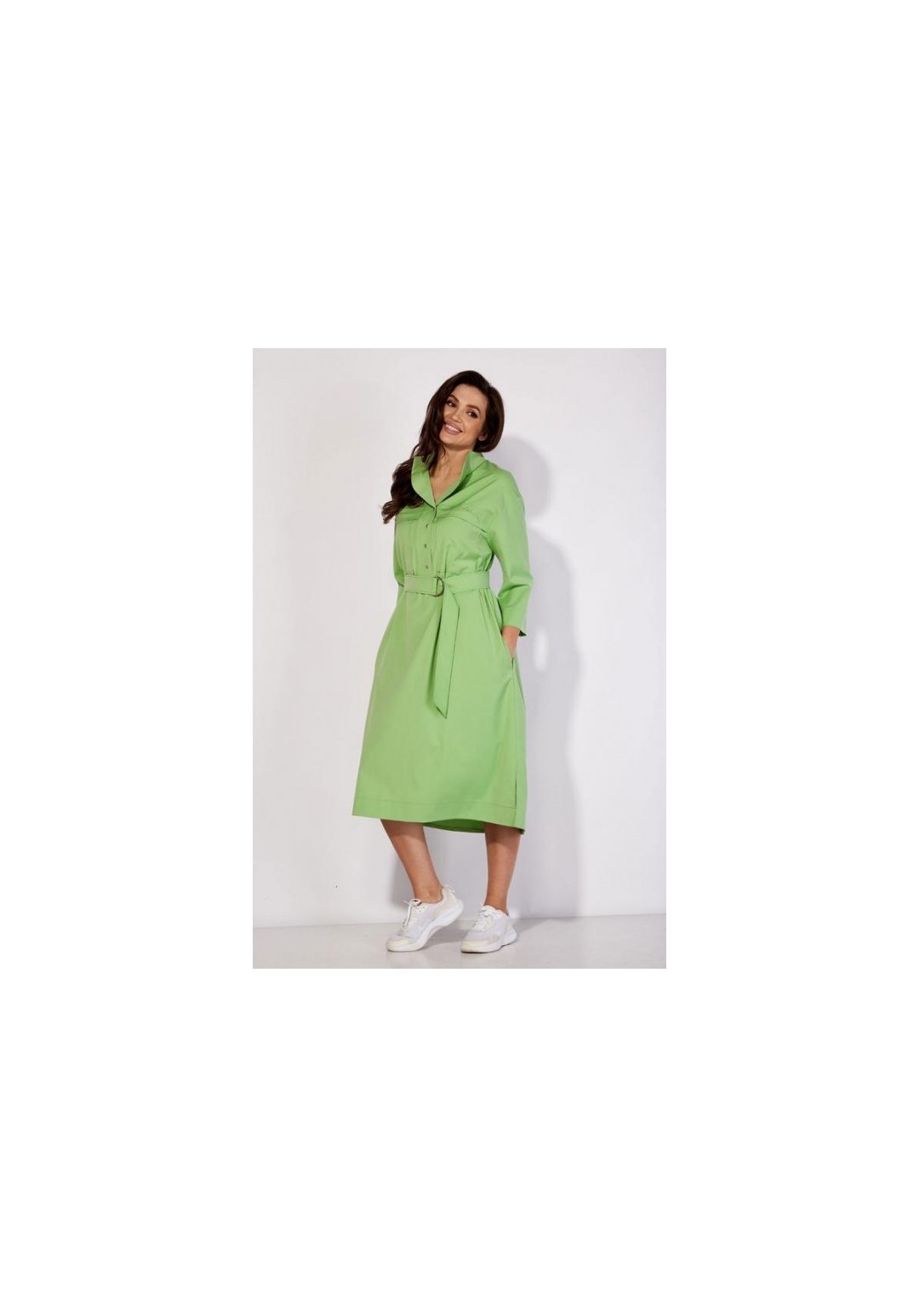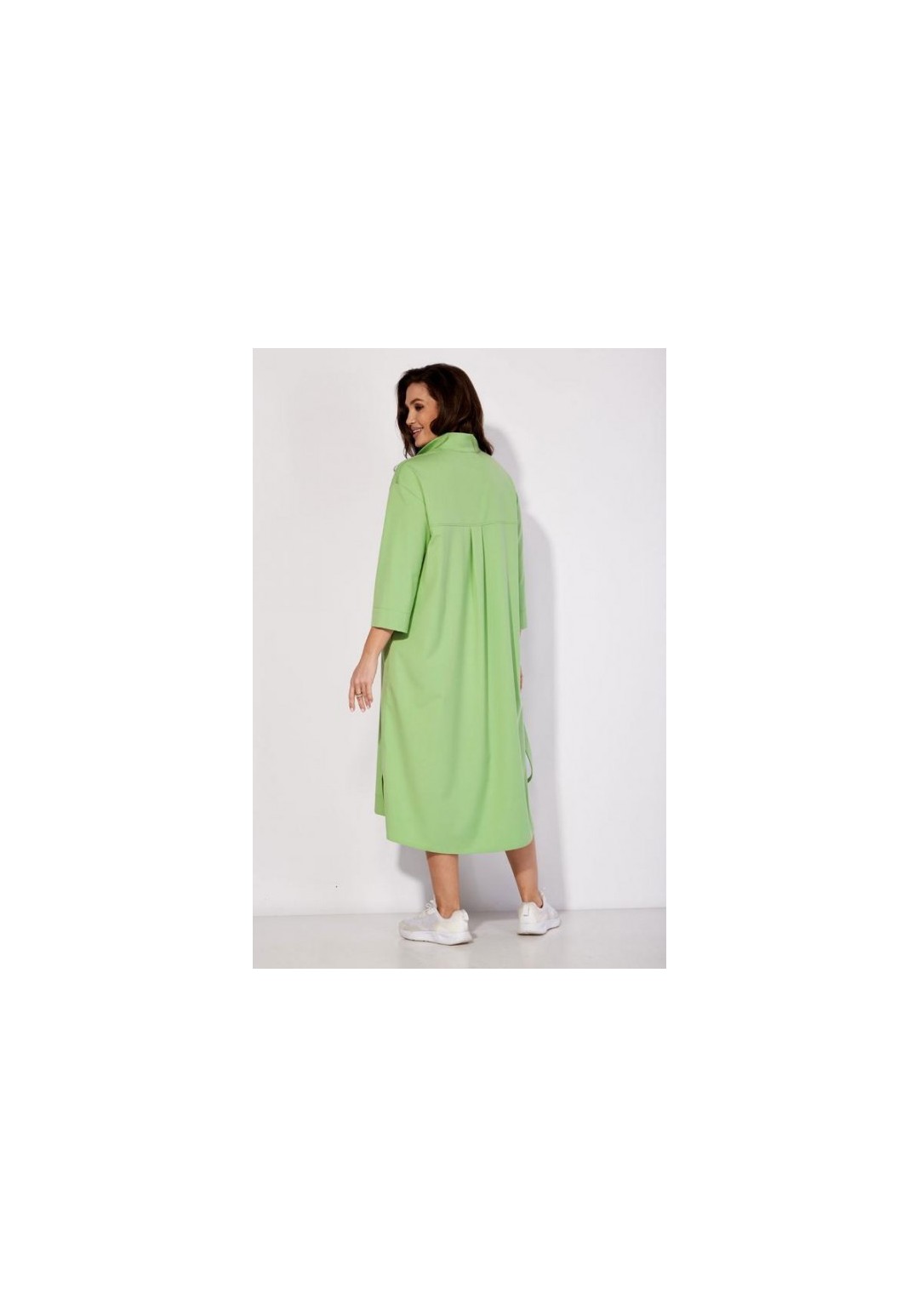 Платье-рубашка свободного силуэта, с рукавом длинной 3/4. Рукав со спущенной линией плеча. По переду кокетка, с отлетной складкой и накладными карманами. На складке- декор вышивка. Горловина оформлена стойкой. Застежка на широкую планку с кнопками. В боковых швах функциональные карманы. По спинке кокетка и мягкая встрачная складка. По бокам разрезы. Низ платья разноуровневый (сзади длиннее) Талию подчеркивает съемный пояс с пряжкой из полукольц.